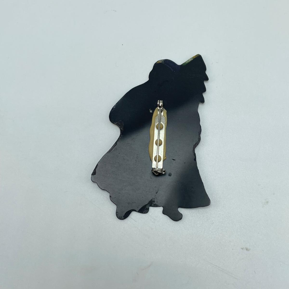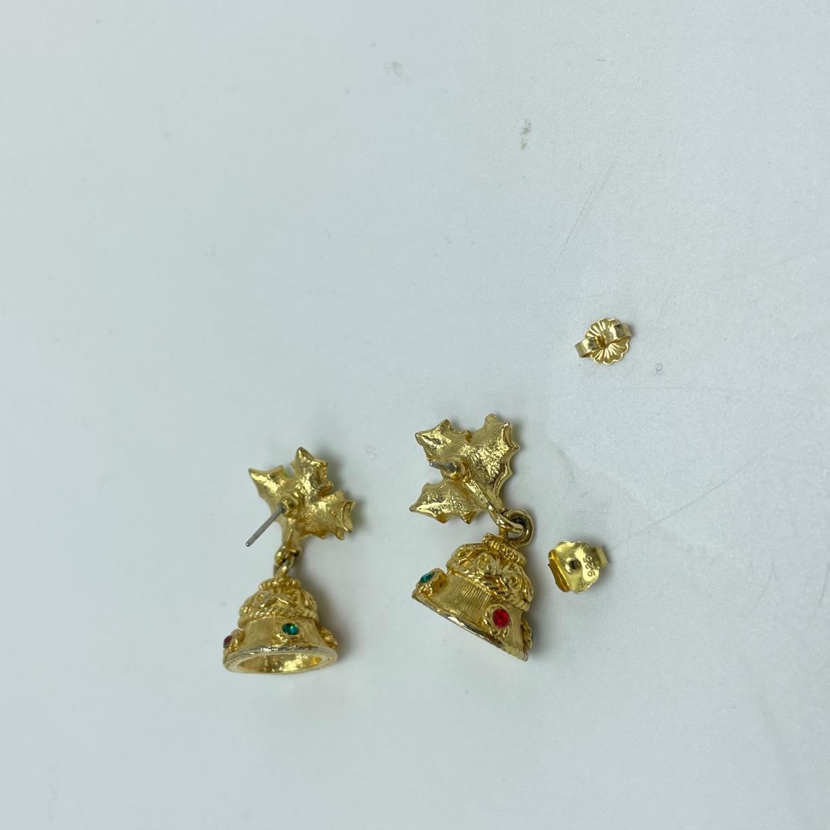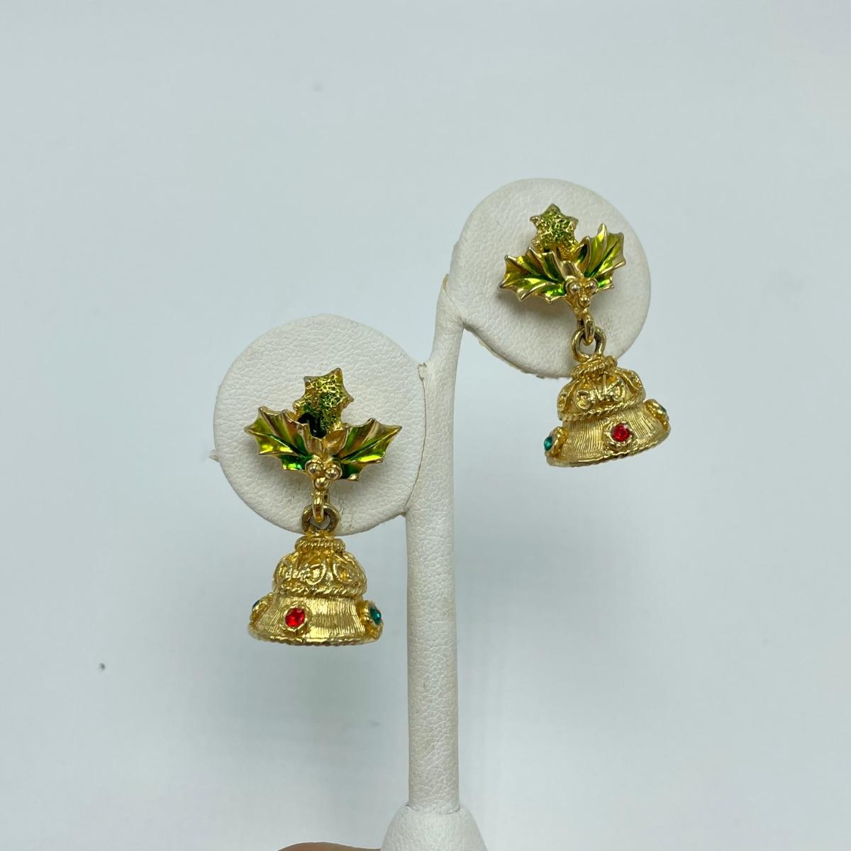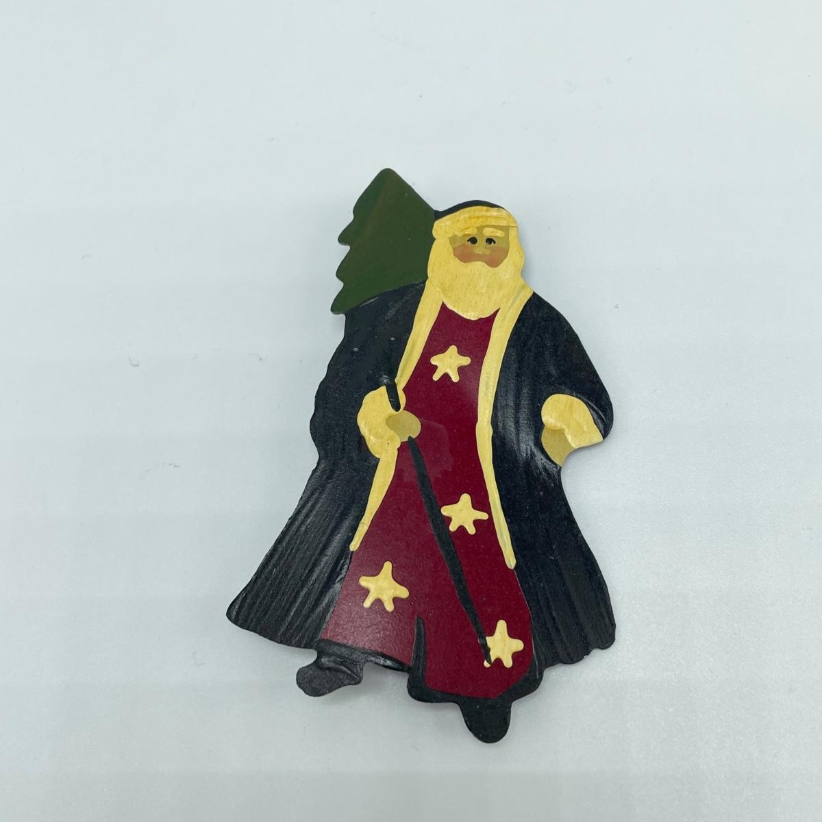 Hand painted Santa brooch, piece appears to be on a sheet of plastic-like material. Lot also offers a pair of gold colored Christmas bell earrings with green and red gems and painted mistletoe leaves. See images. Shipping available.