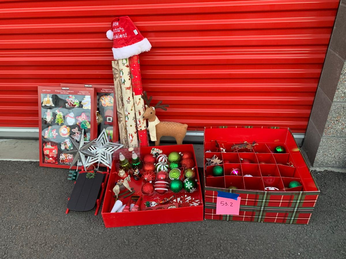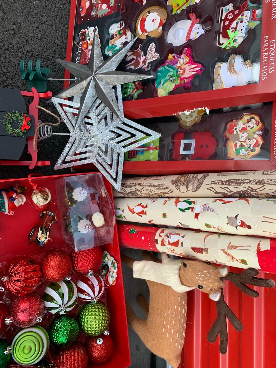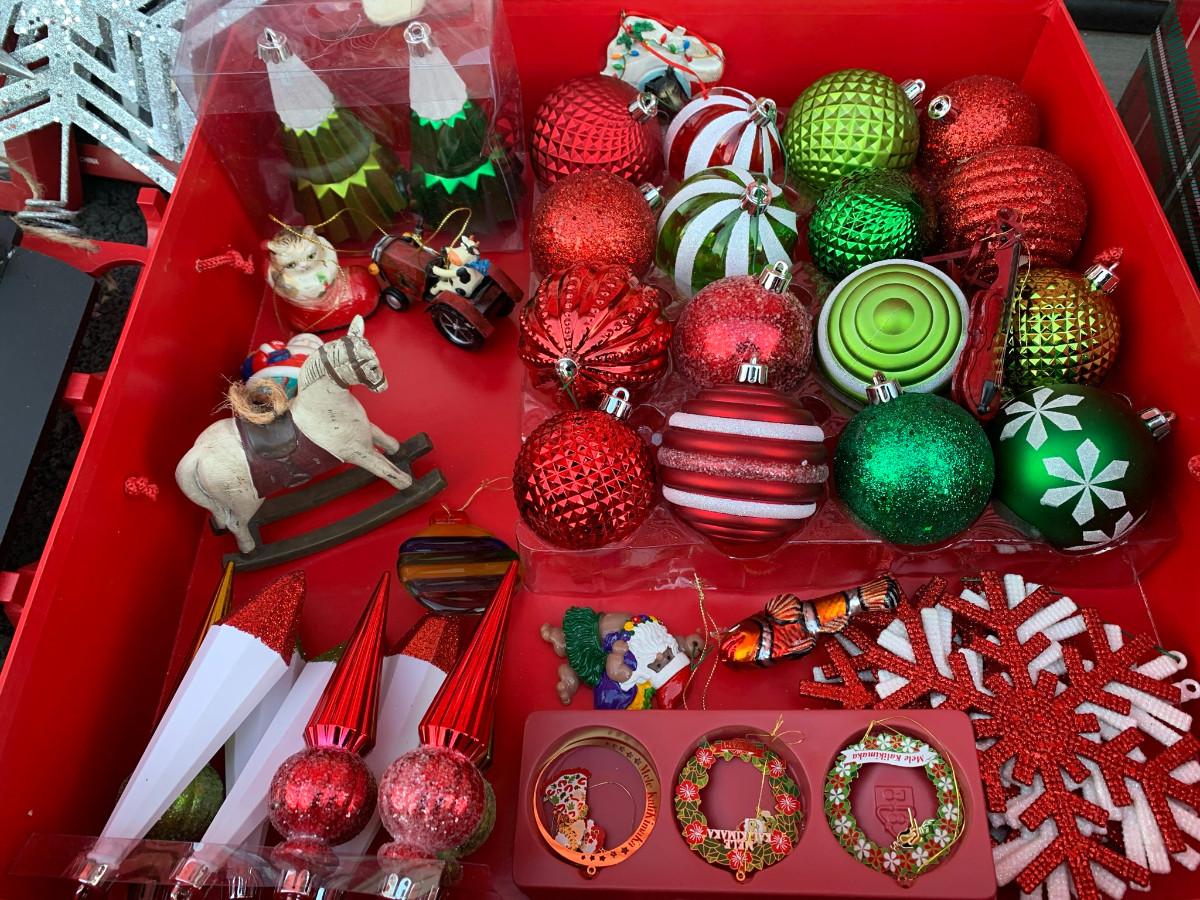 2 tag boxes (one half full), wrapping paper, soft reindeer, hat for dog, sled chaulk board, lots of ornaments, two start tree toppers