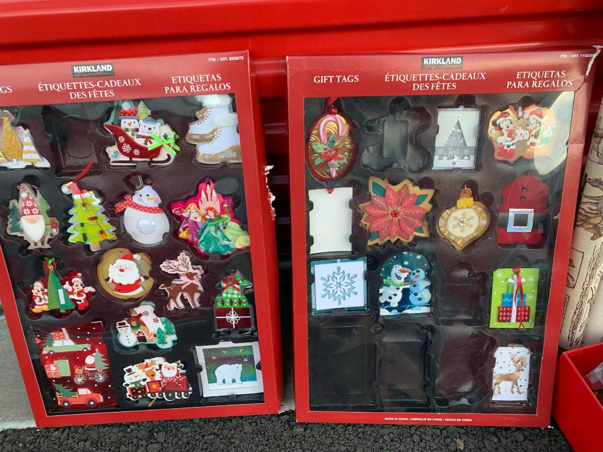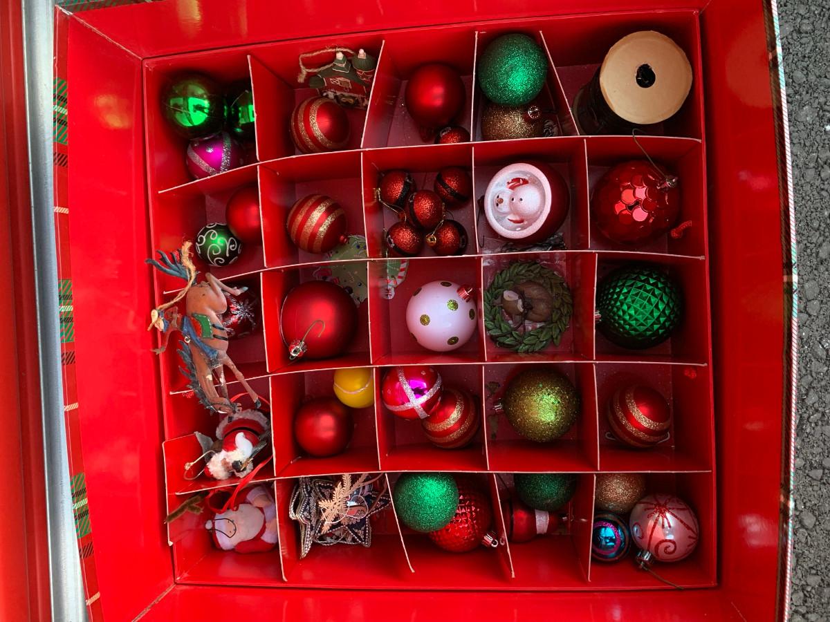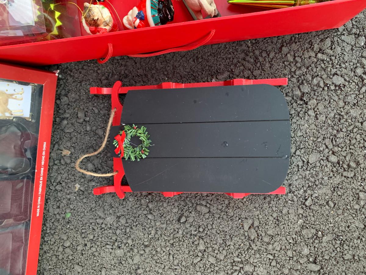 2 tag boxes (one half full), wrapping paper, soft reindeer, hat for dog, sled chaulk board, lots of ornaments, two start tree toppers