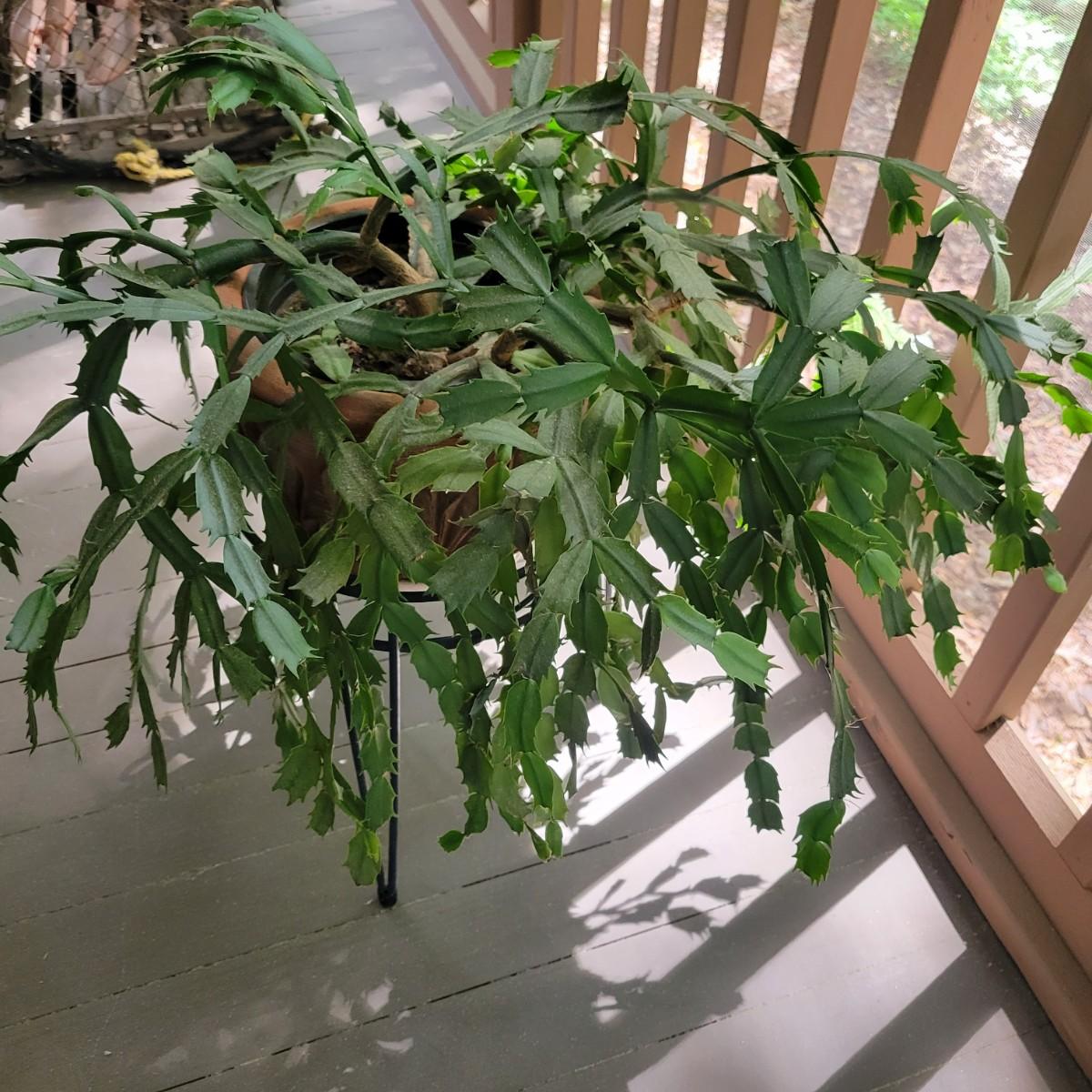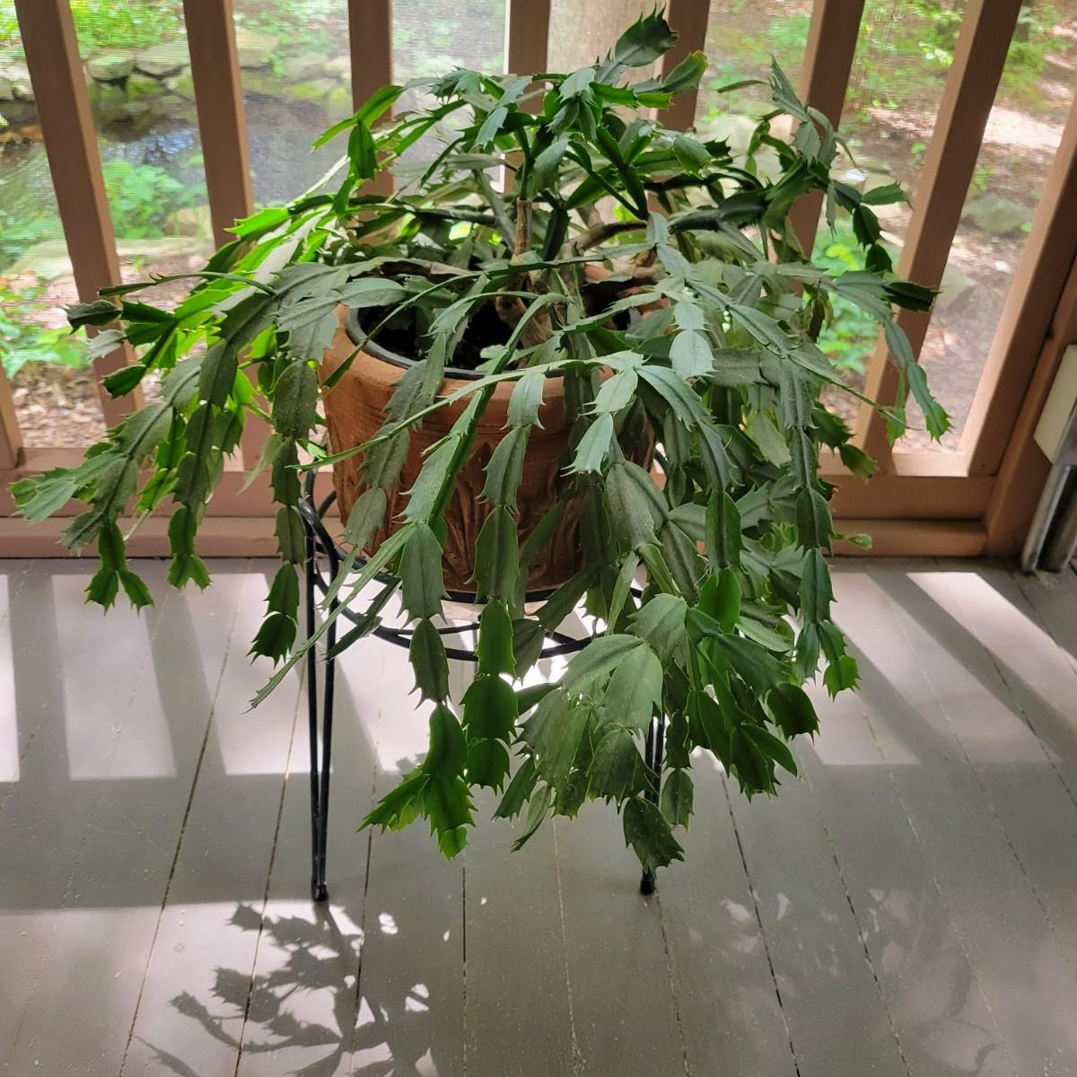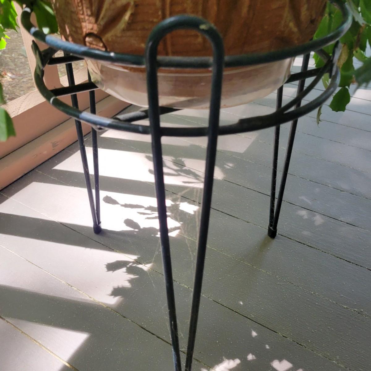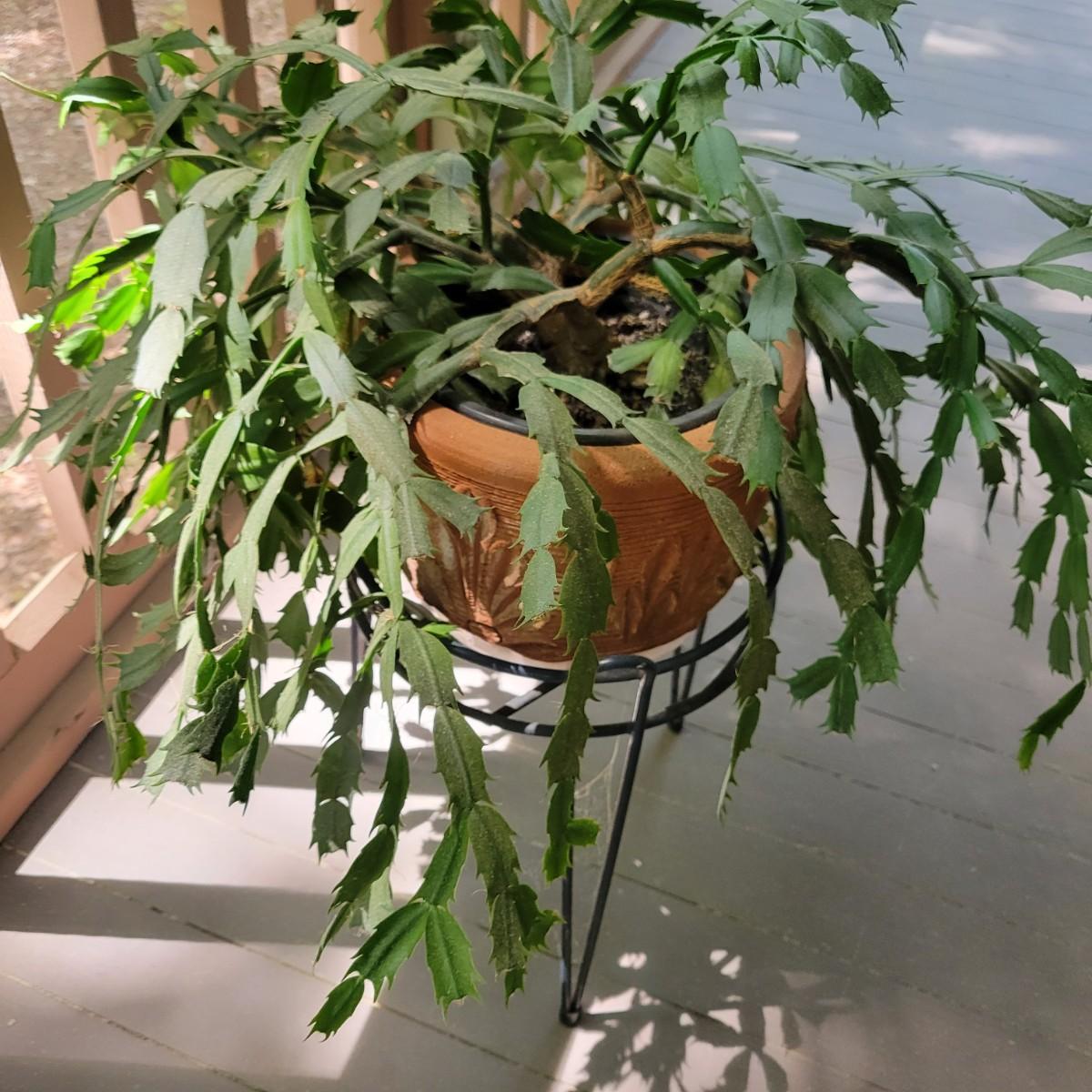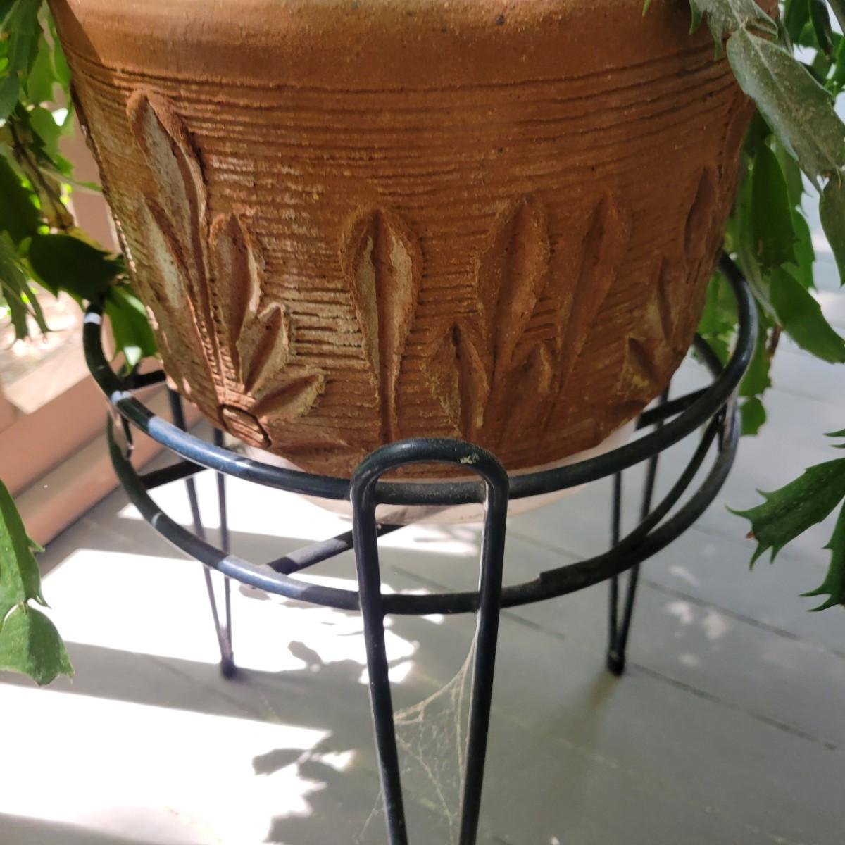 A metal plant stand and unglazed pottery pot. Also includes a healthy Christmas or Thanksgiving cactus. The planter and stand measure approximately 10.5"D x 15"H. Local pickup only