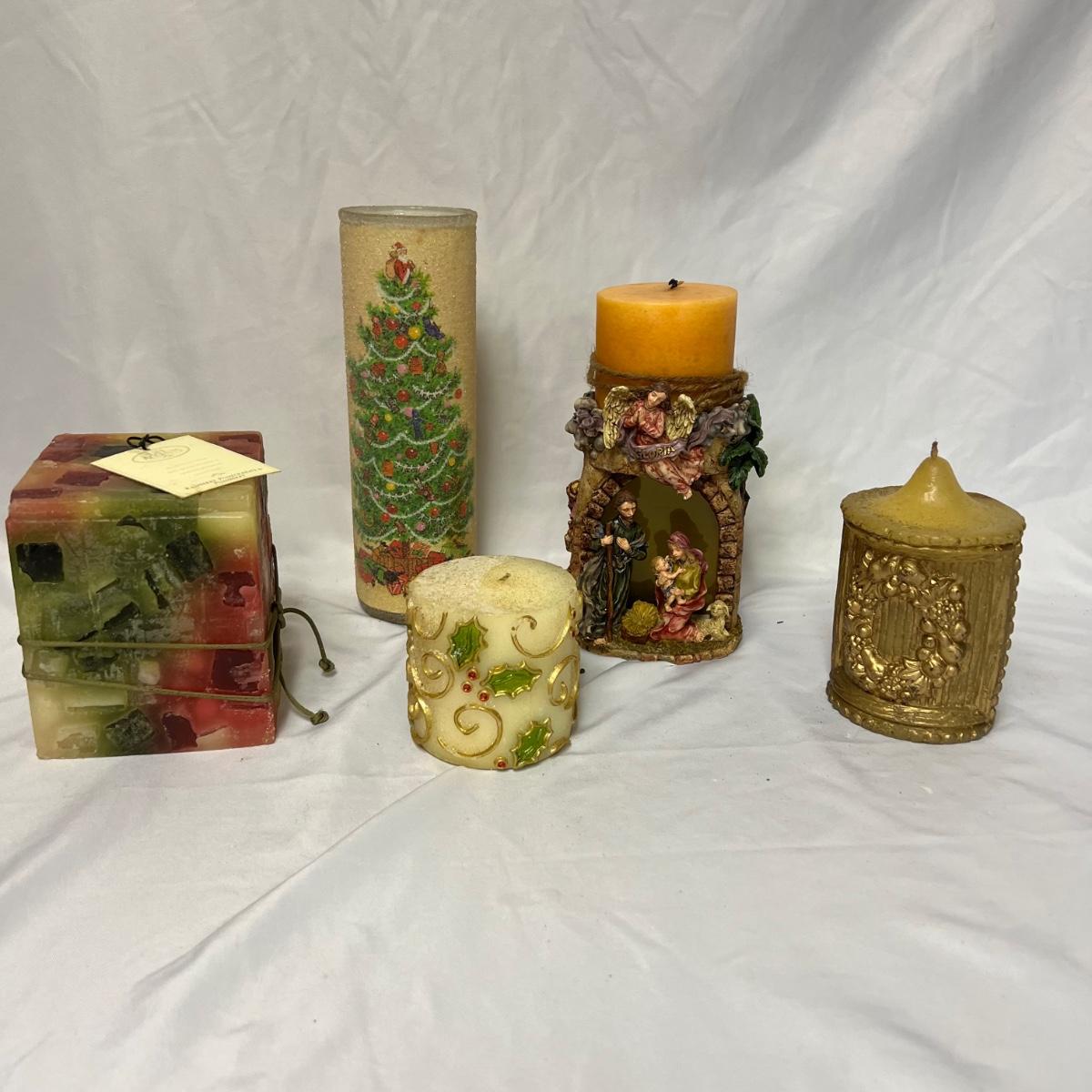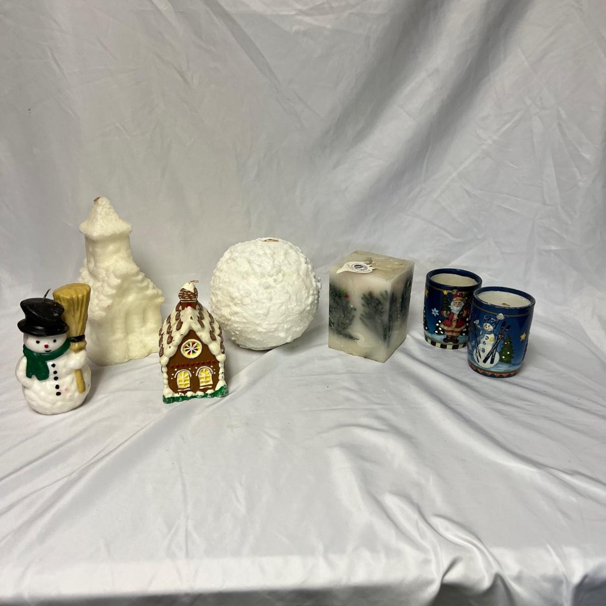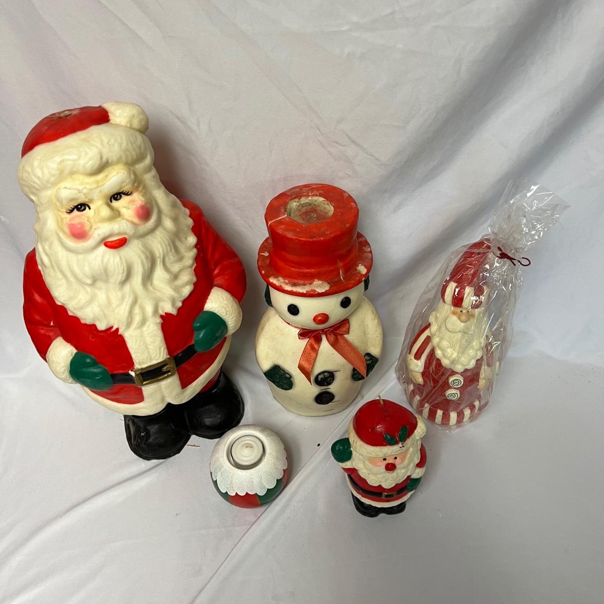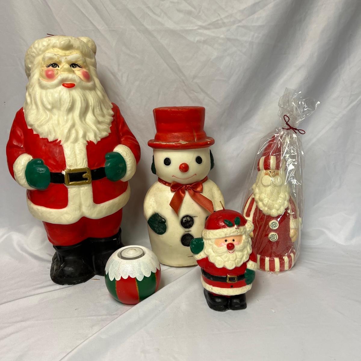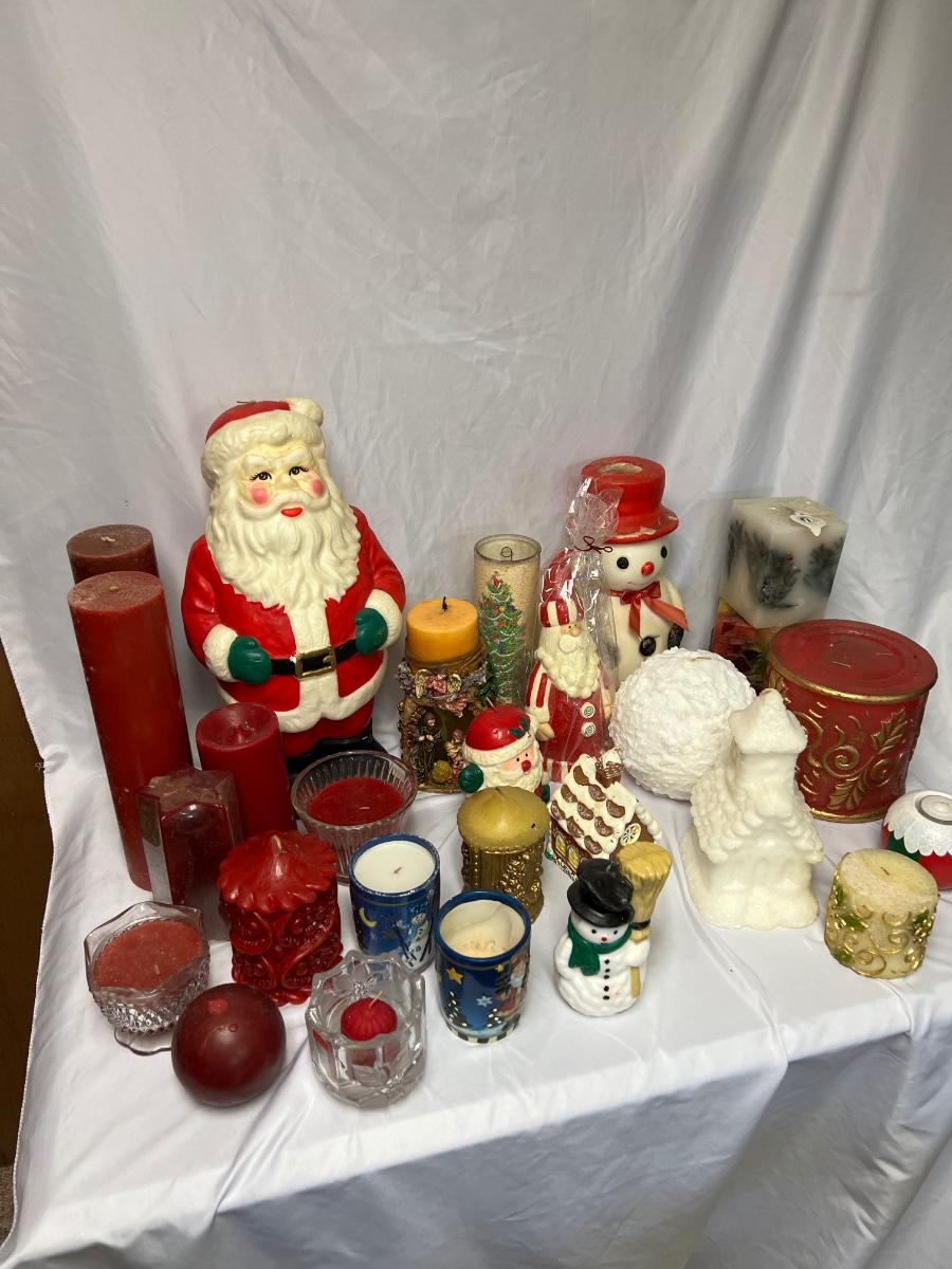 You’ll never have to buy Christmas candles again! (Twenty-seven in all!) Many of them never used and several of them lovely sculptures as well as solid red for table and mantel. Lot includes 66Qt. Holiday storage bin as shown. Santa candle measures approximately 16" tall.