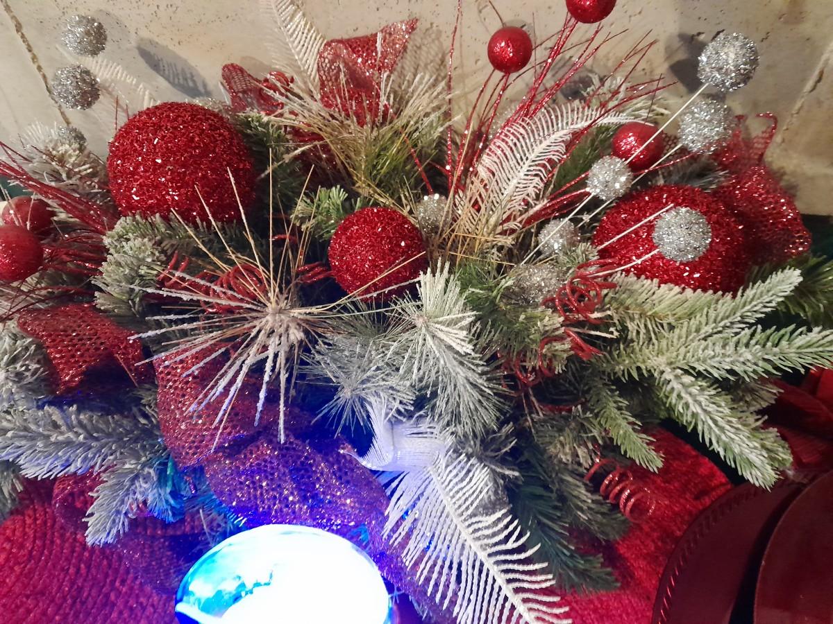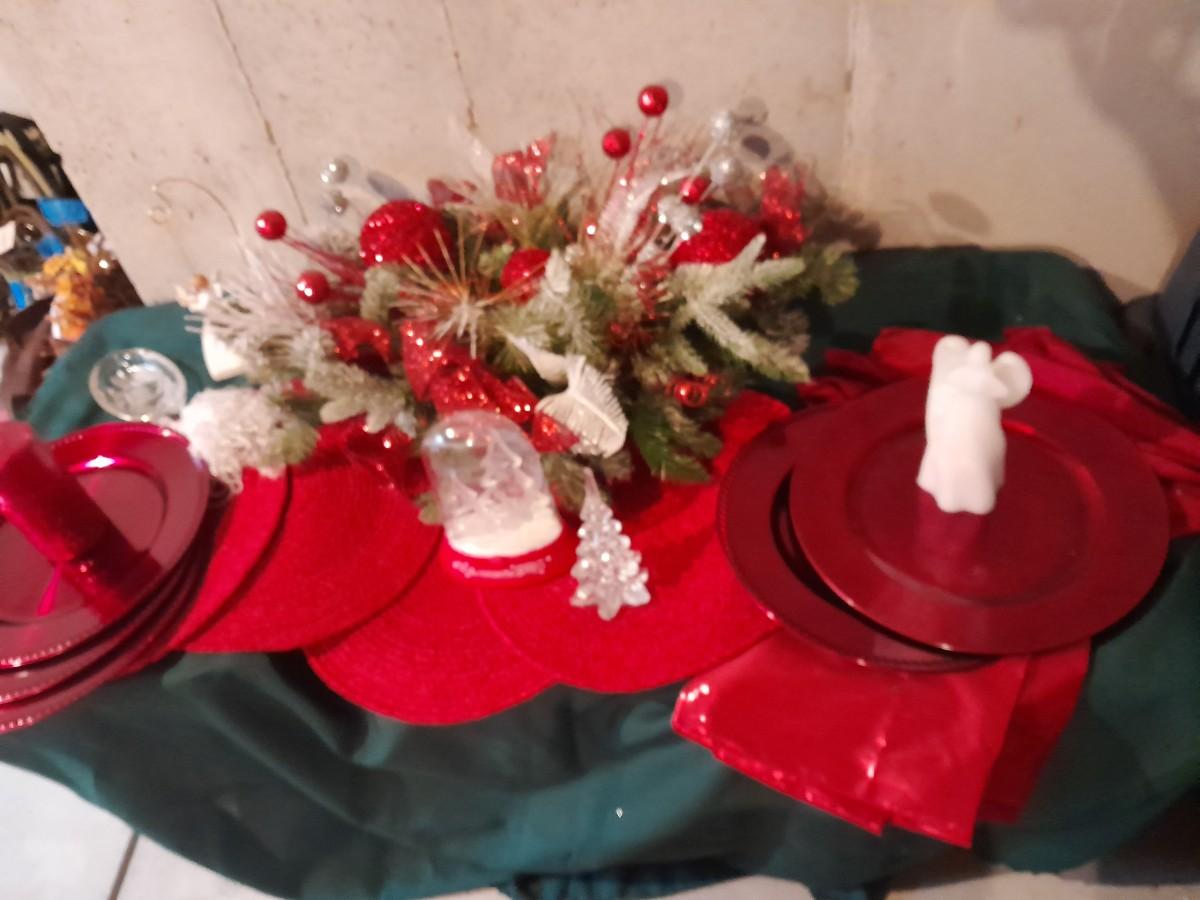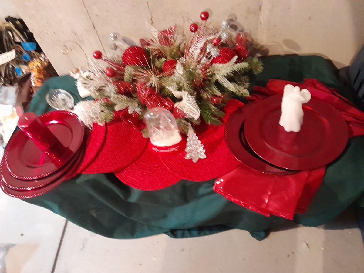 CHRISTMAS CENTERPIECE WITH LIGHT UP DECOR, RED PLATTERS, AND MORE