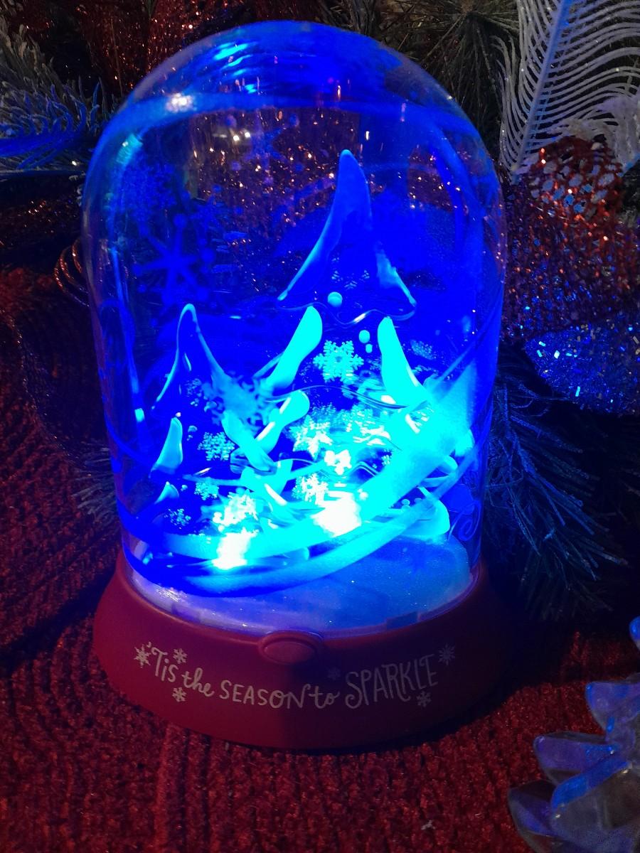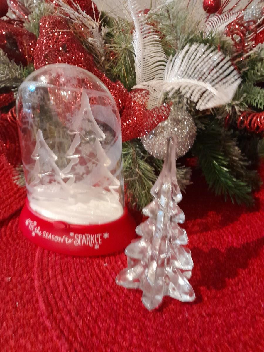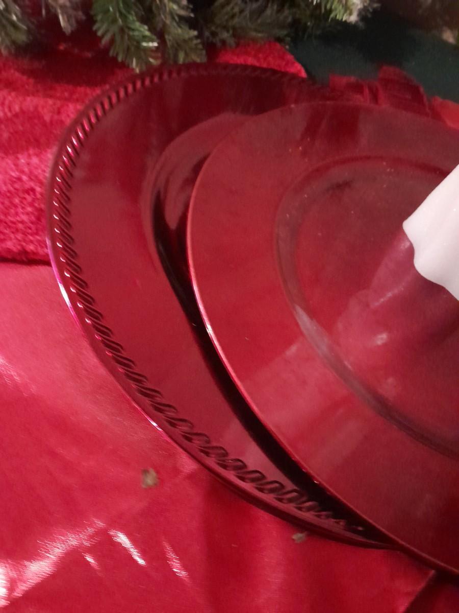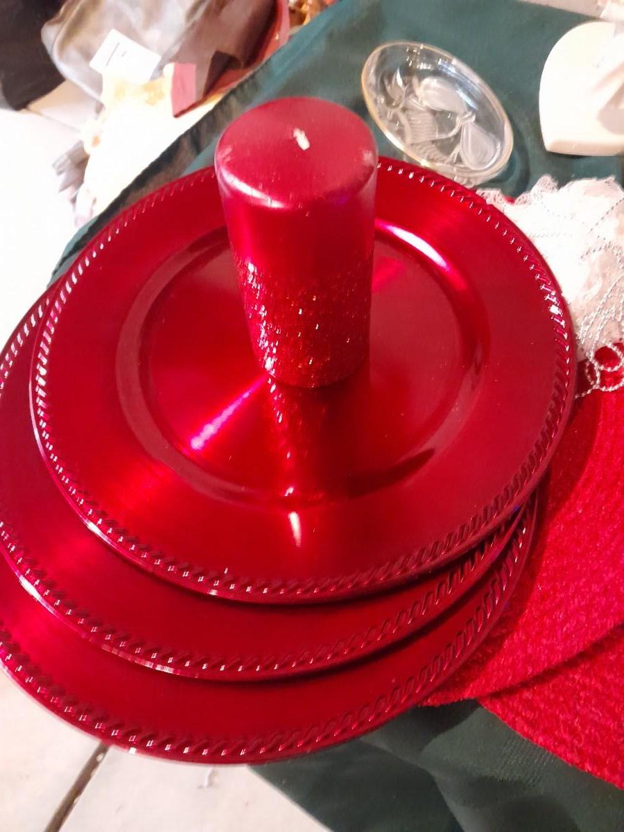 CHRISTMAS CENTERPIECE WITH LIGHT UP DECOR, RED PLATTERS, AND MORE