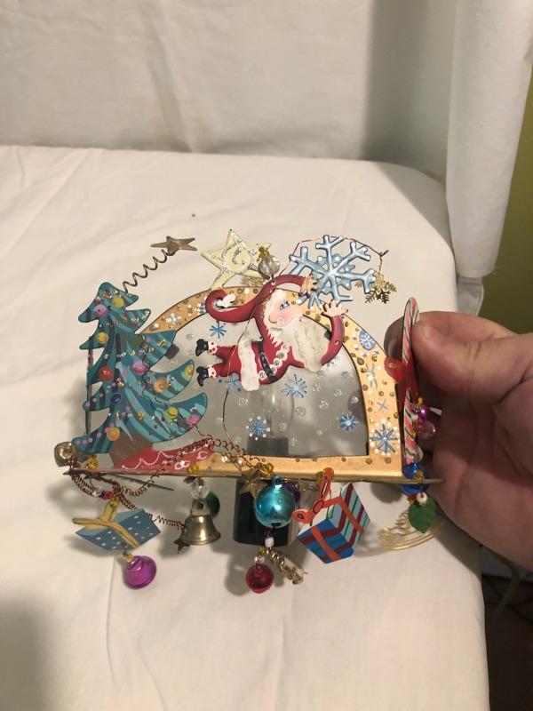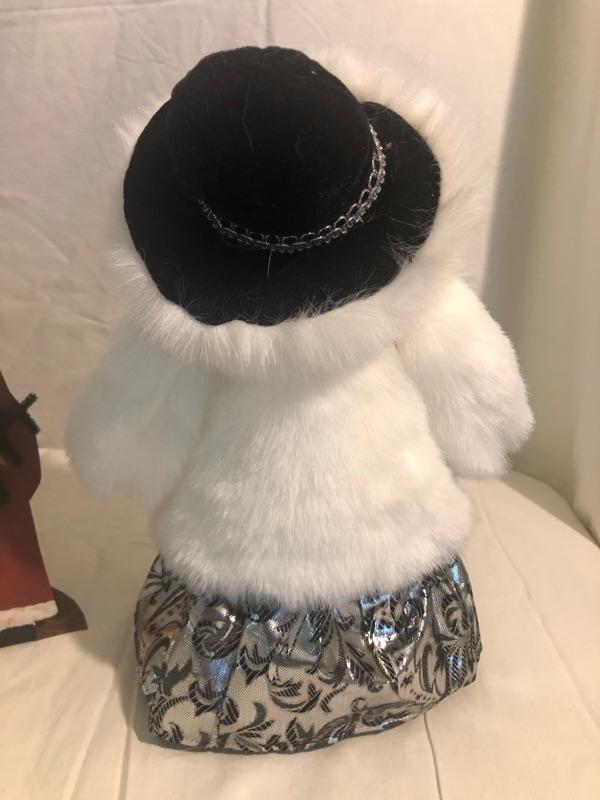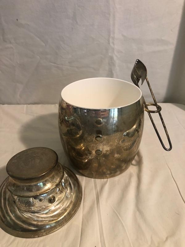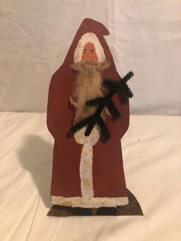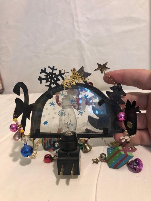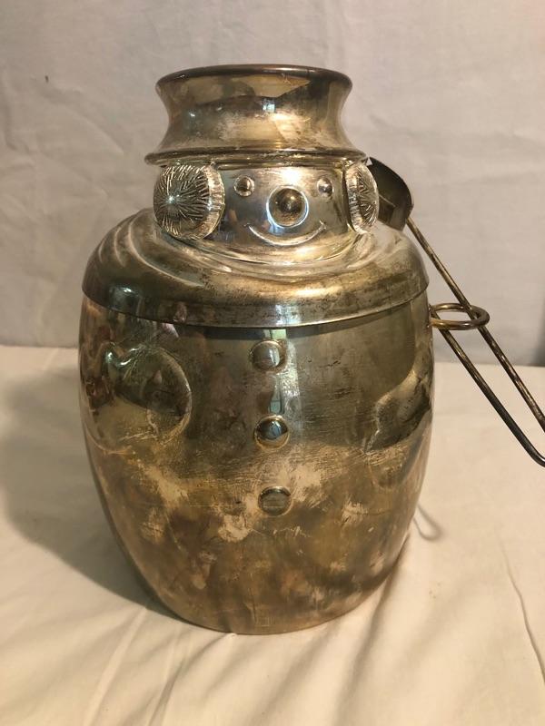 Plush Snowman Dressed in Fur and Hat, Antique Metal Santa, Silver-plated Snowman Ice Bucket, whimsical Night light and heavy Noel Gift Box Ice bucket is 10 in tall, Plush sown man is 14 in tall, antique santa is 8 in tall, box is 14.5x10x4.5, nightlight is 5 in wide
