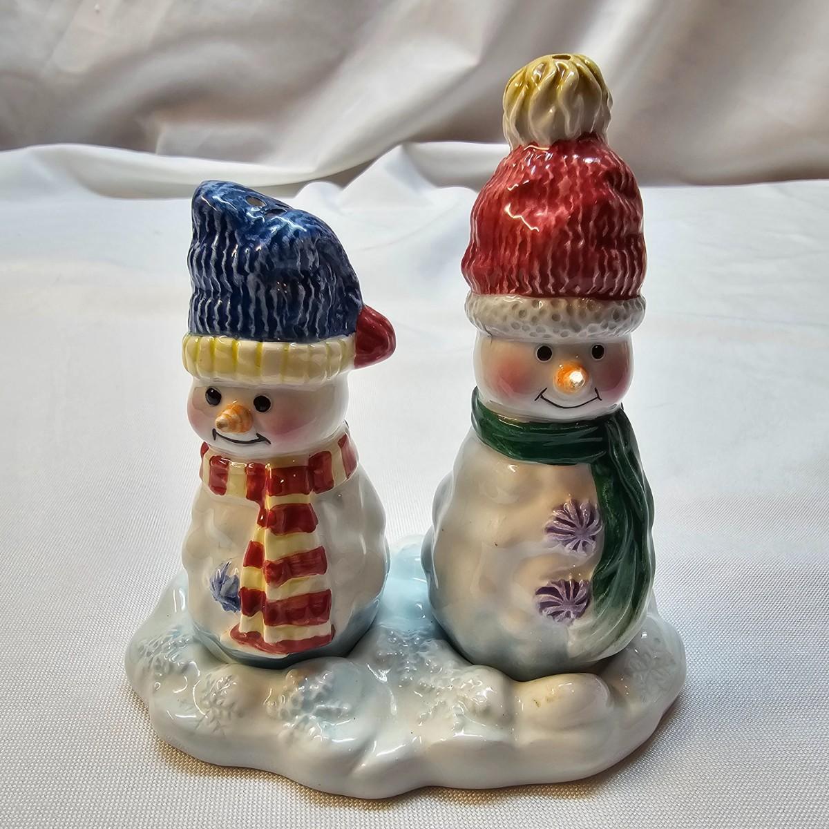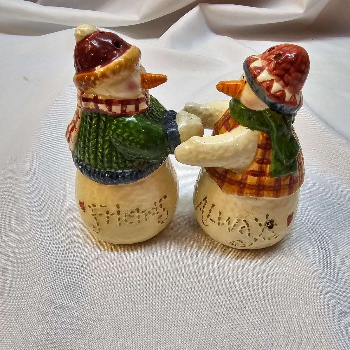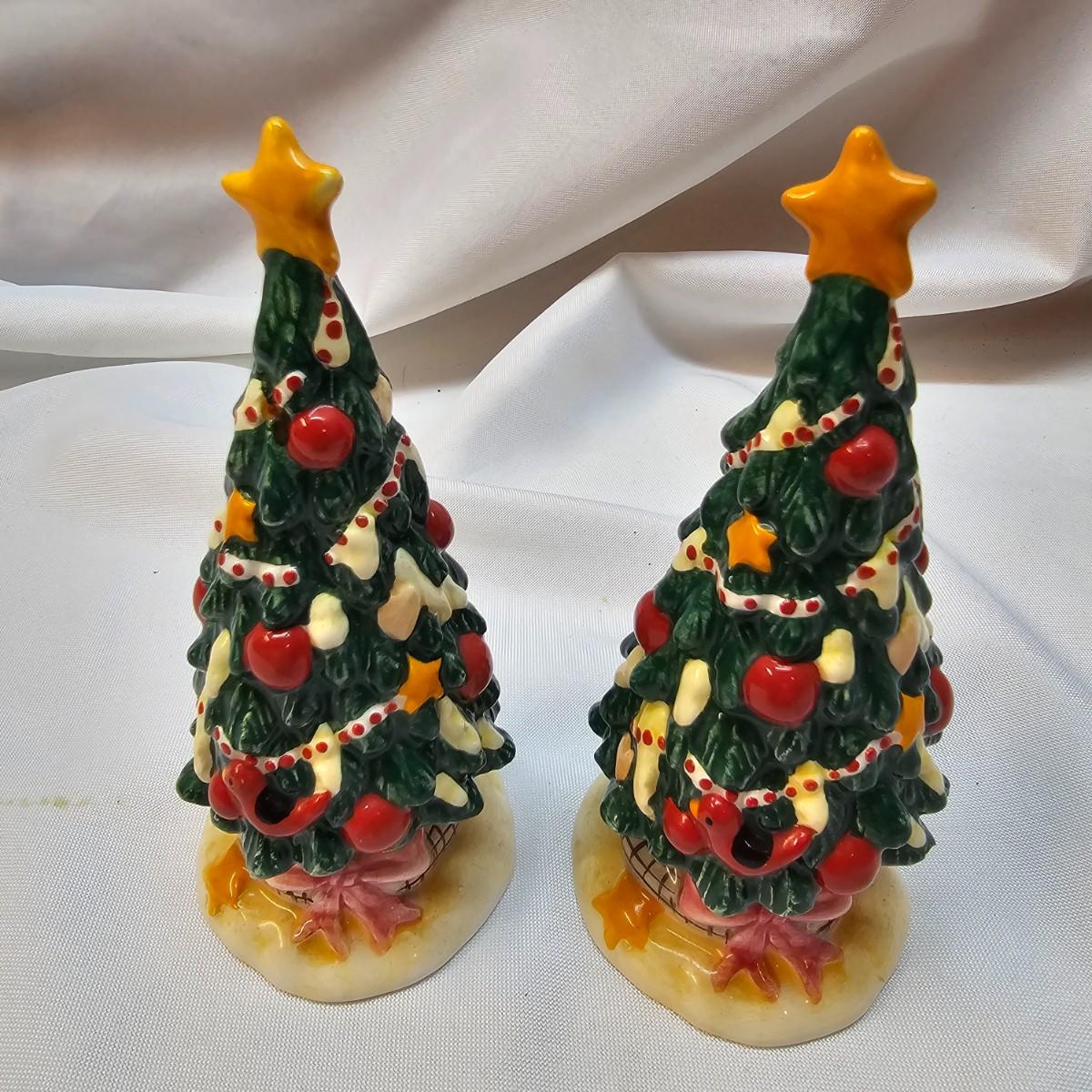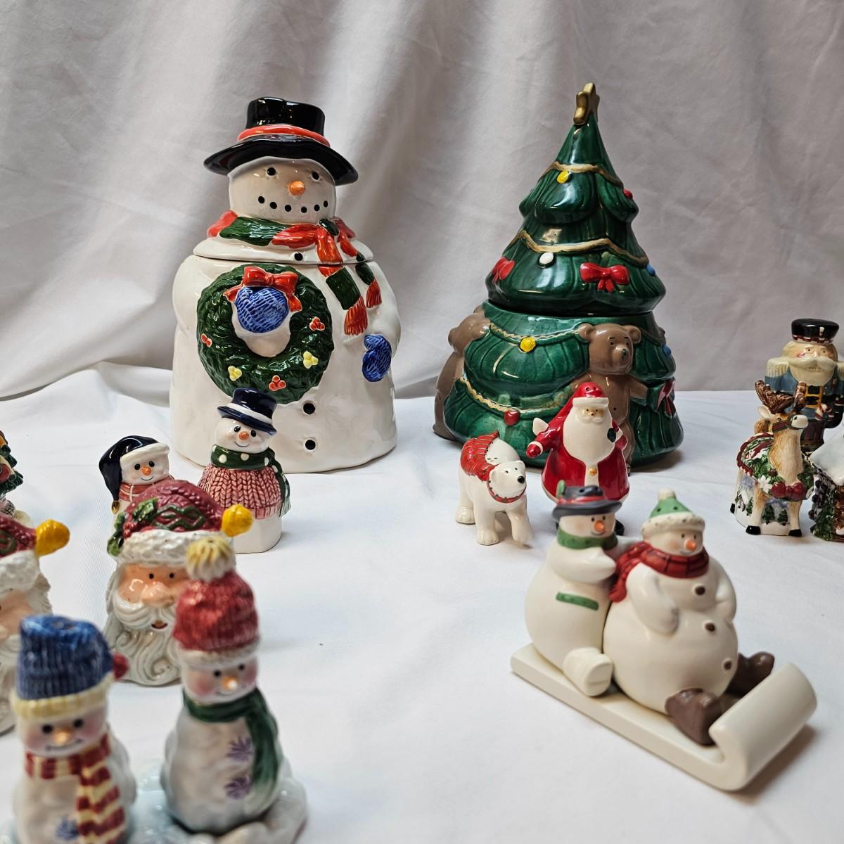 Two festive cookie jars, one snowman and one tree. Both pieces are ceramic, the snowman isc7" x 7" x 10"H, the tree is 7" x 7" x 11"H. Also included, eleven sets of holiday themed salt & pepper shaker sets. Santa, Rudolph, snowmen, houses, trees, each one unique on it's own. See photos for details. Shipping available.