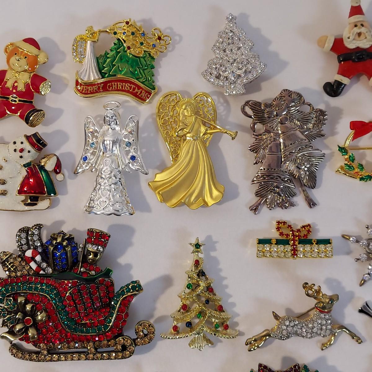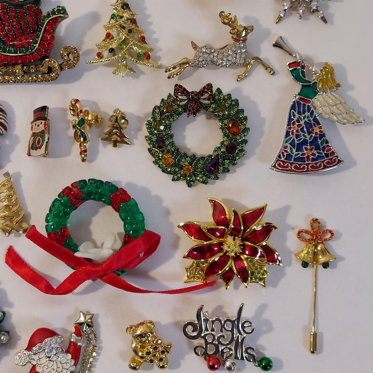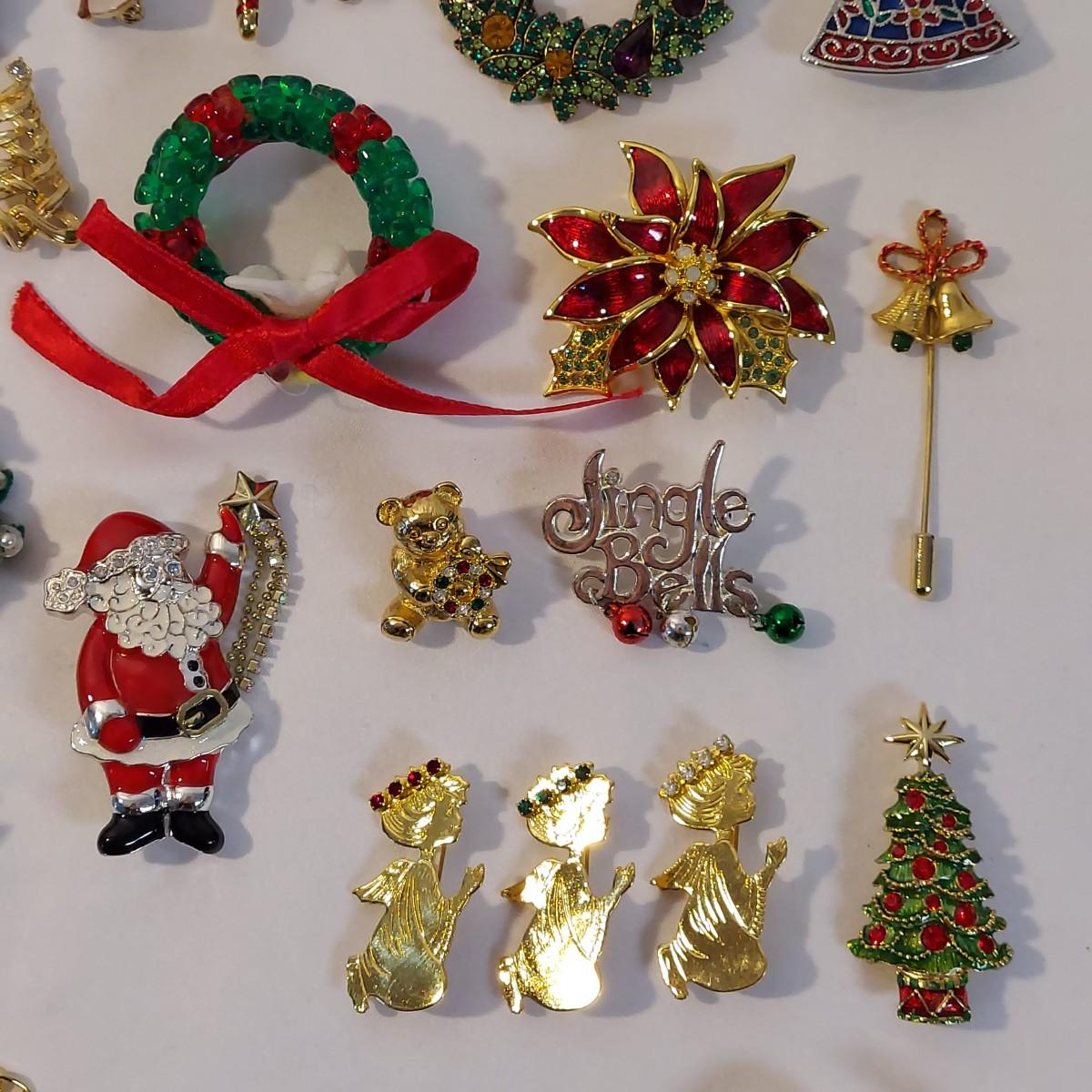 Several pieces of Christmas Holiday costume jewelry. Lot includes seven bracelets, one watch that is missing the back, three necklaces, one pair of earrings for pierced ears, one pendant and 40+ brooches. Some of the brooches can double as pendants. Most items are costume jewelry but some brooches are stamped .925. There are also several brooches bearing stamps of brands such as Avon, Christopher Radko, Nolan Miller, Trifari and Marie Jennifer. Necklaces are 24" long. Please see photos for all markings found. We cannot guarantee the authenticity of the gemstones. All sales are final. No returns or refunds. Please bid accordingly.