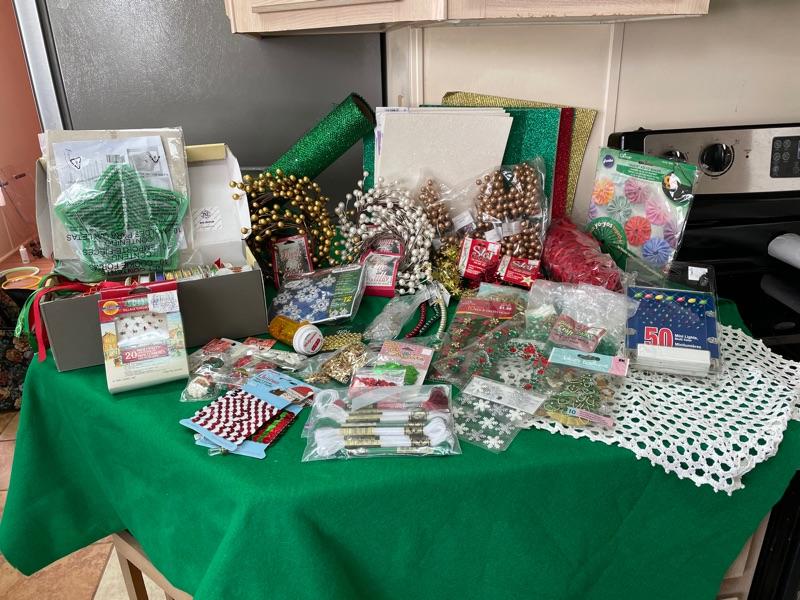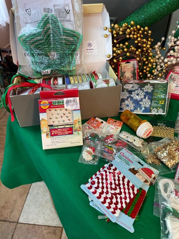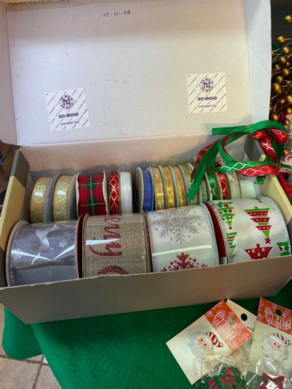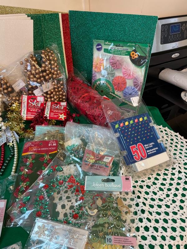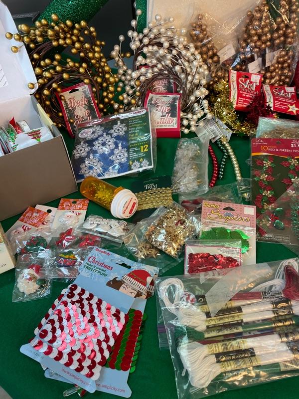 Large lot of miscellaneous Christmas craft supplies including, beads, tiny lights, ribbon, bead garland, embroidery floss