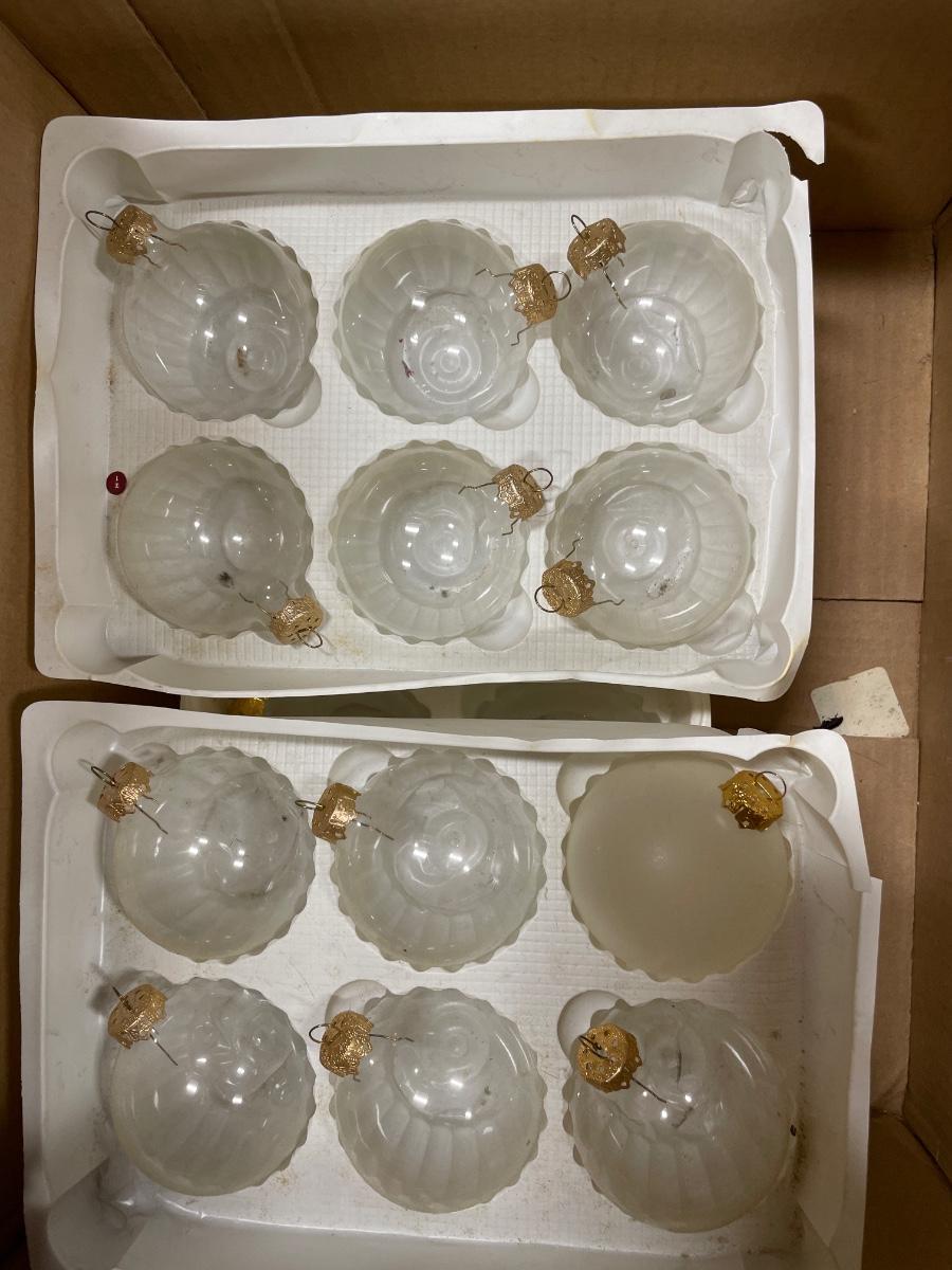 4 containers of Glass bulbs and ceramic ornaments and house