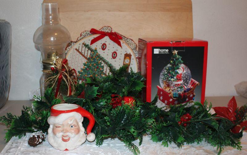 Santa cup, lantern, wall hanging, plastic garland, small sleigh globe with Santa