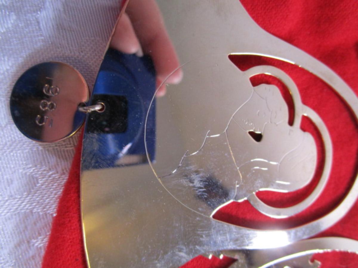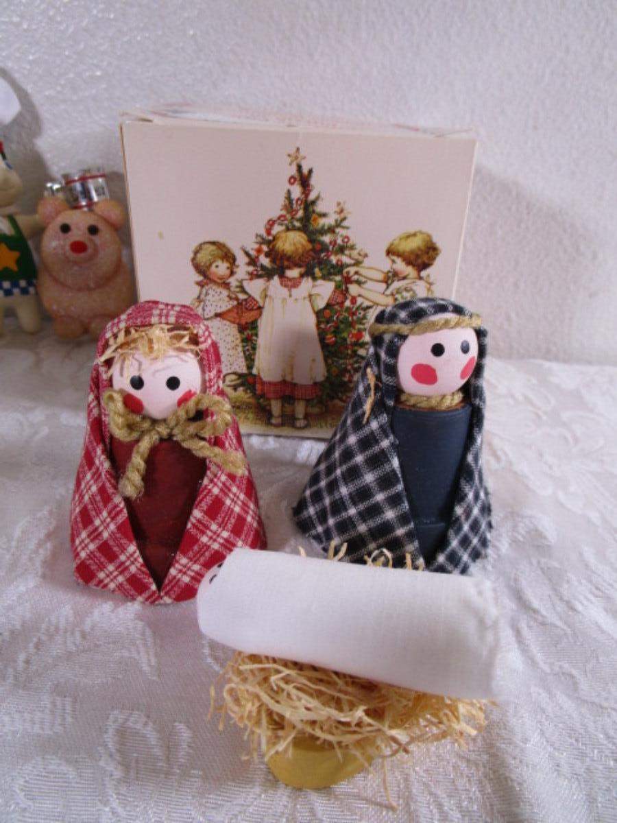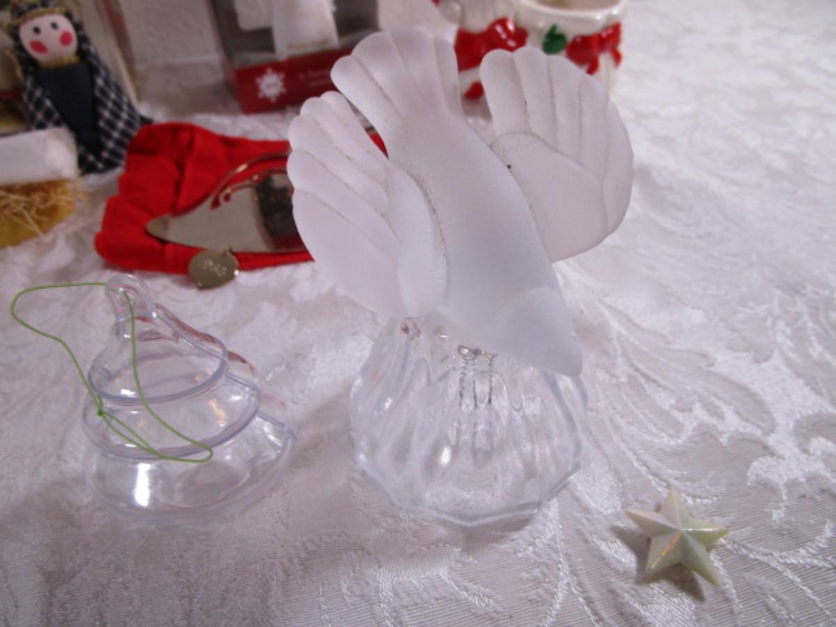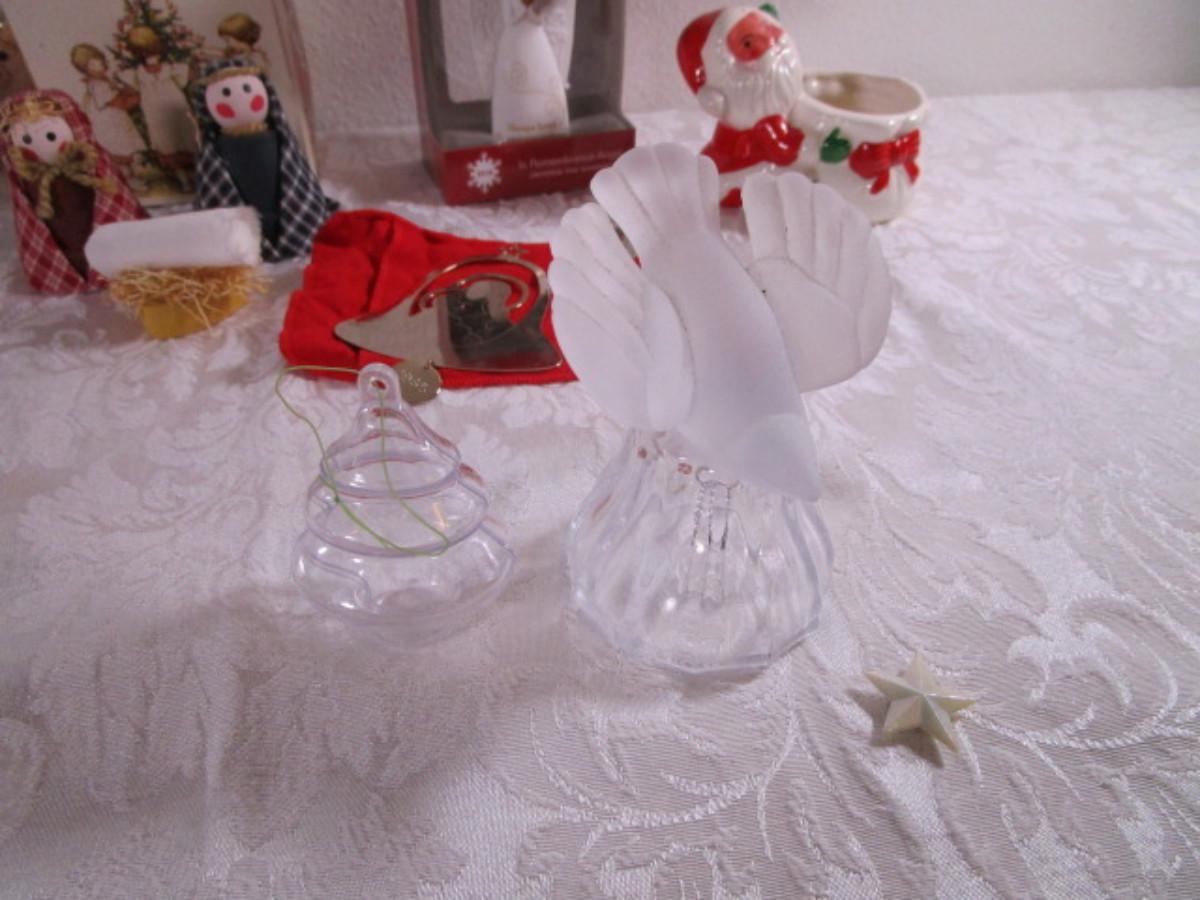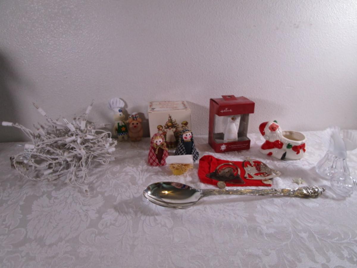 100-mini light string (tested & works); Spoon is 13" long; Bell with dove, star magnet, Christmas tree ornament, 2 gold-tone metal Christmas ornaments; Santa dish, Hallmark Angel ornament; Nativity scene, Poppin' Fresh & bear light-up ornament (needs batteries)