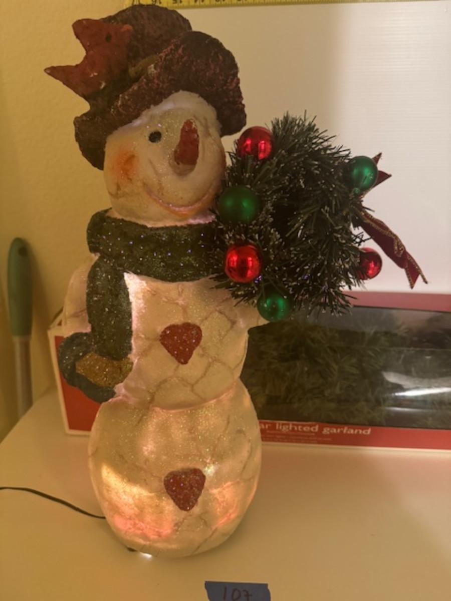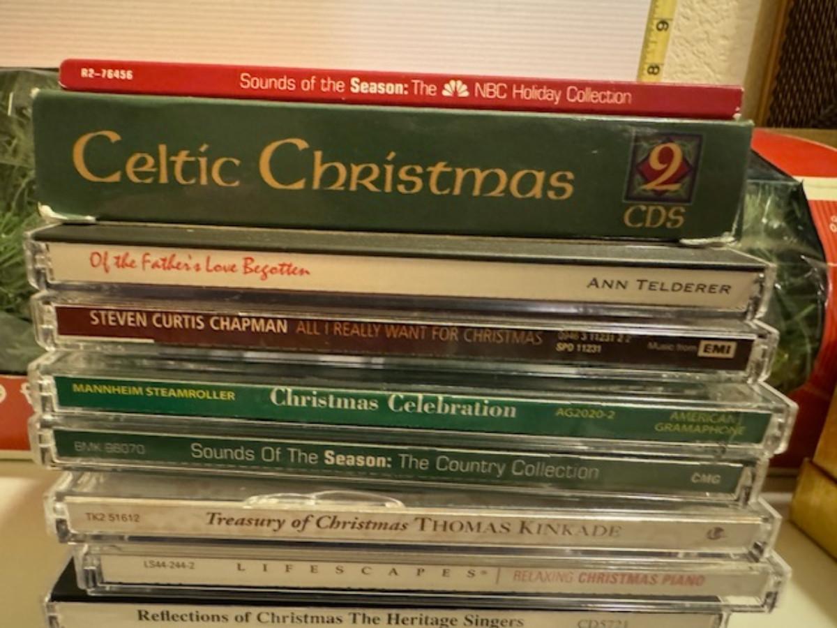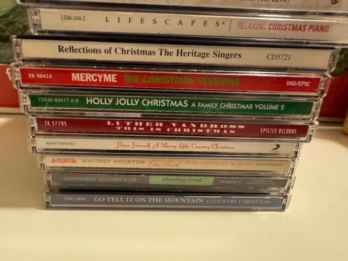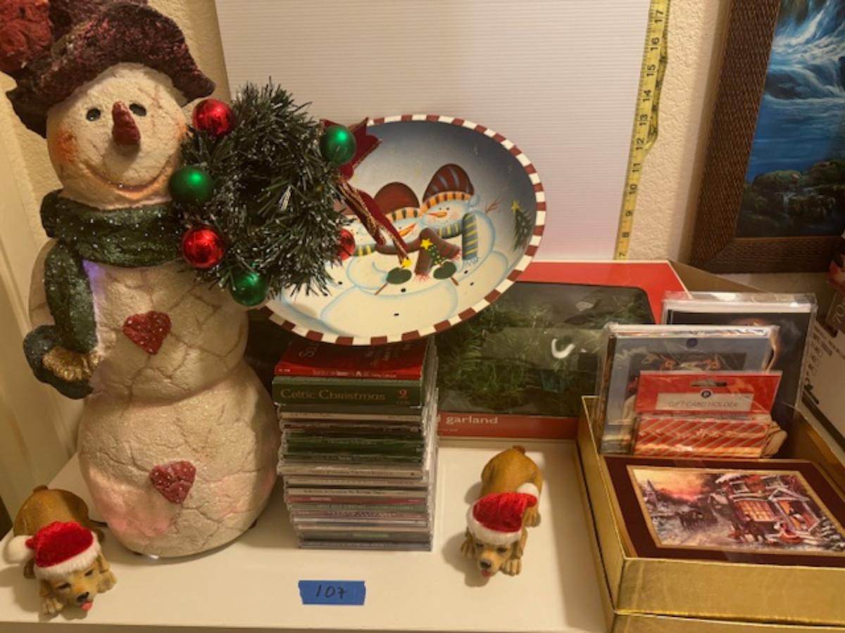15 plus X-mas CDs, 2 X-mas dogs, 1 has small chip in tongue, snowman that has fiber optic 19", snowman wooden bowl, X-mas cards and gift card holder, 9ft clear lighted garland for indoor or outdoor.