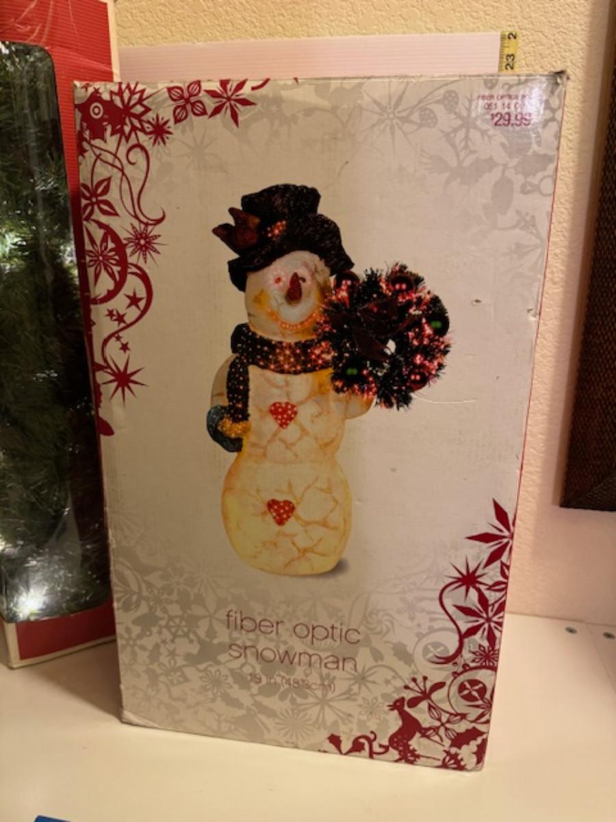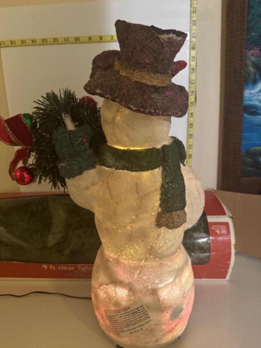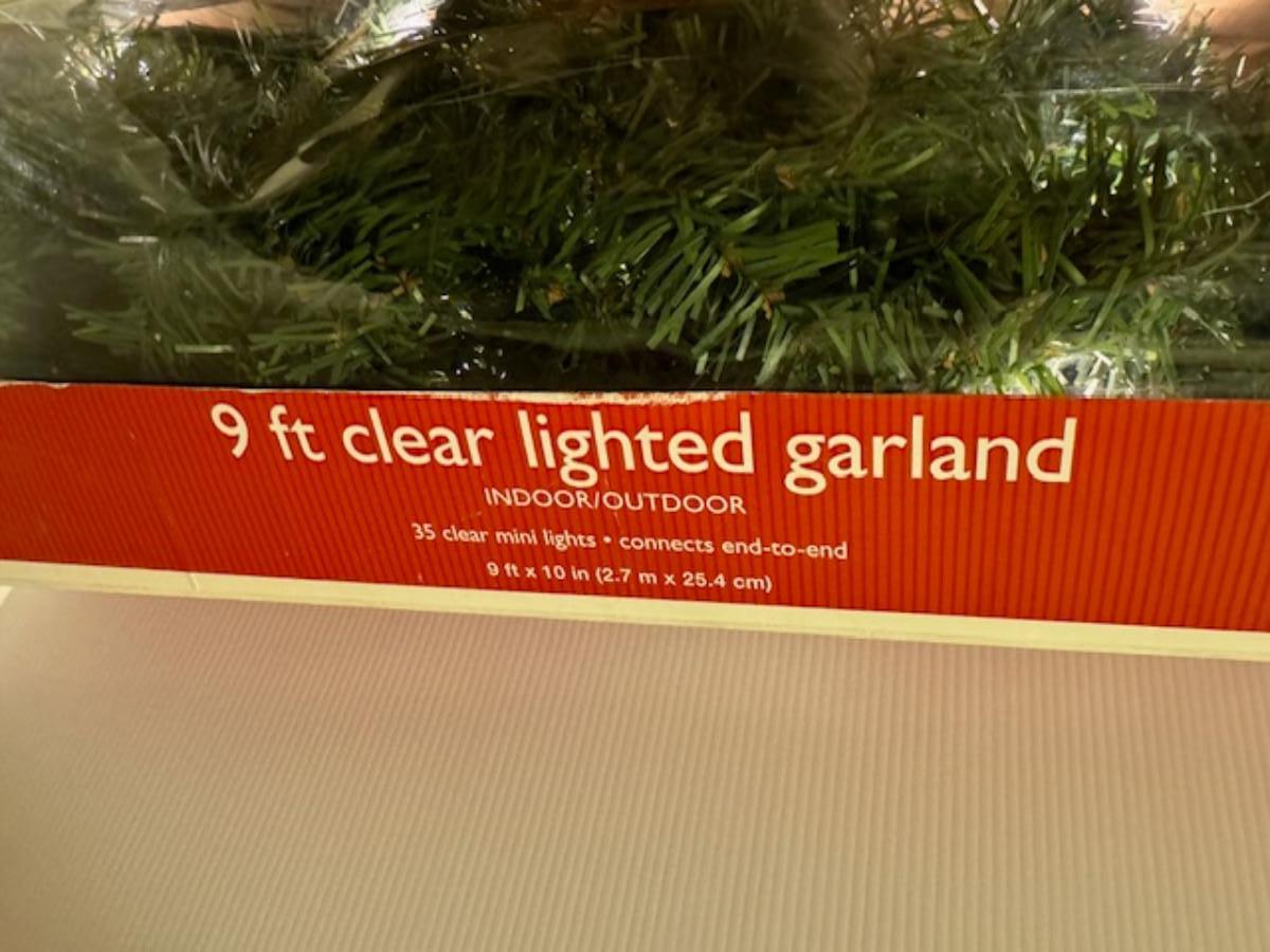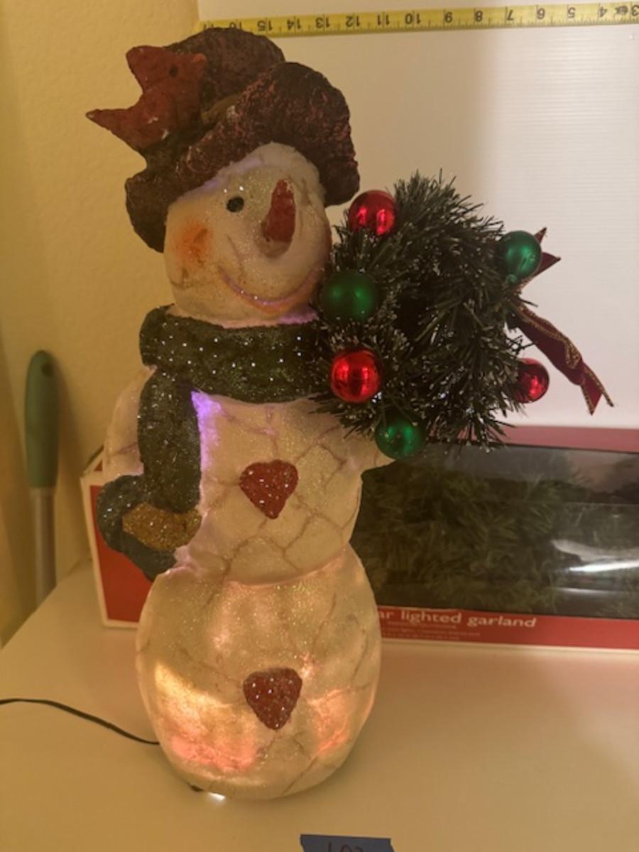 15 plus X-mas CDs, 2 X-mas dogs, 1 has small chip in tongue, snowman that has fiber optic 19", snowman wooden bowl, X-mas cards and gift card holder, 9ft clear lighted garland for indoor or outdoor.