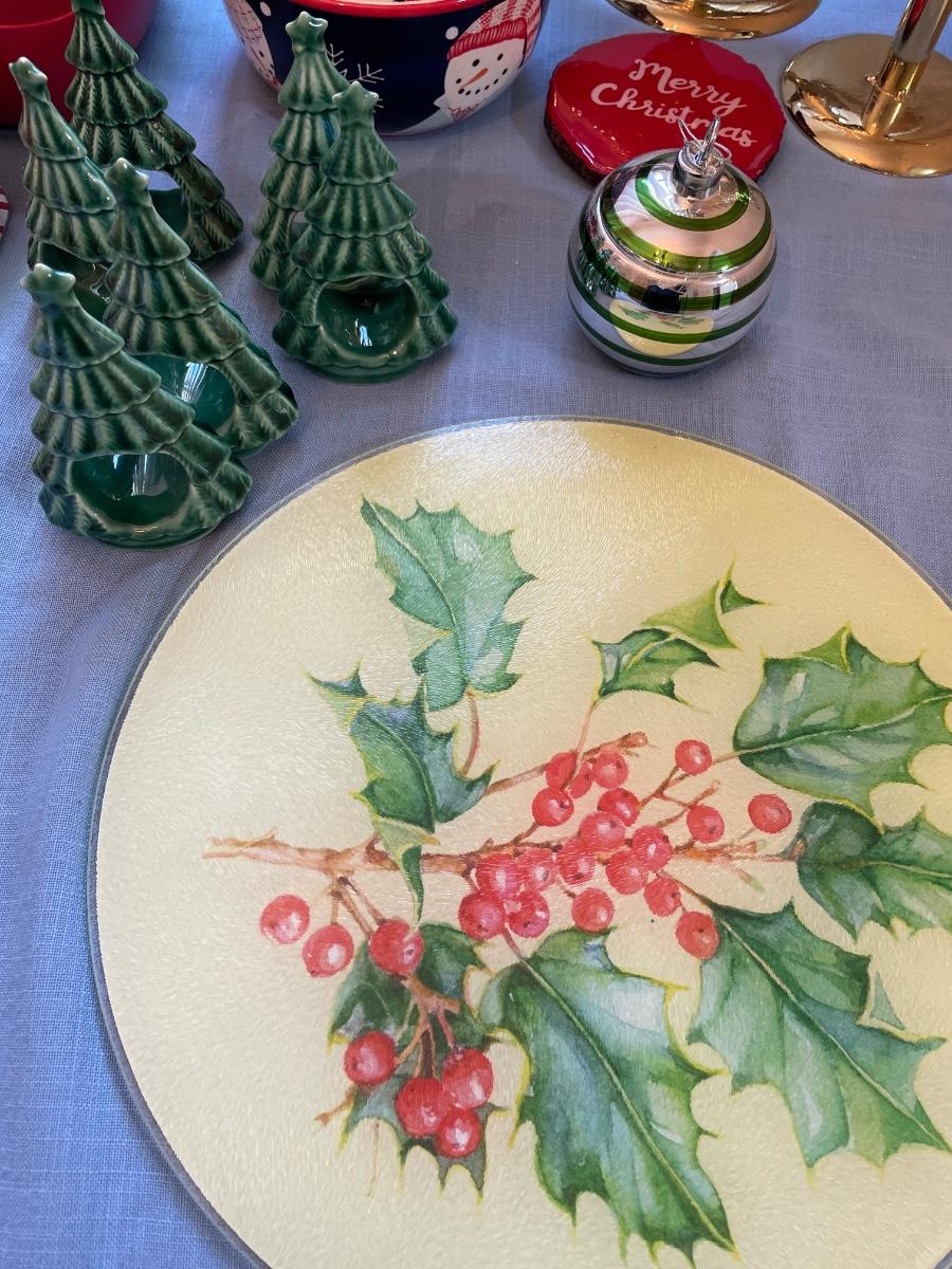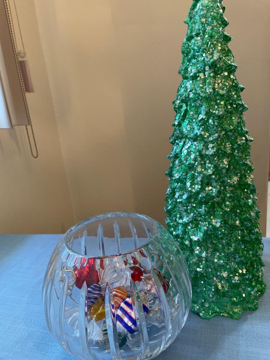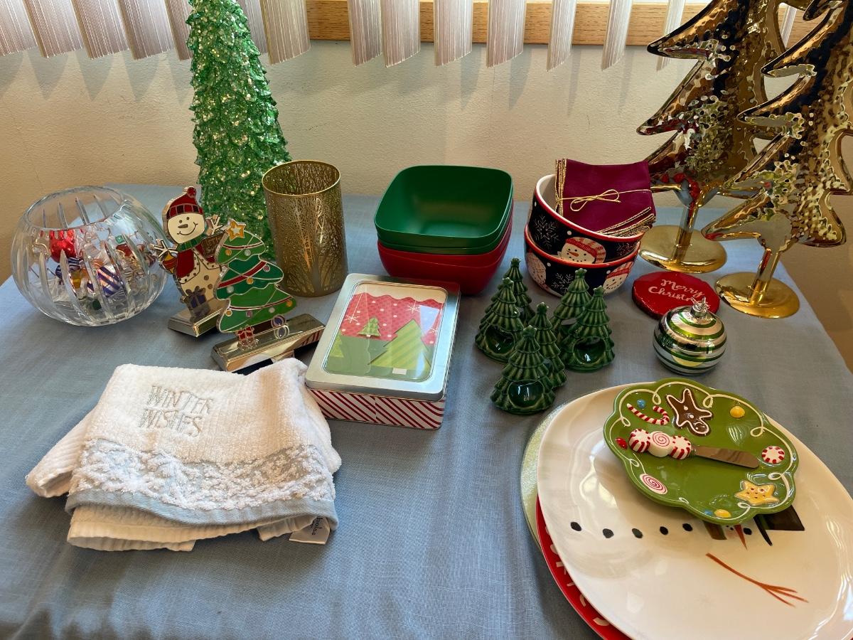 Christmas decor includes trees, stocking holders, plates, glass bowl with glass, candy, and more