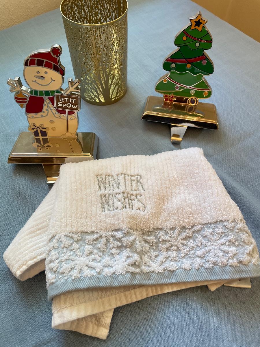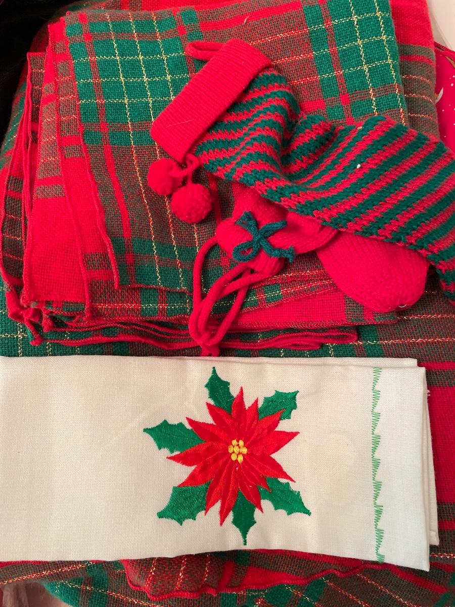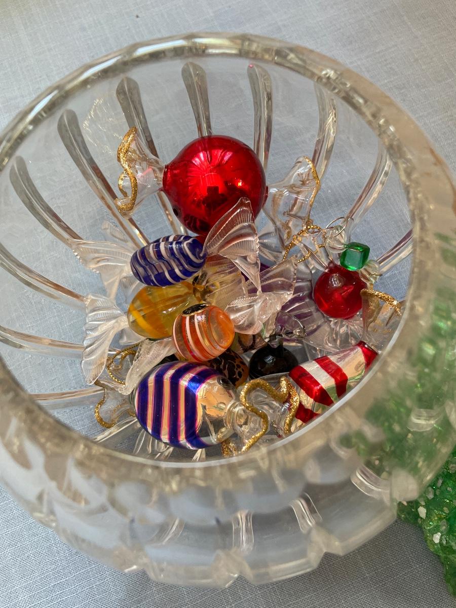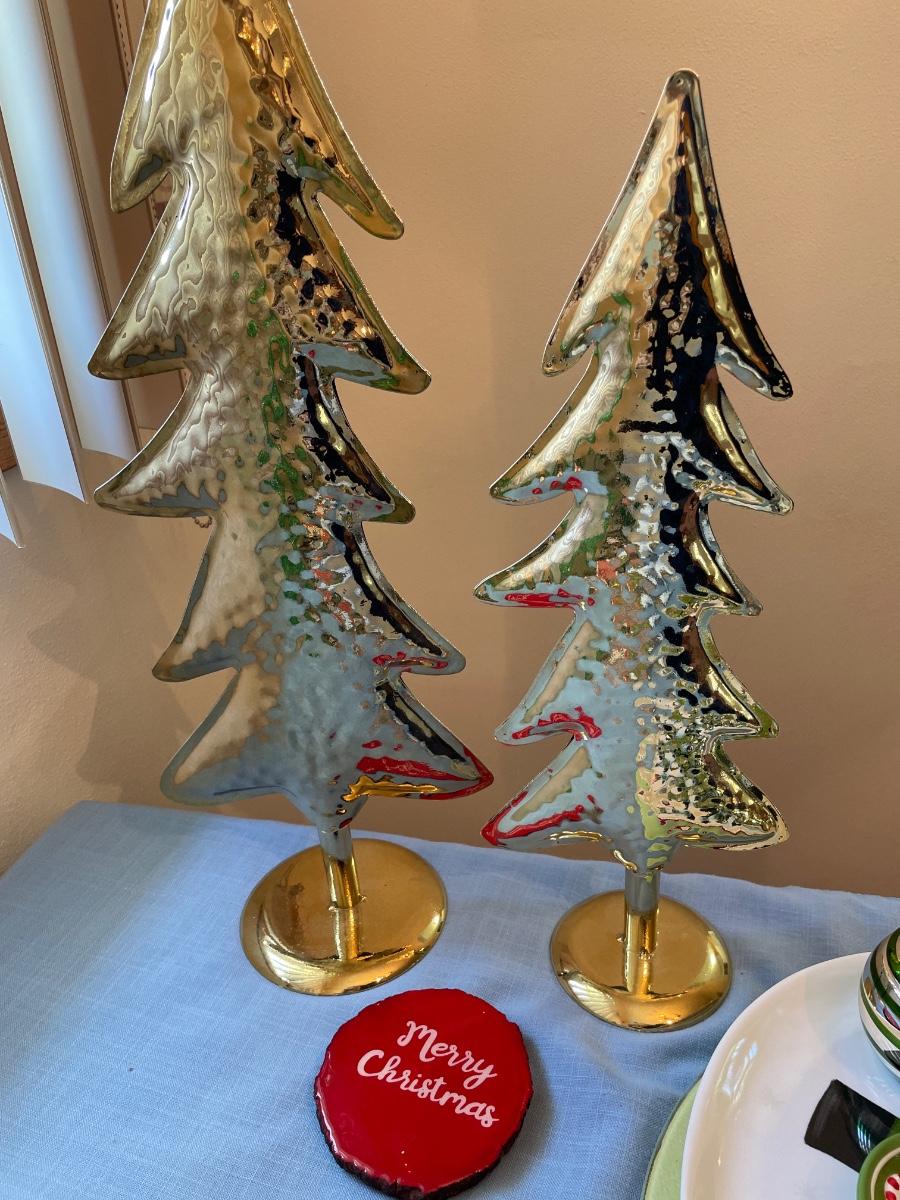 Christmas decor includes trees, stocking holders, plates, glass bowl with glass, candy, and more