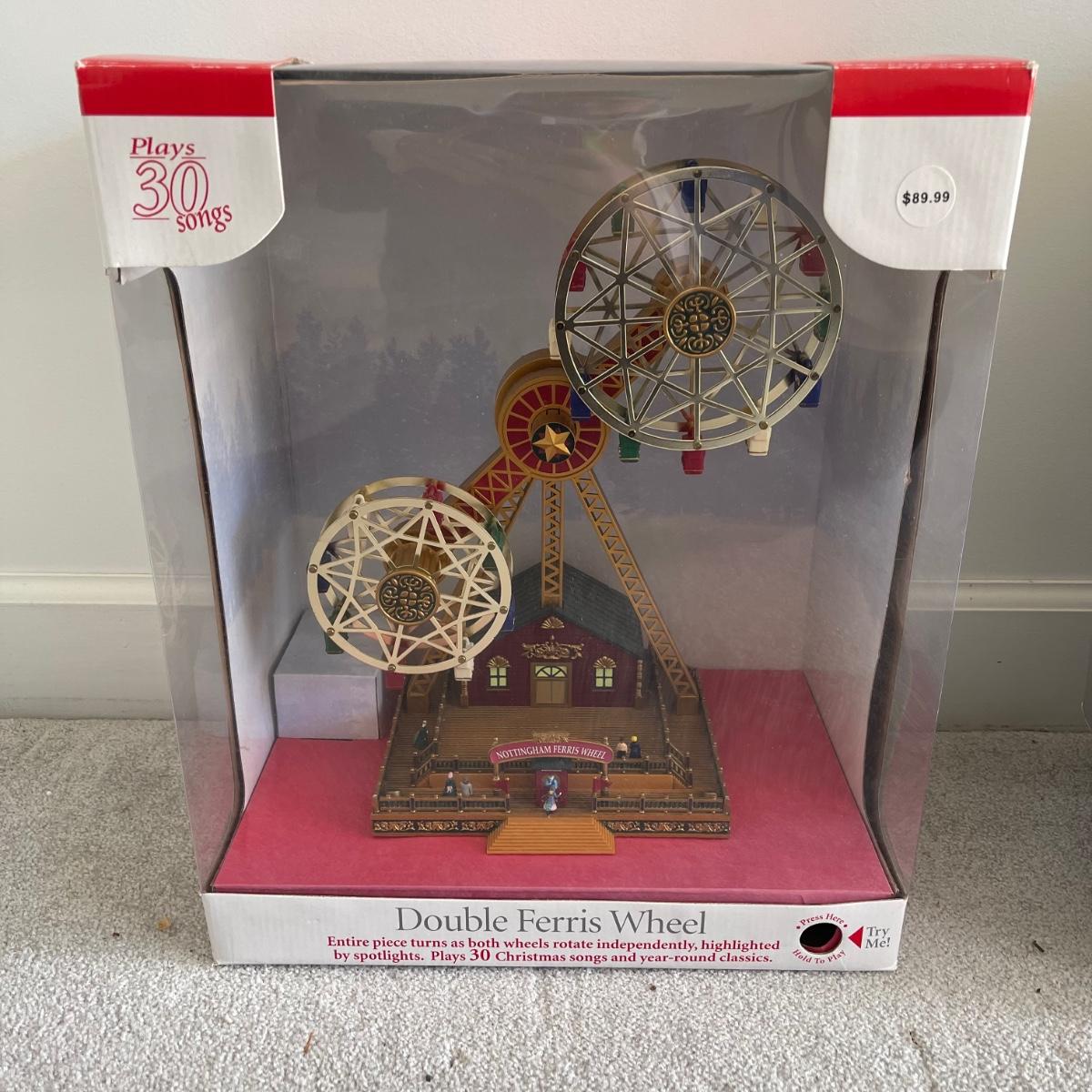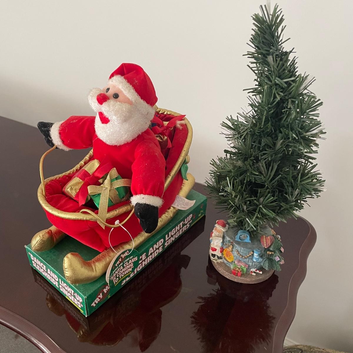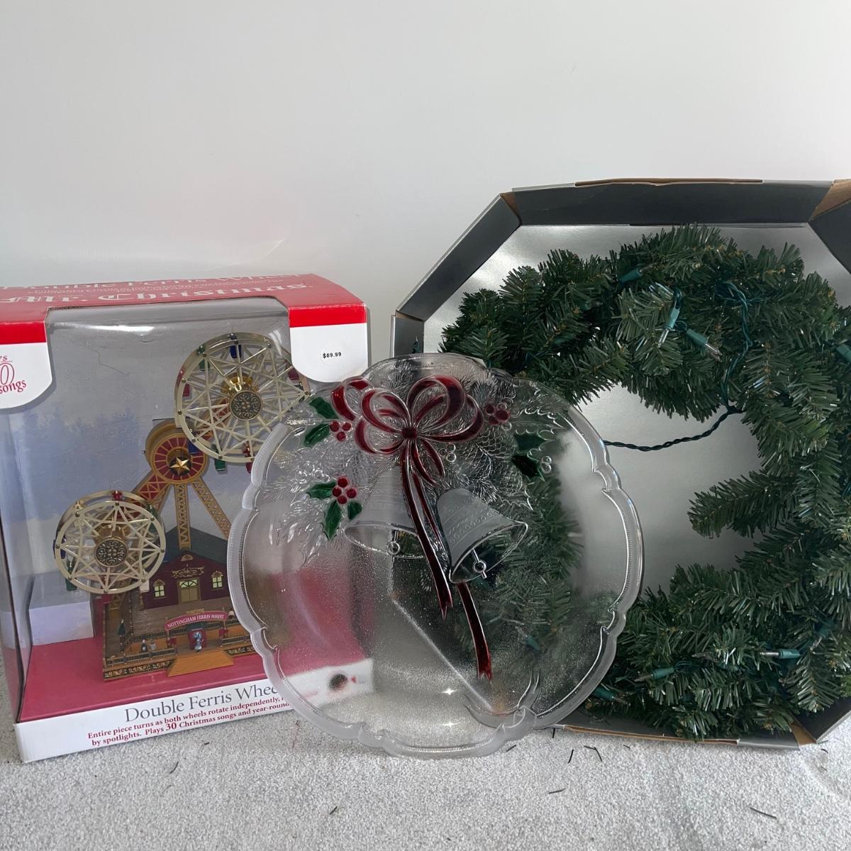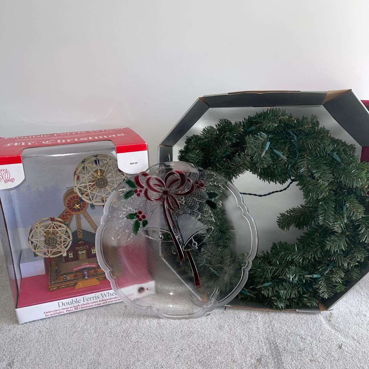 Mr. Christmas Double Ferris Wheel, two pre-lit wreaths, and a glass serving platter. The entire double ferris wheel rotates while both wheels rotate independently and it plays 30 Christmas songs. When plugged in, one wreath lit up and the other did not. The glass serving platter is 15 inches in diameter and has holiday bell imagery. The Santa in his sleigh (out of battery power) and small led light Xmas tree were added to the lot later; tree measures 13” tall.