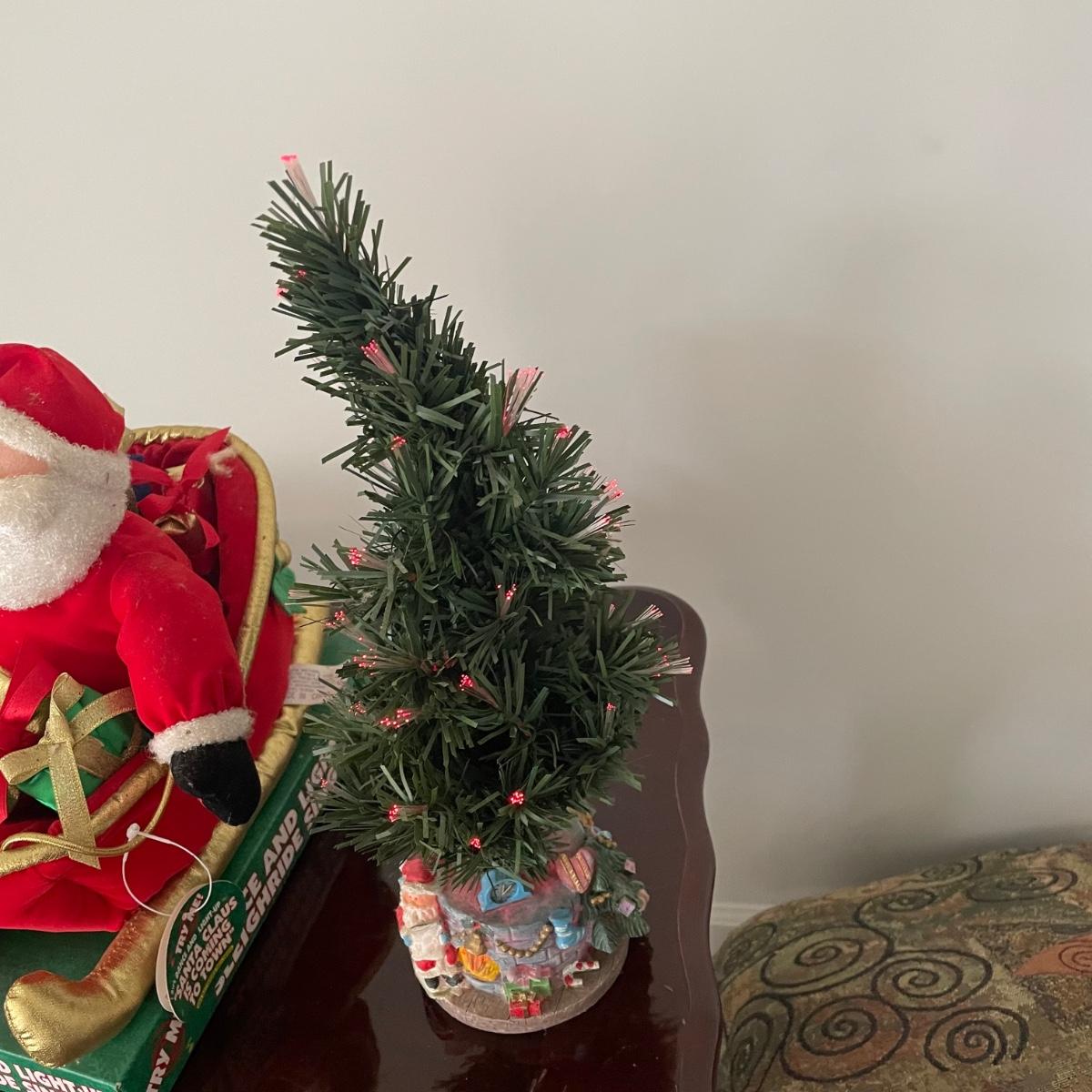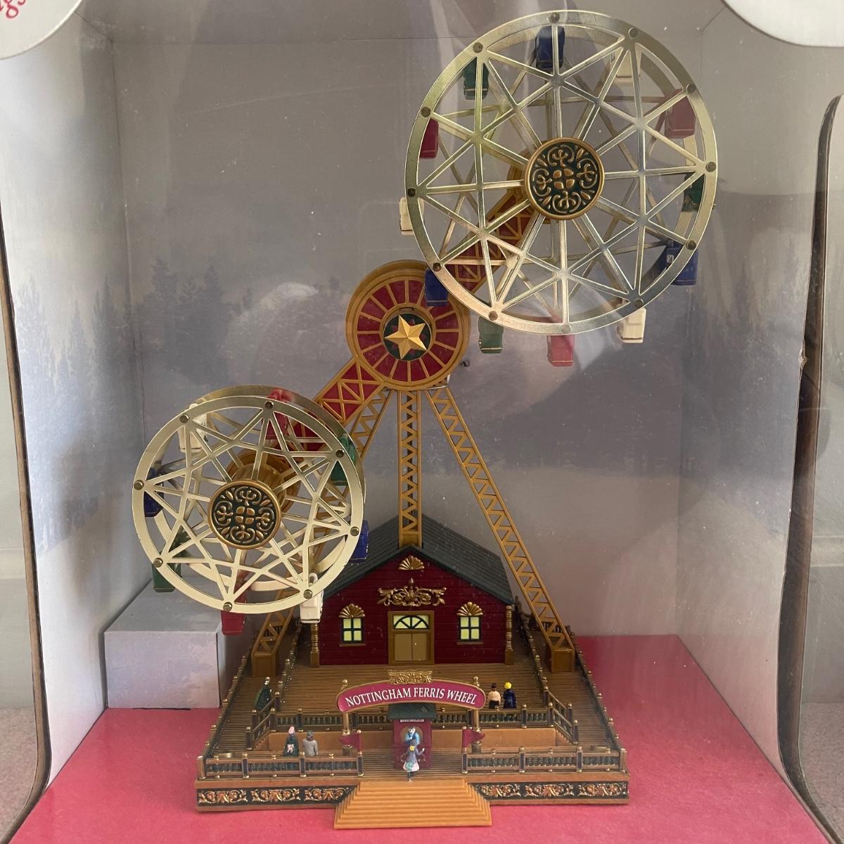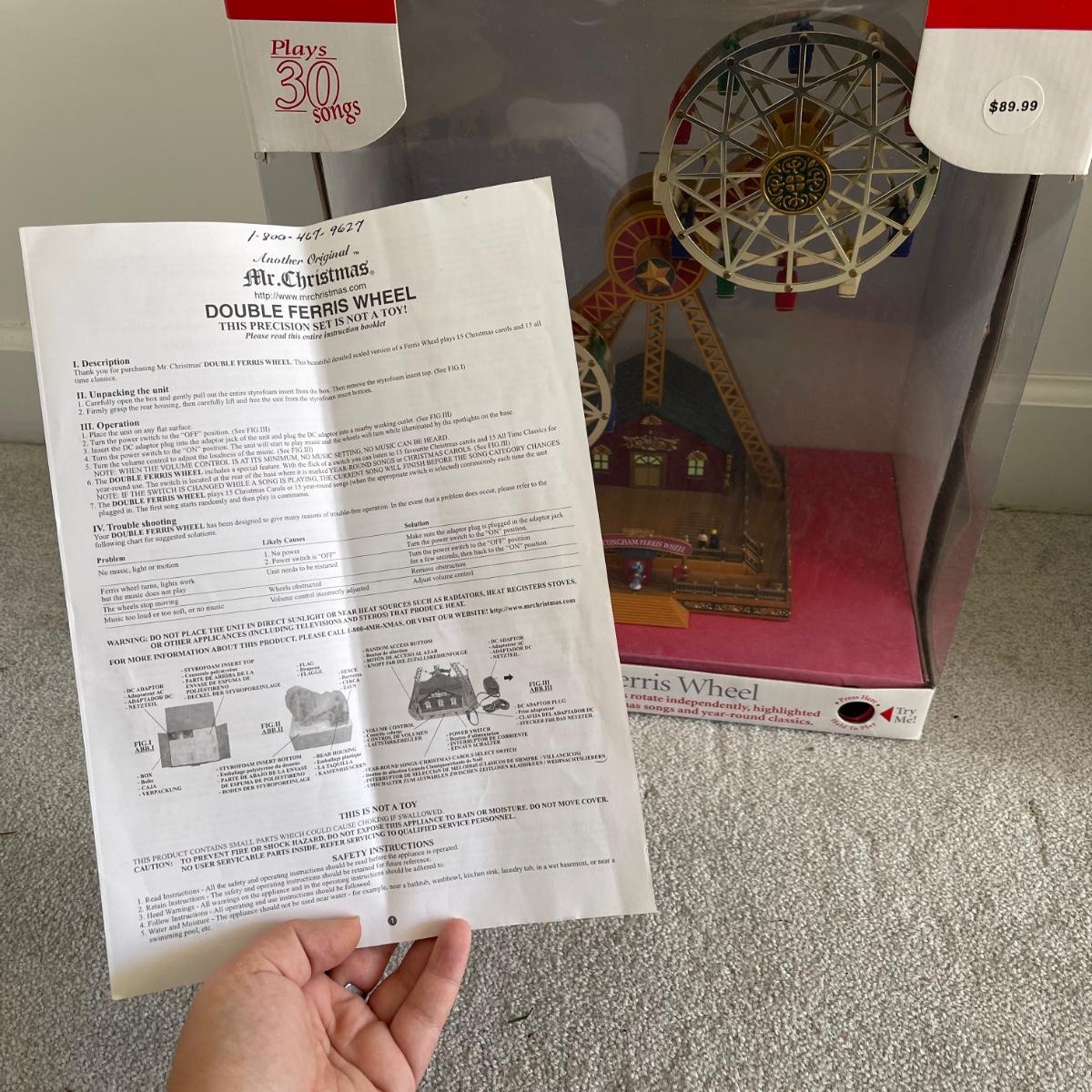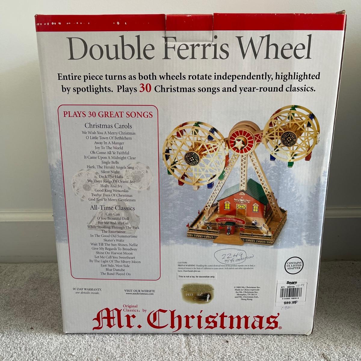 Mr. Christmas Double Ferris Wheel, two pre-lit wreaths, and a glass serving platter. The entire double ferris wheel rotates while both wheels rotate independently and it plays 30 Christmas songs. When plugged in, one wreath lit up and the other did not. The glass serving platter is 15 inches in diameter and has holiday bell imagery. The Santa in his sleigh (out of battery power) and small led light Xmas tree were added to the lot later; tree measures 13” tall.