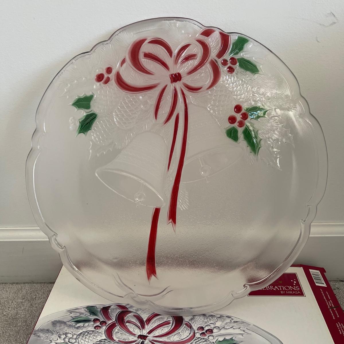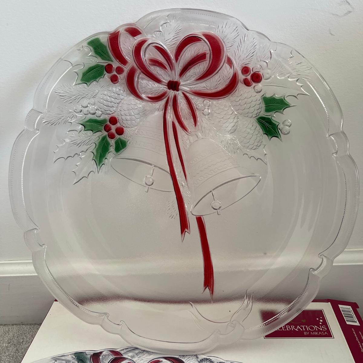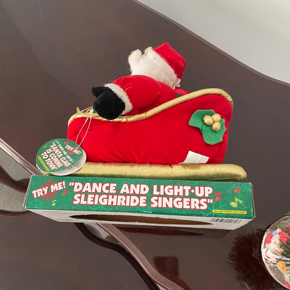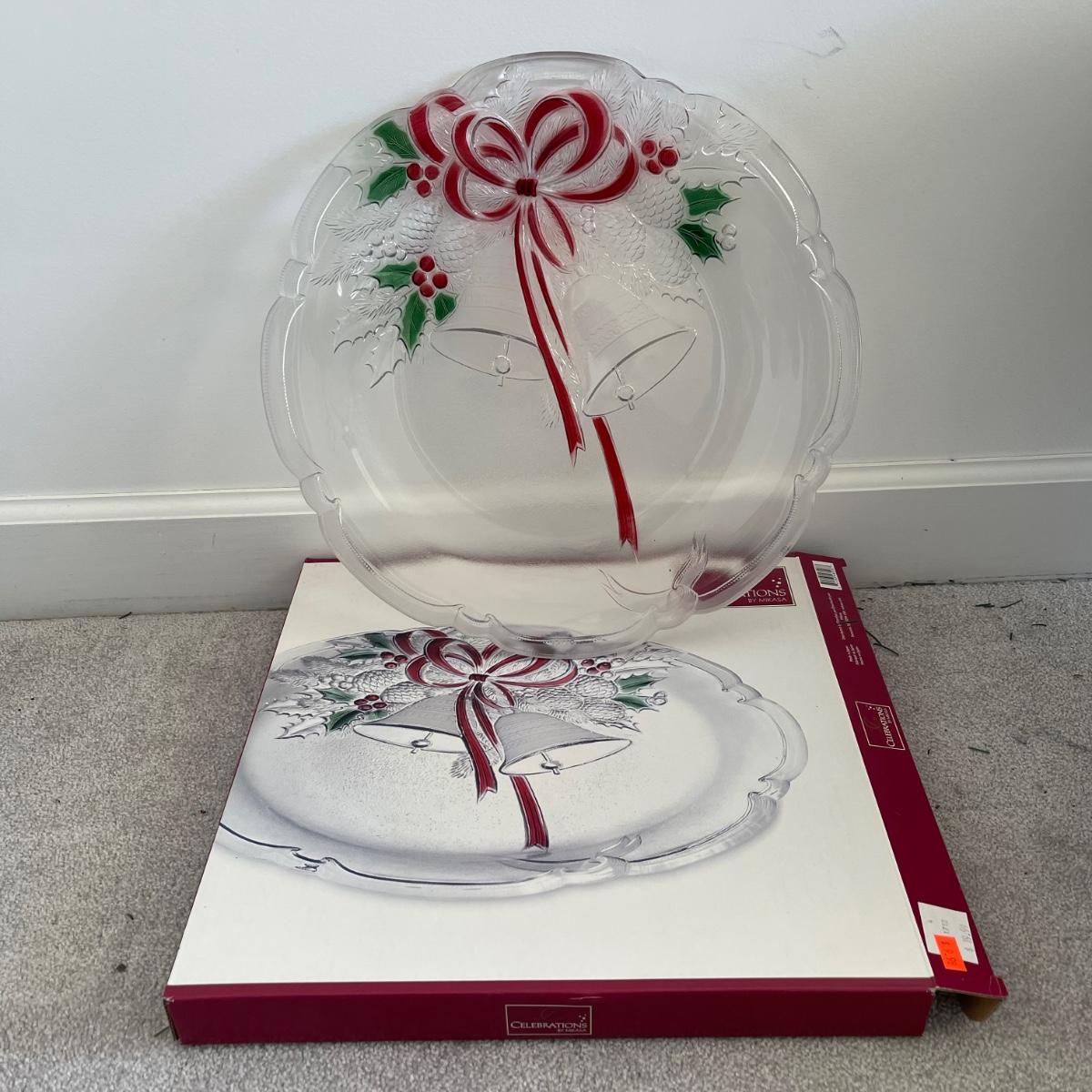 Mr. Christmas Double Ferris Wheel, two pre-lit wreaths, and a glass serving platter. The entire double ferris wheel rotates while both wheels rotate independently and it plays 30 Christmas songs. When plugged in, one wreath lit up and the other did not. The glass serving platter is 15 inches in diameter and has holiday bell imagery. The Santa in his sleigh (out of battery power) and small led light Xmas tree were added to the lot later; tree measures 13” tall.