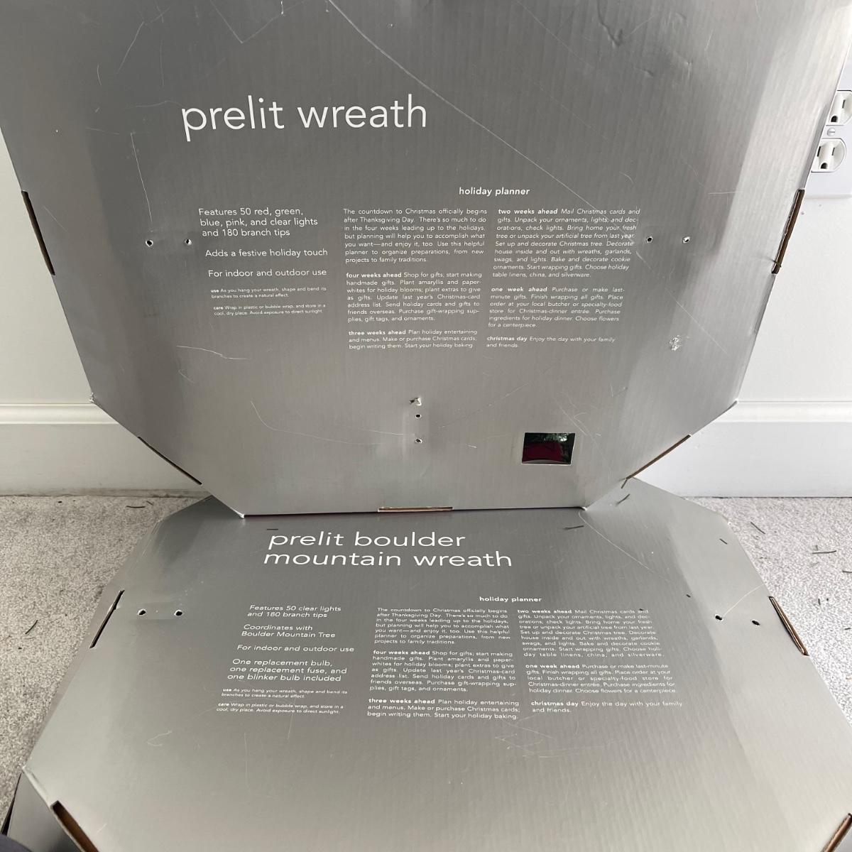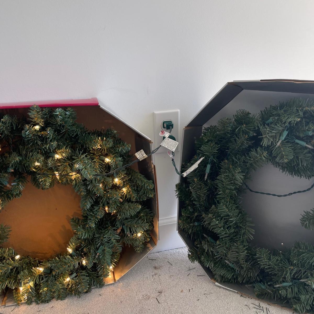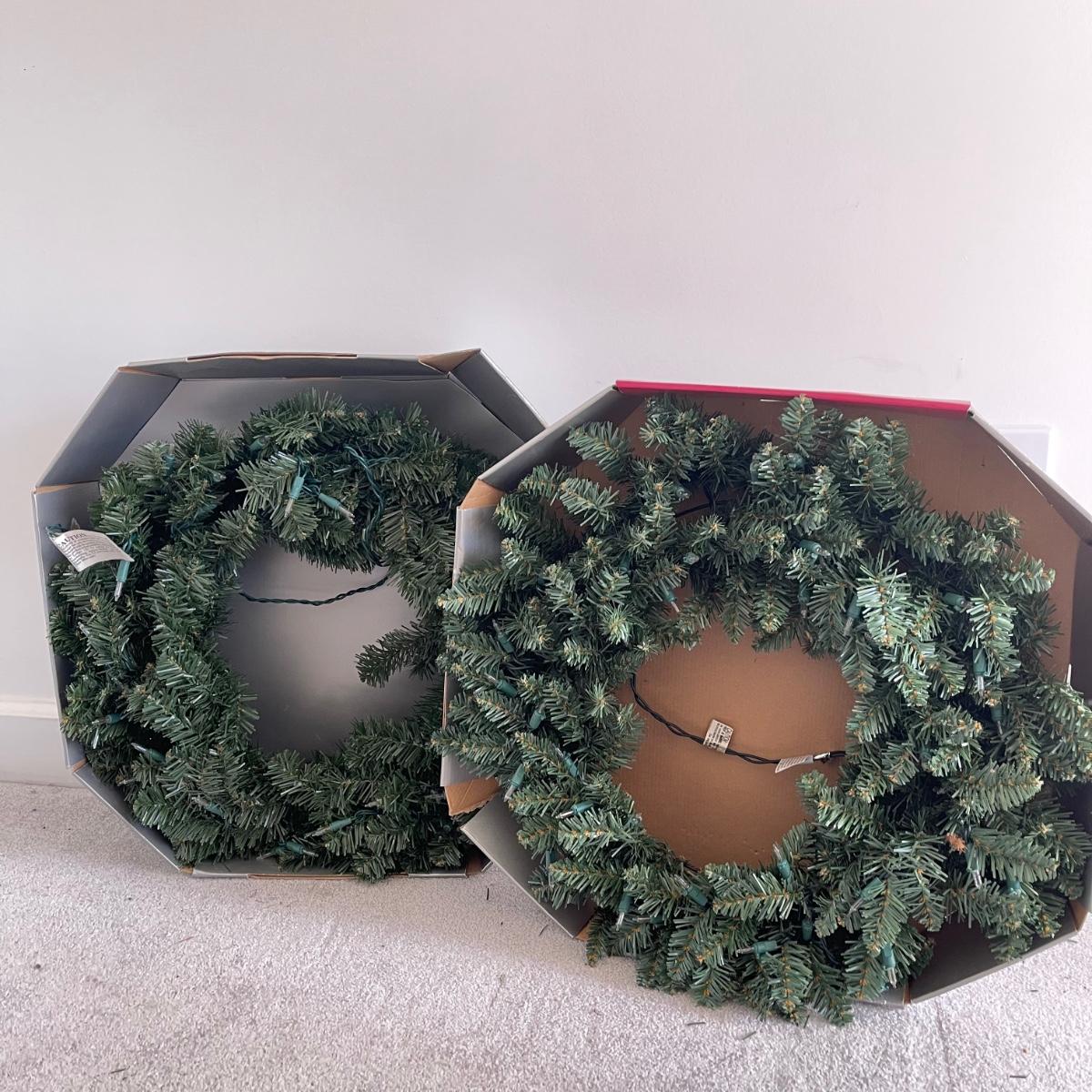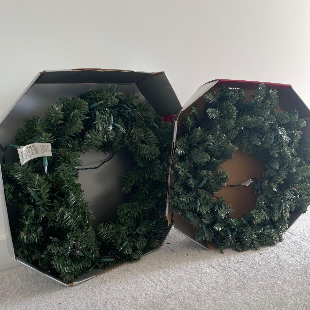 Mr. Christmas Double Ferris Wheel, two pre-lit wreaths, and a glass serving platter. The entire double ferris wheel rotates while both wheels rotate independently and it plays 30 Christmas songs. When plugged in, one wreath lit up and the other did not. The glass serving platter is 15 inches in diameter and has holiday bell imagery. The Santa in his sleigh (out of battery power) and small led light Xmas tree were added to the lot later; tree measures 13” tall.