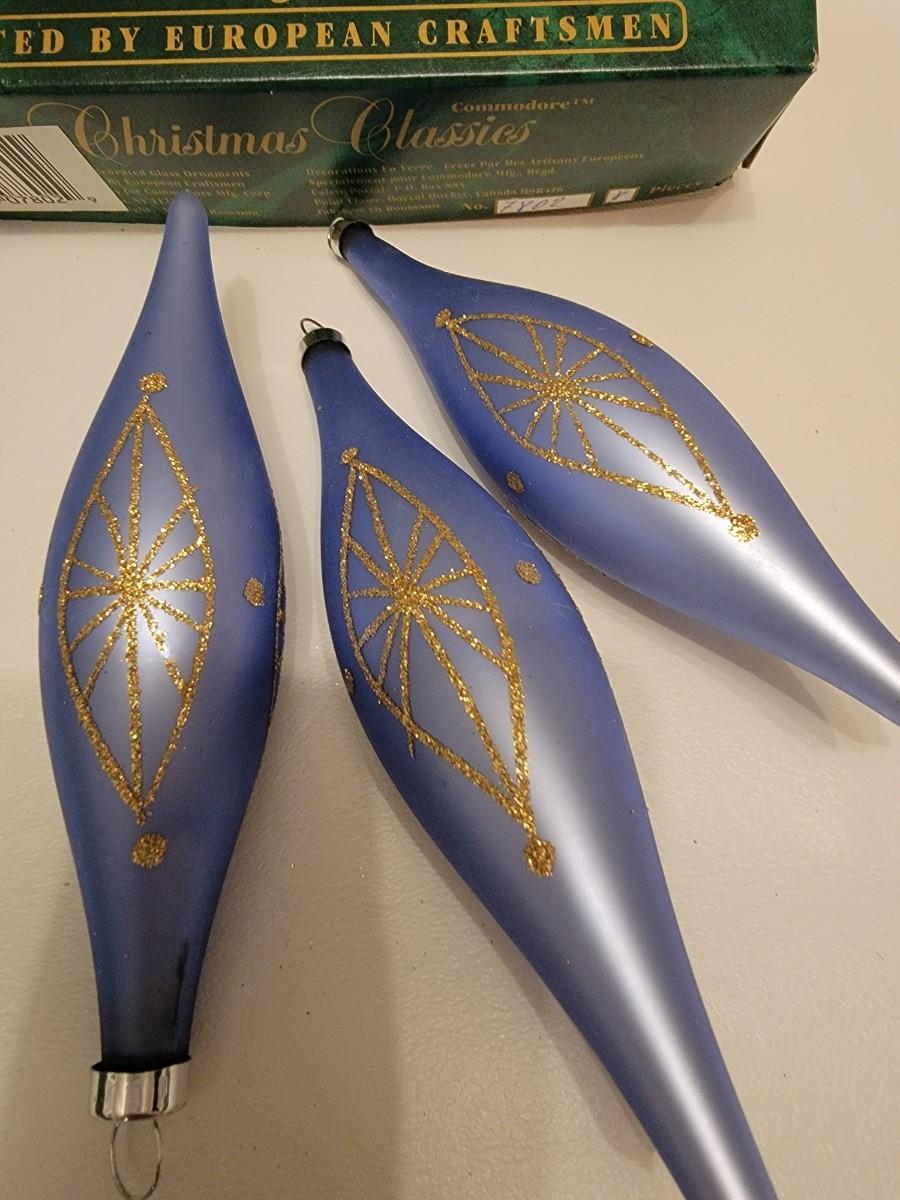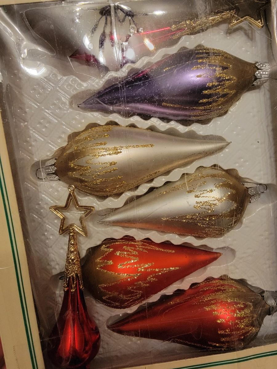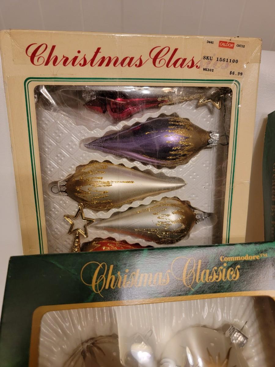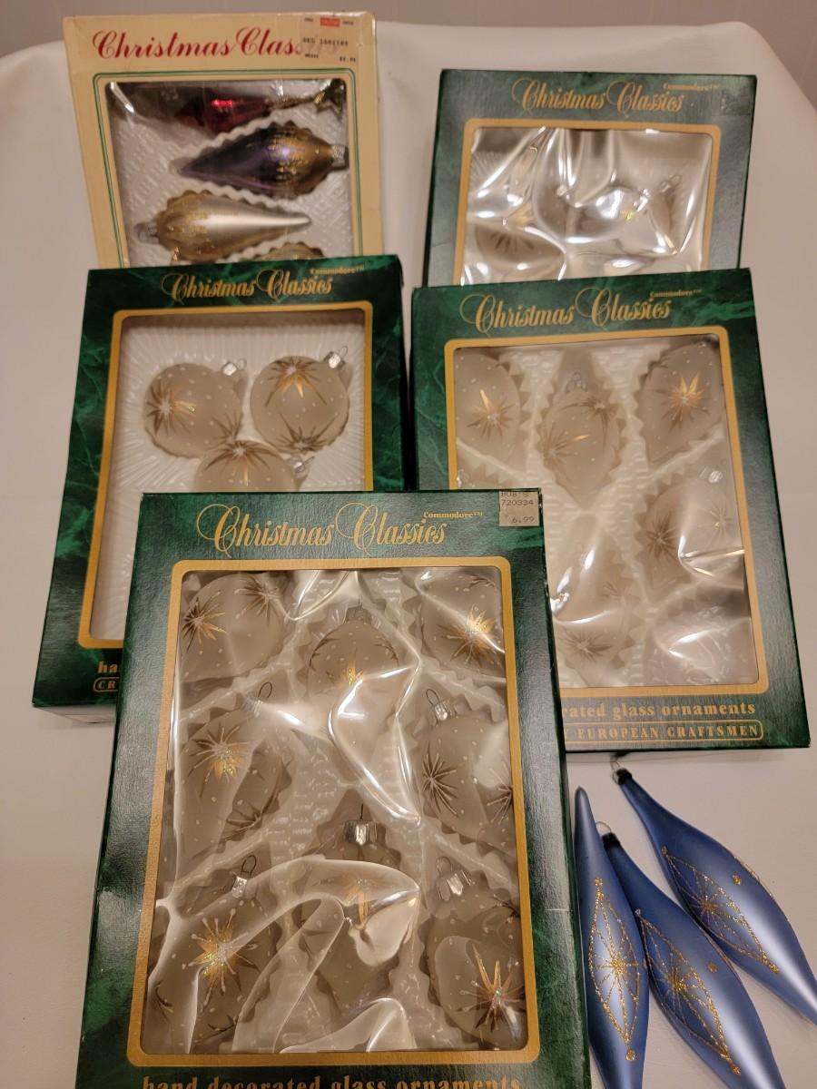 Contemporary Glass Christmas Ornaments This lot consists of 4 boxes of frosted white and gold tree ornaments and a mix of multicolored ornaments