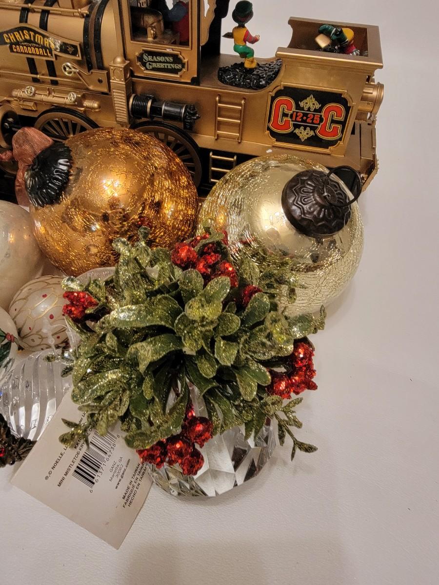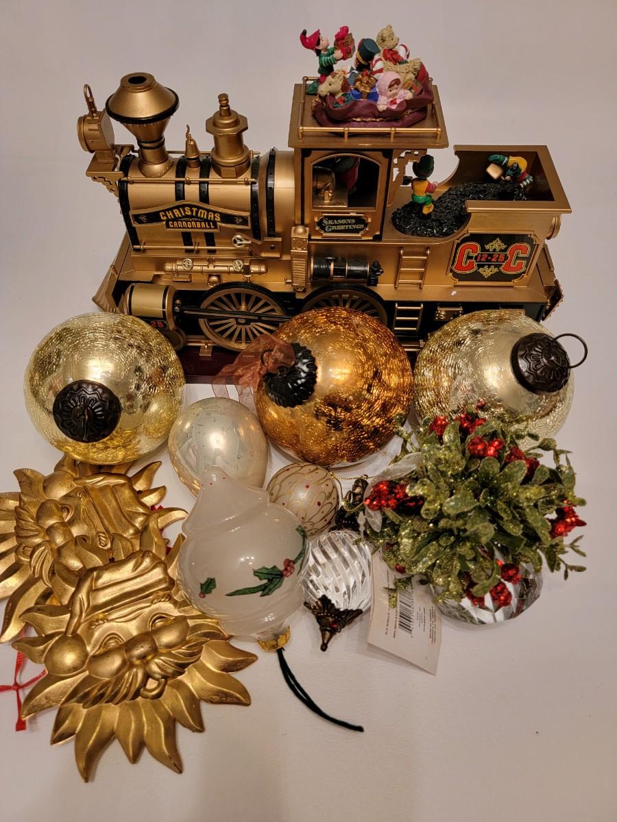 Christmas Lot heavy glass Ornaments golden sun ornaments, crystal mistletoe and automated Train