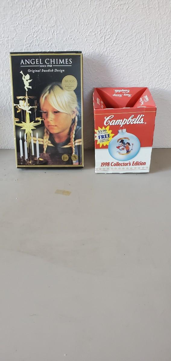 Angel chimes are made of brass plated steel,in the original box,Campbell's ornament is in mint condition and still in the original box