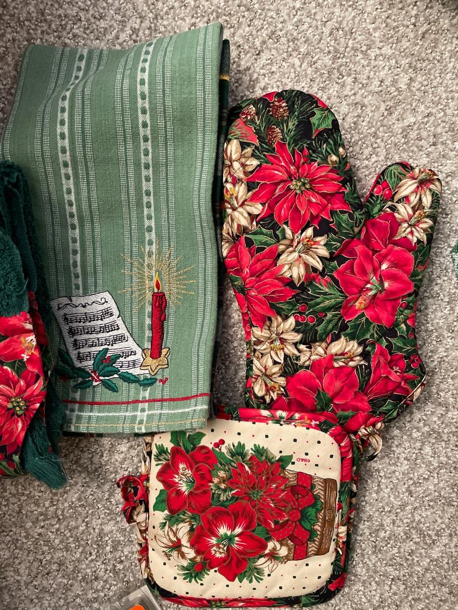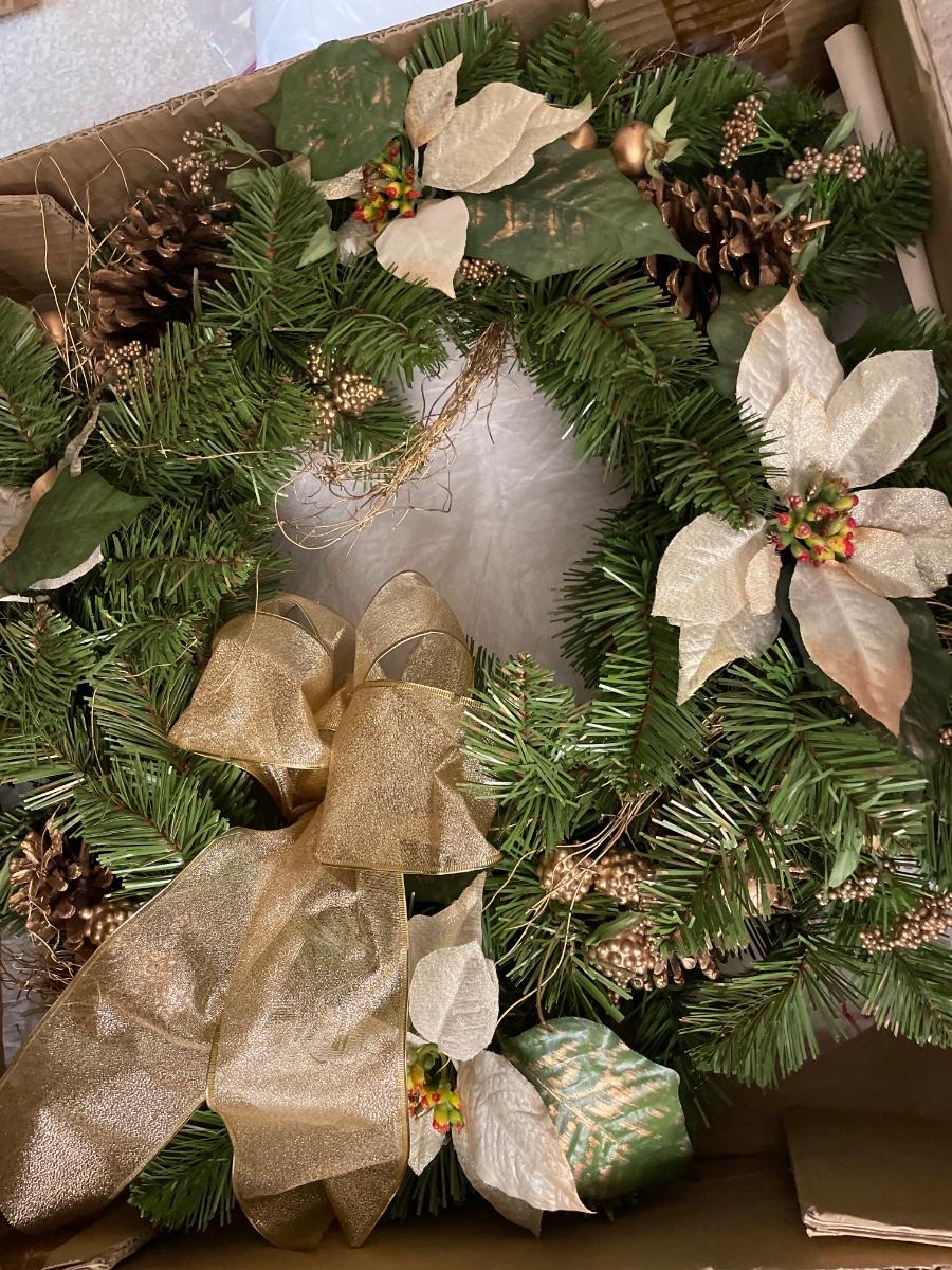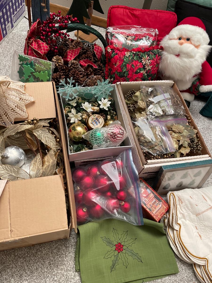 Large lot of Christmas and winter decorations, a wreath & multiple towels