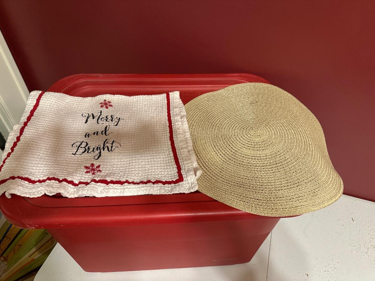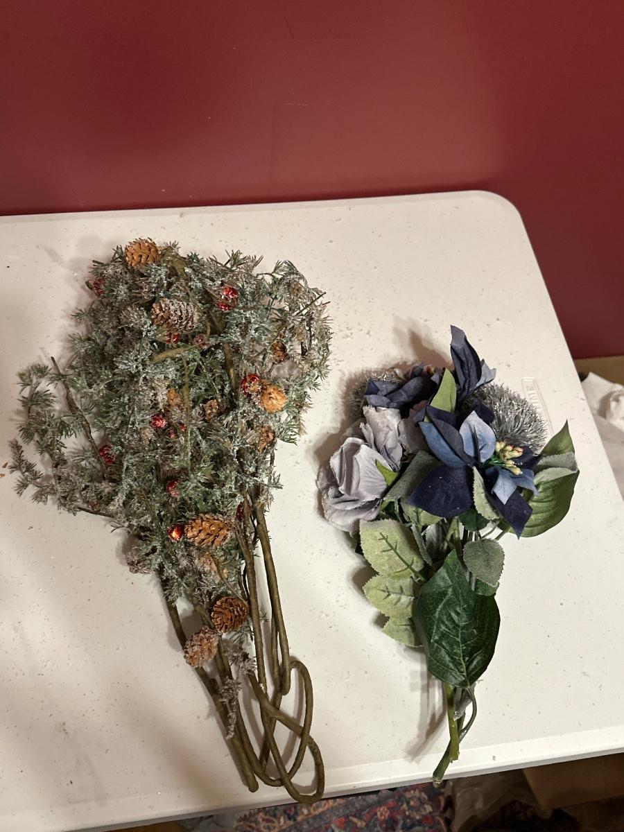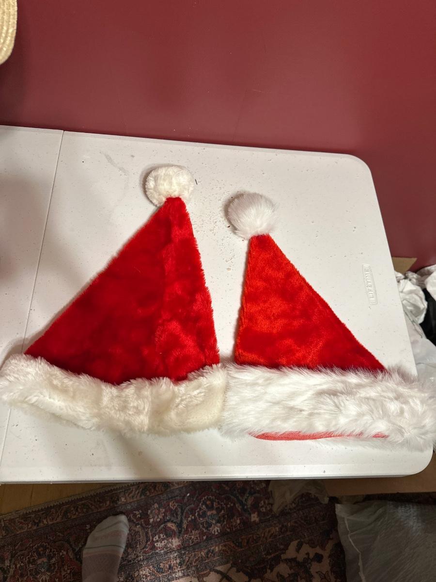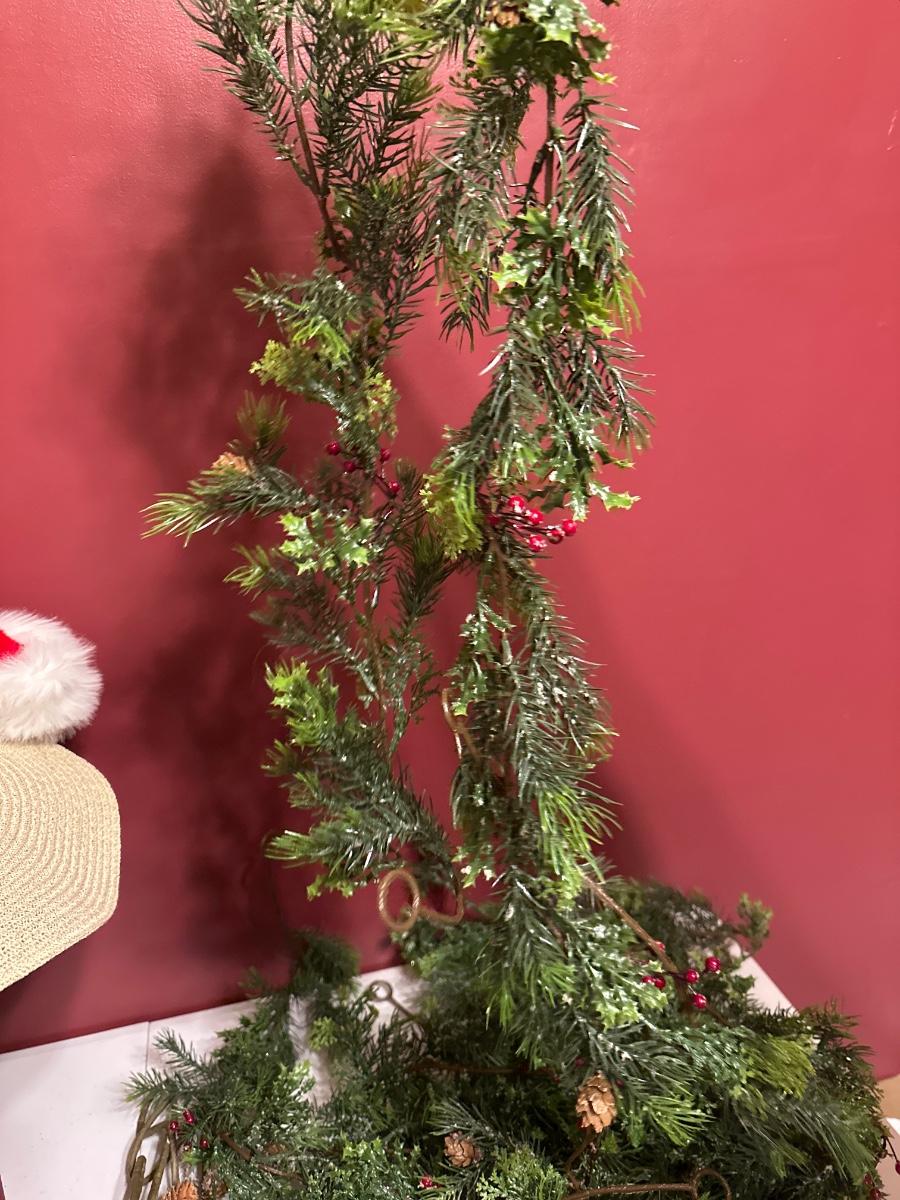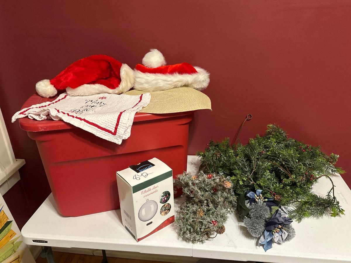 4 strings of garland, 7 ornaments, 2 Santa hats