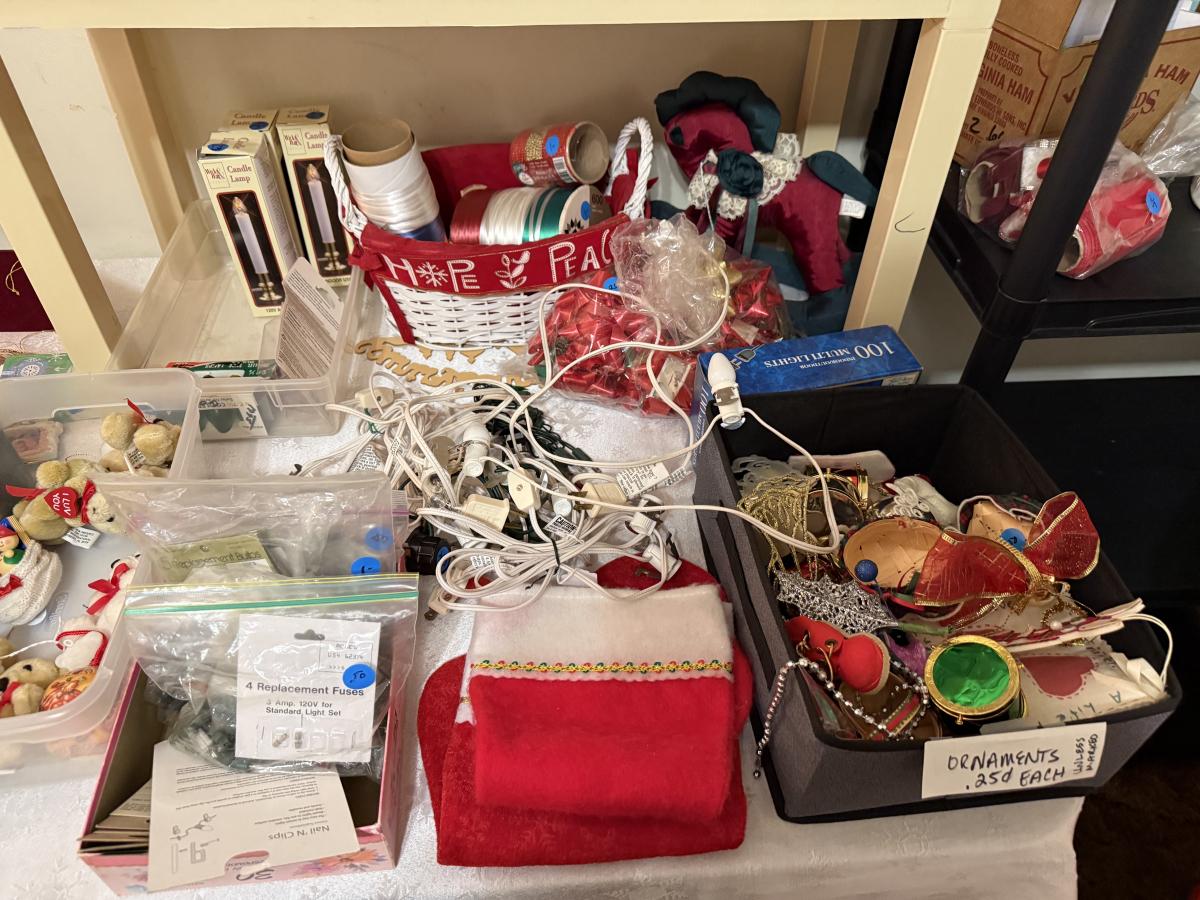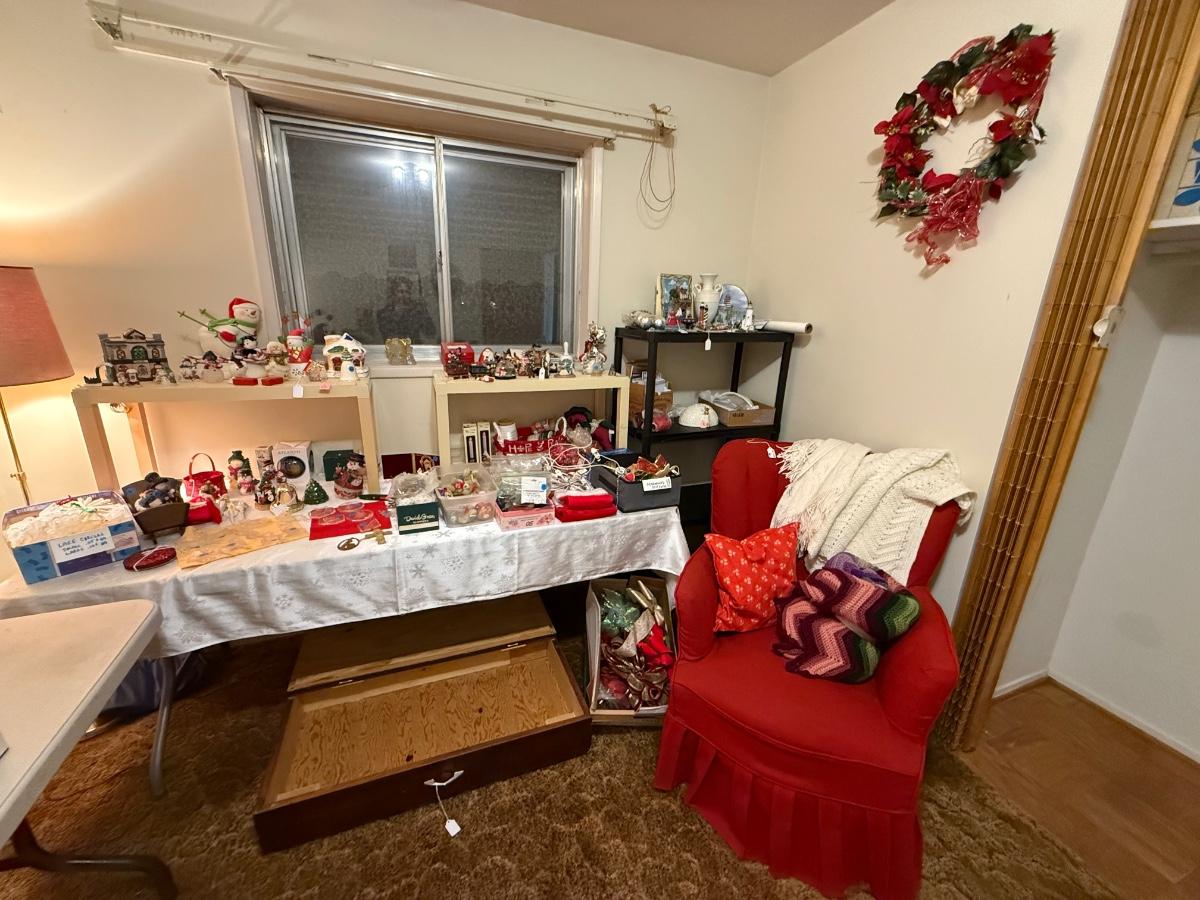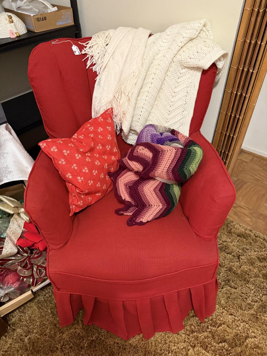 Christmas decor, red upholstered Santa chair, storage, nautical decor