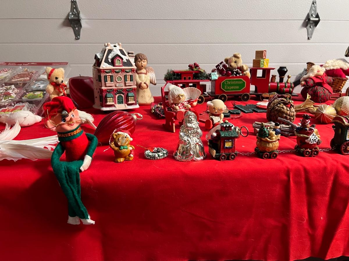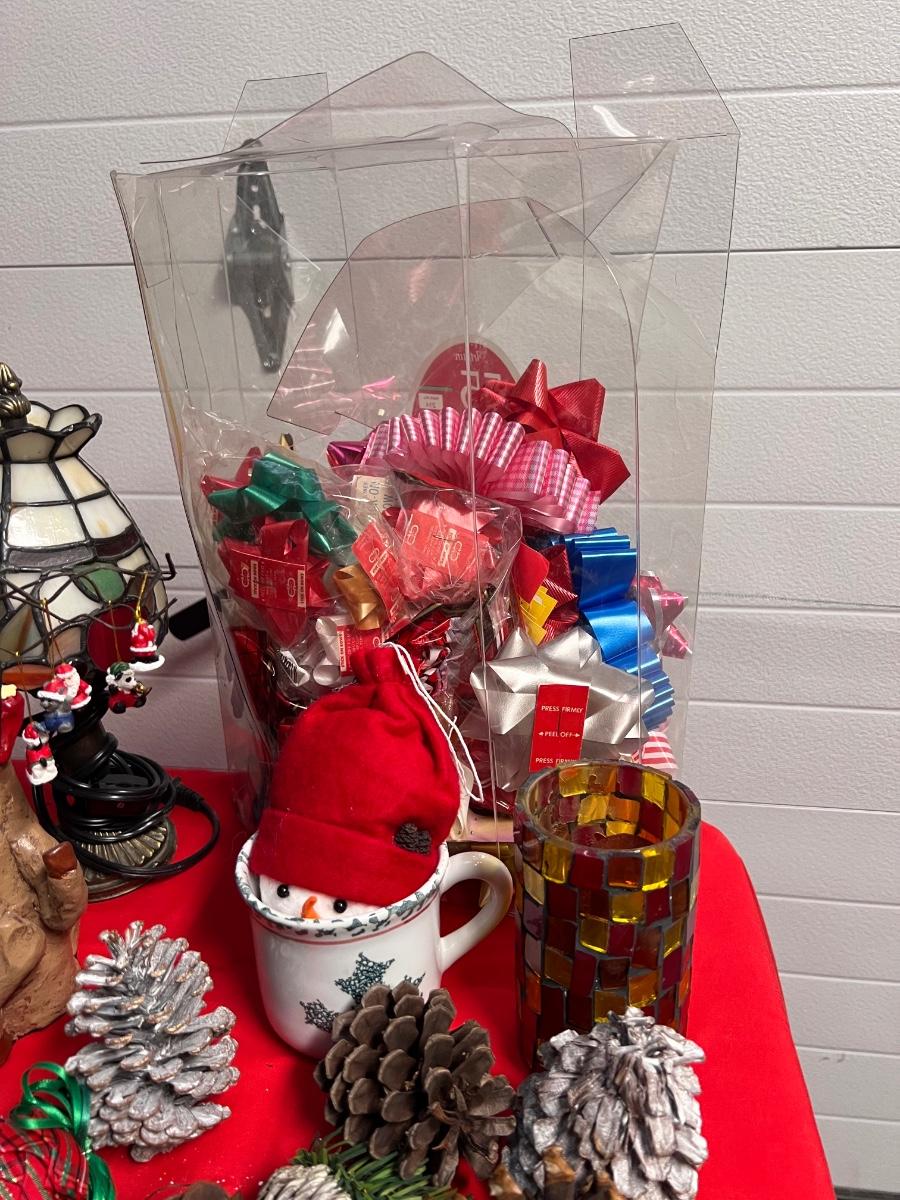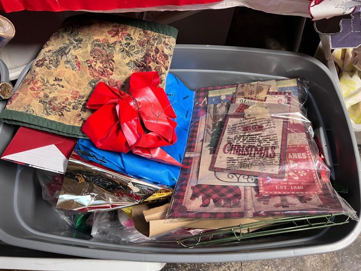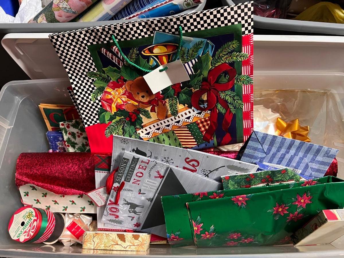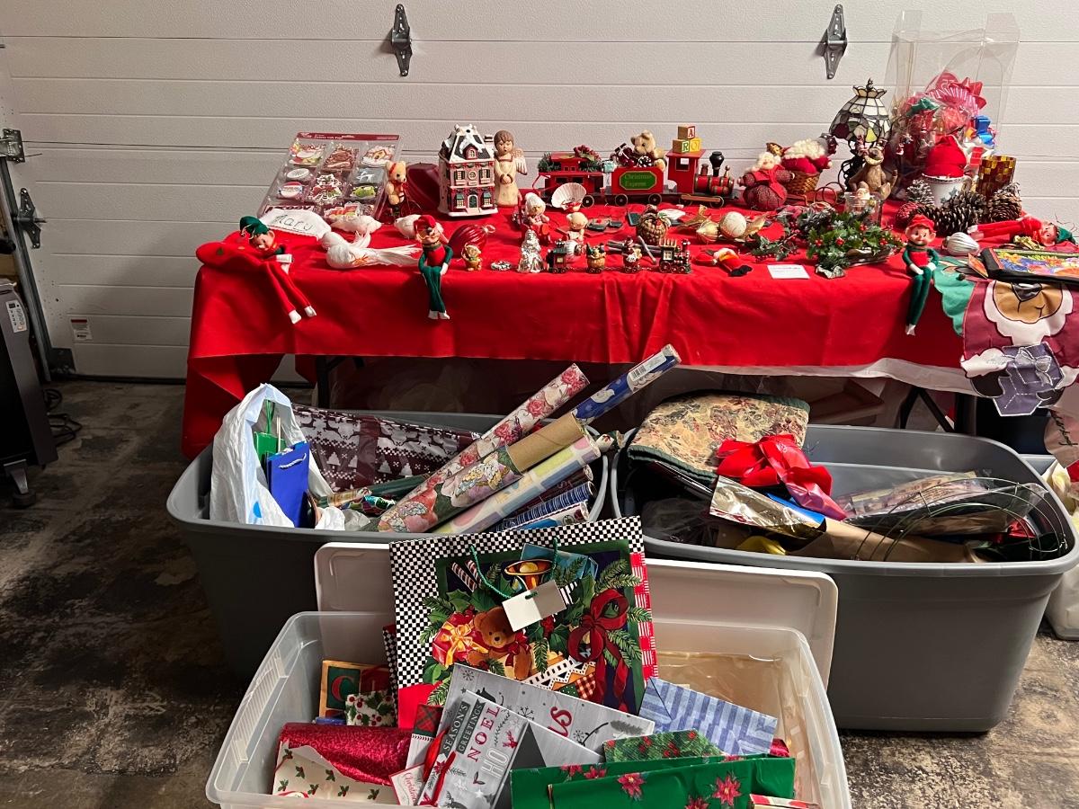 Lot of Christmas decorations and different holiday gift wrap supplies.