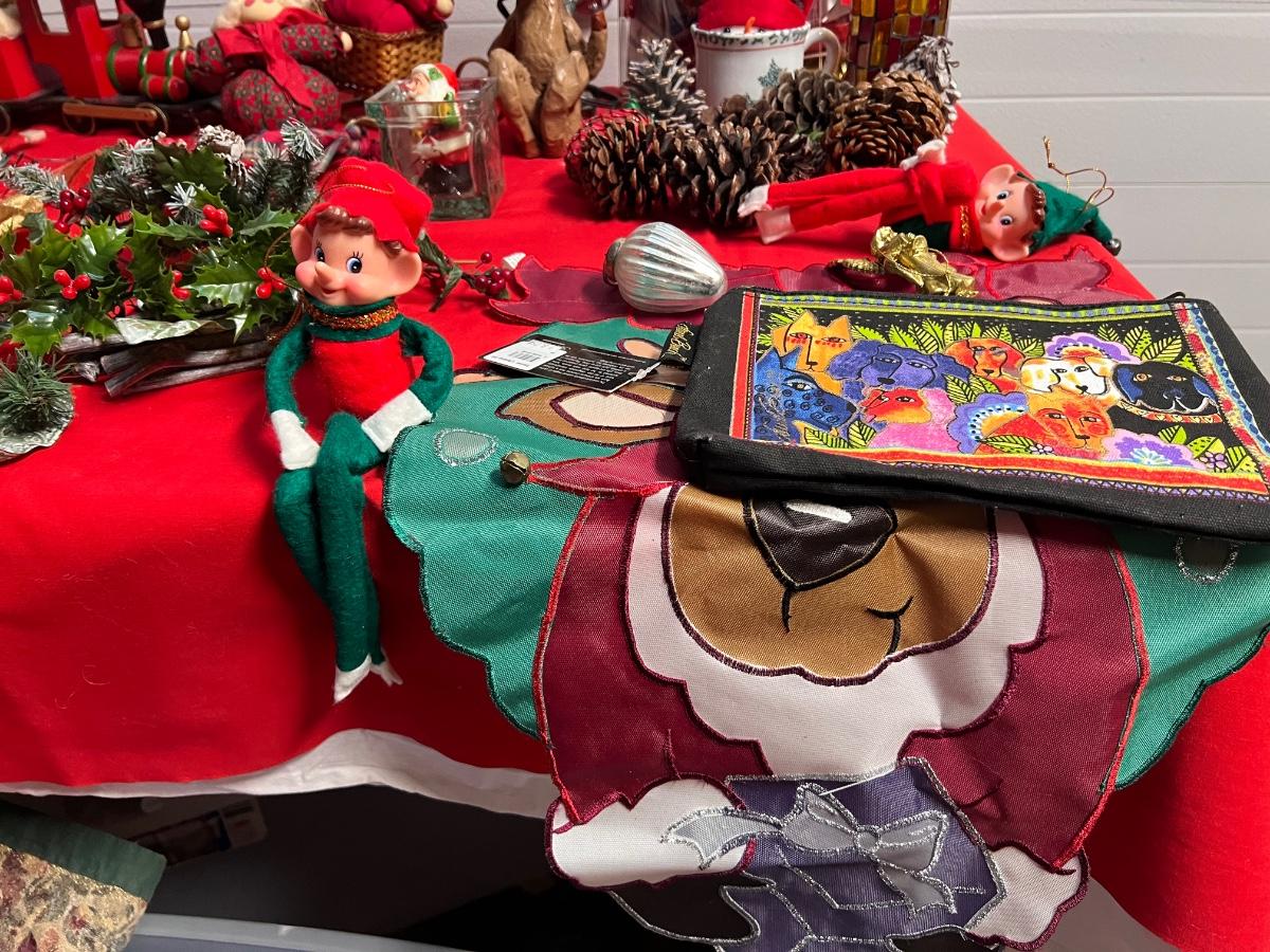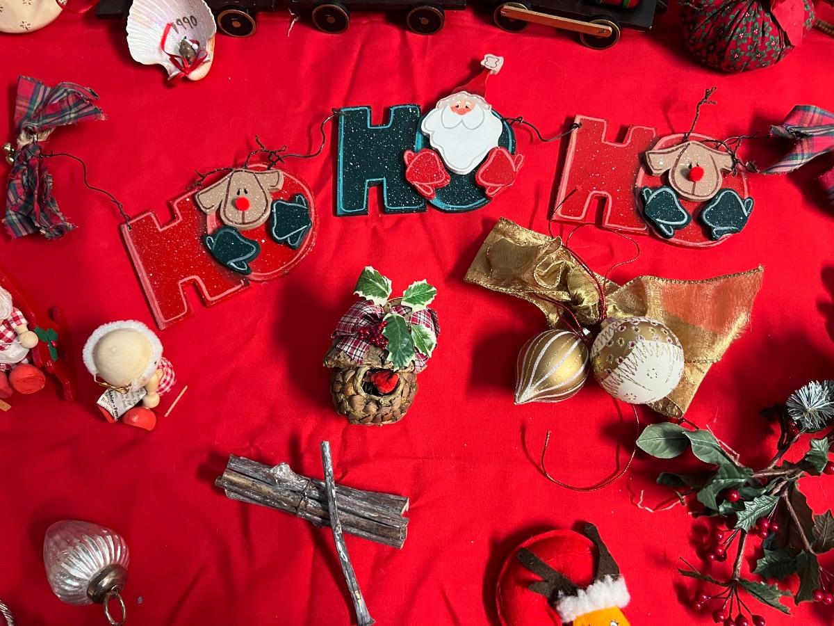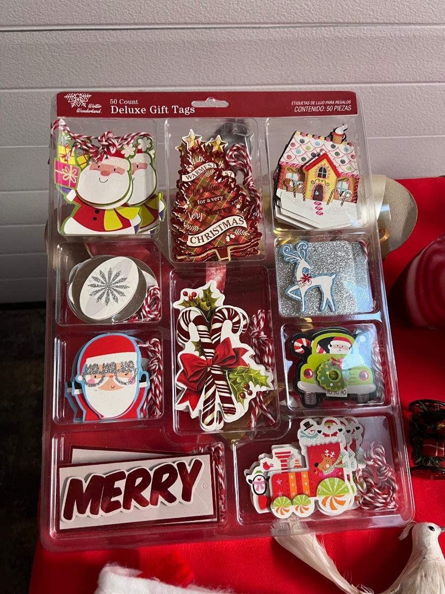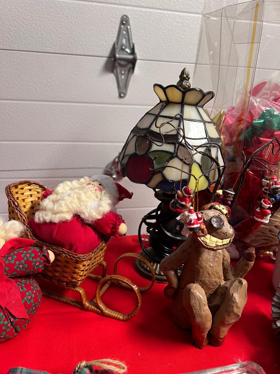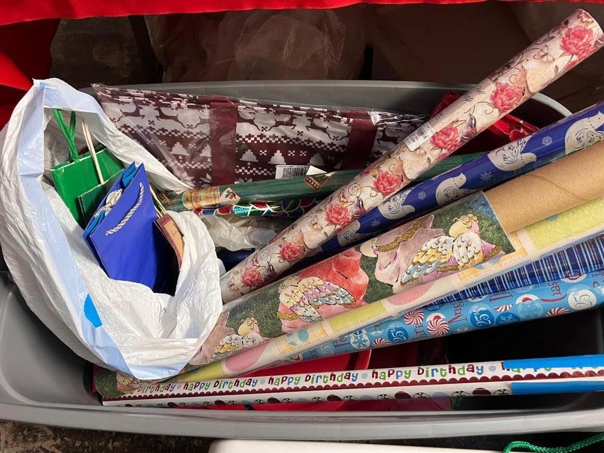 Lot of Christmas decorations and different holiday gift wrap supplies.