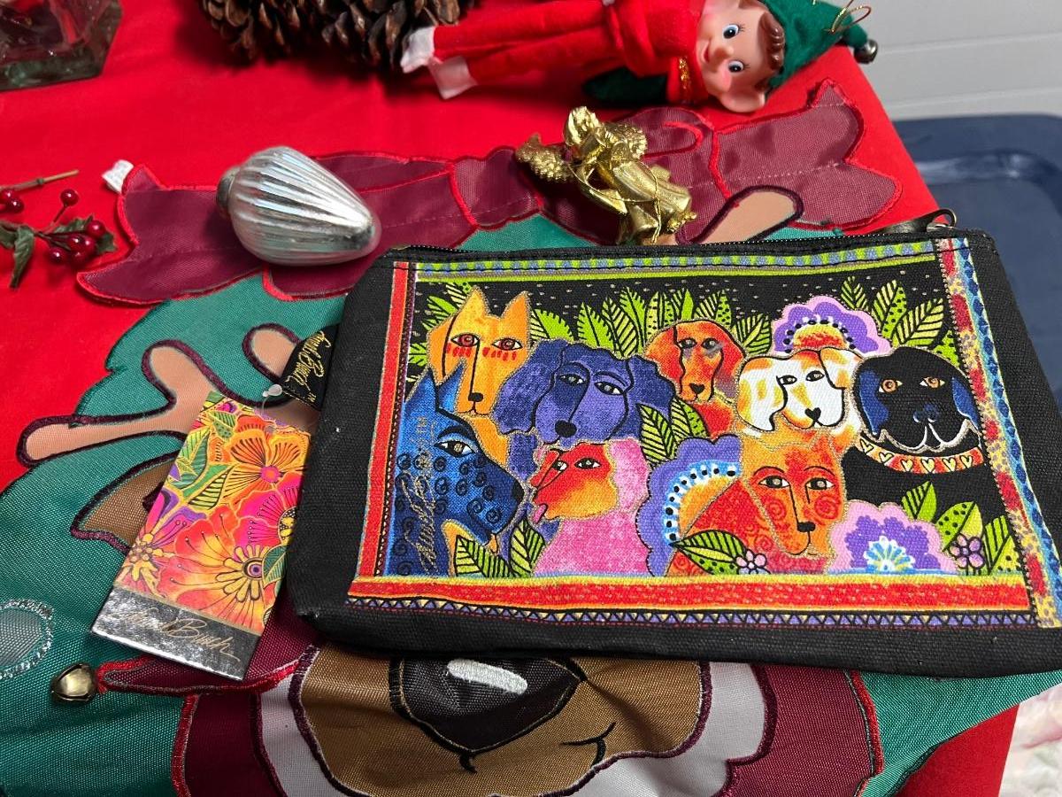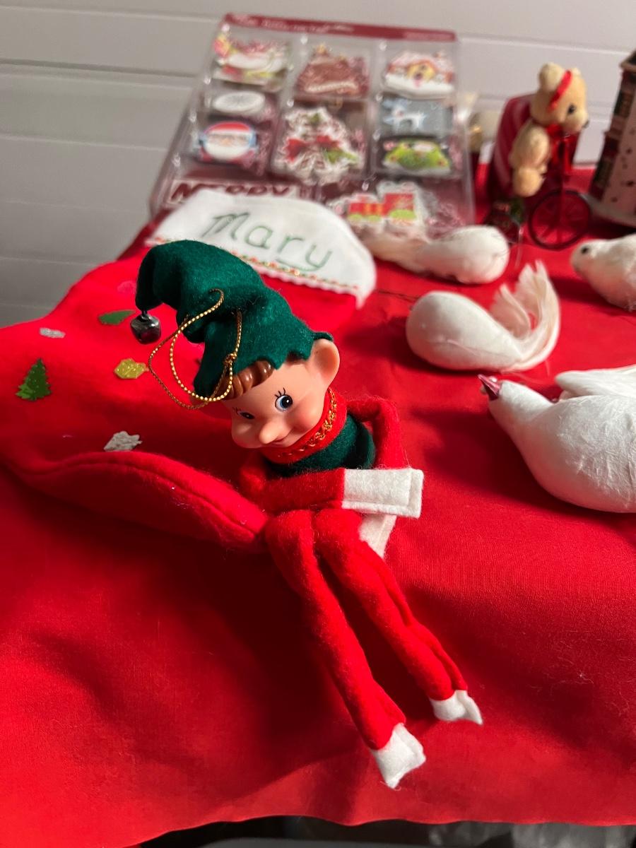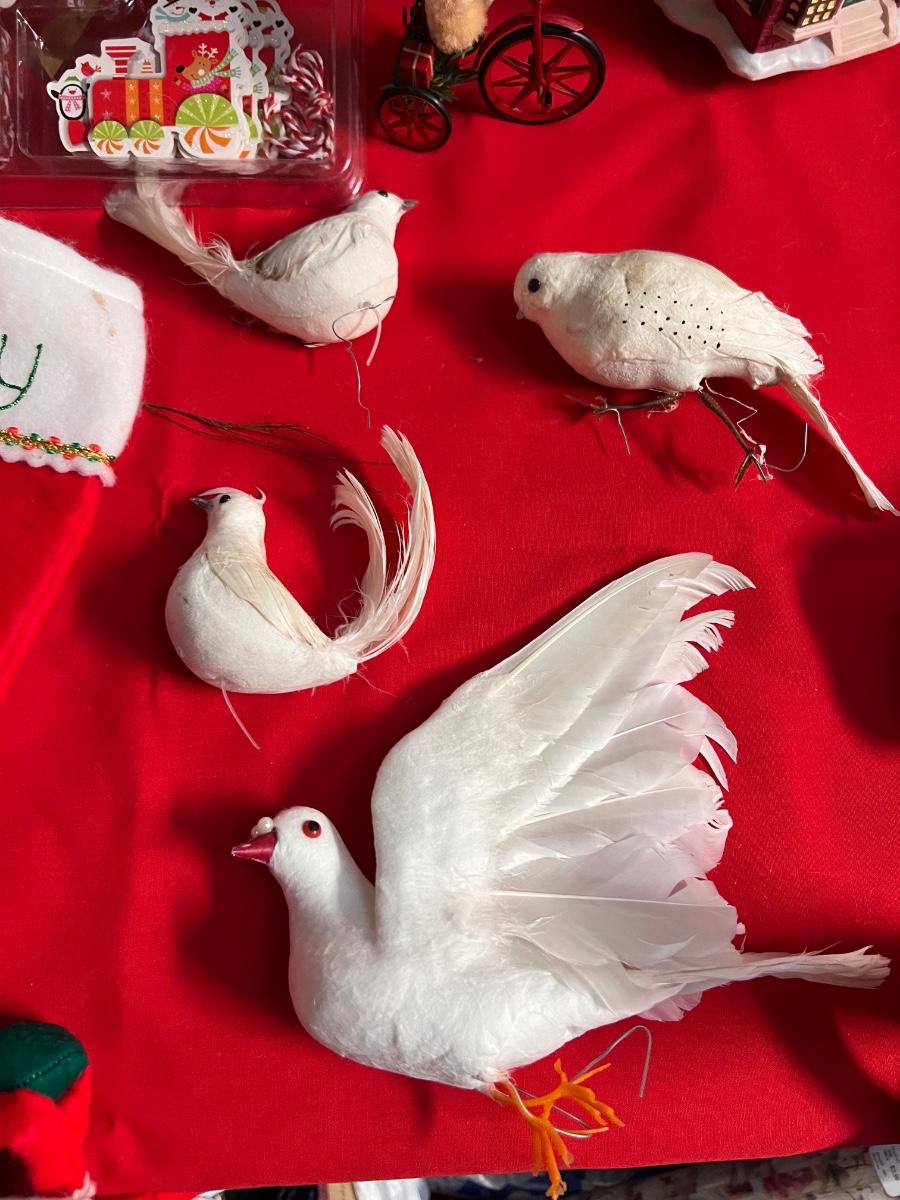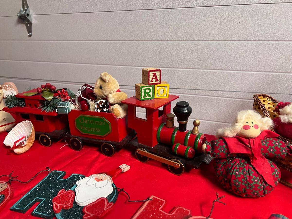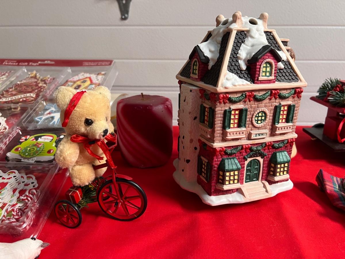 Lot of Christmas decorations and different holiday gift wrap supplies.