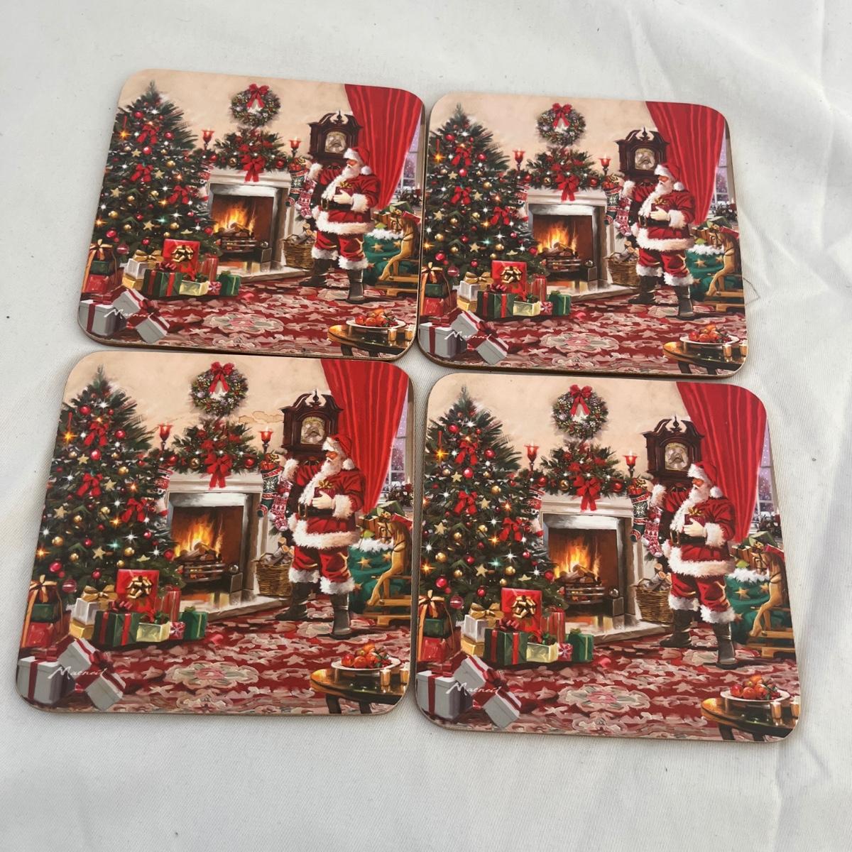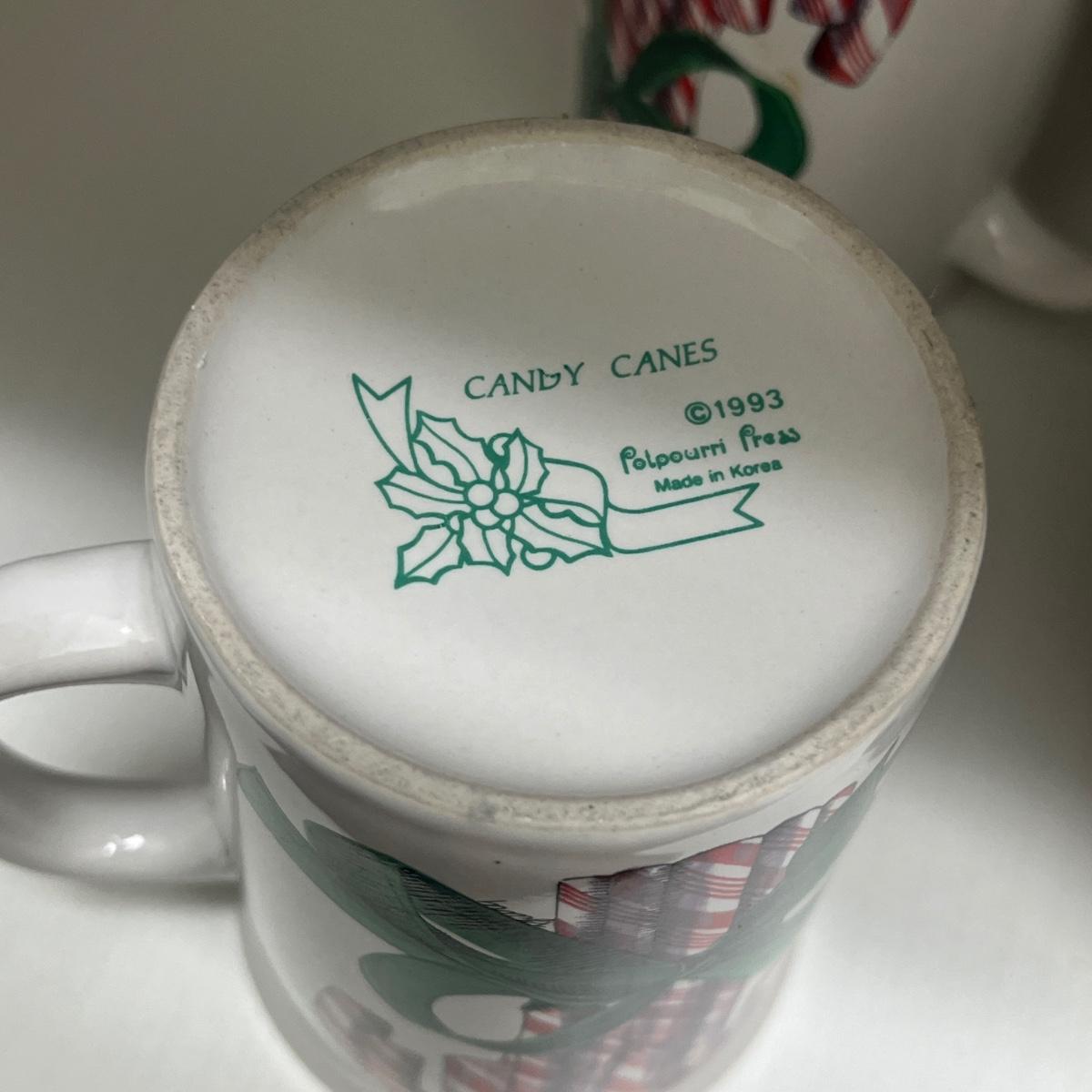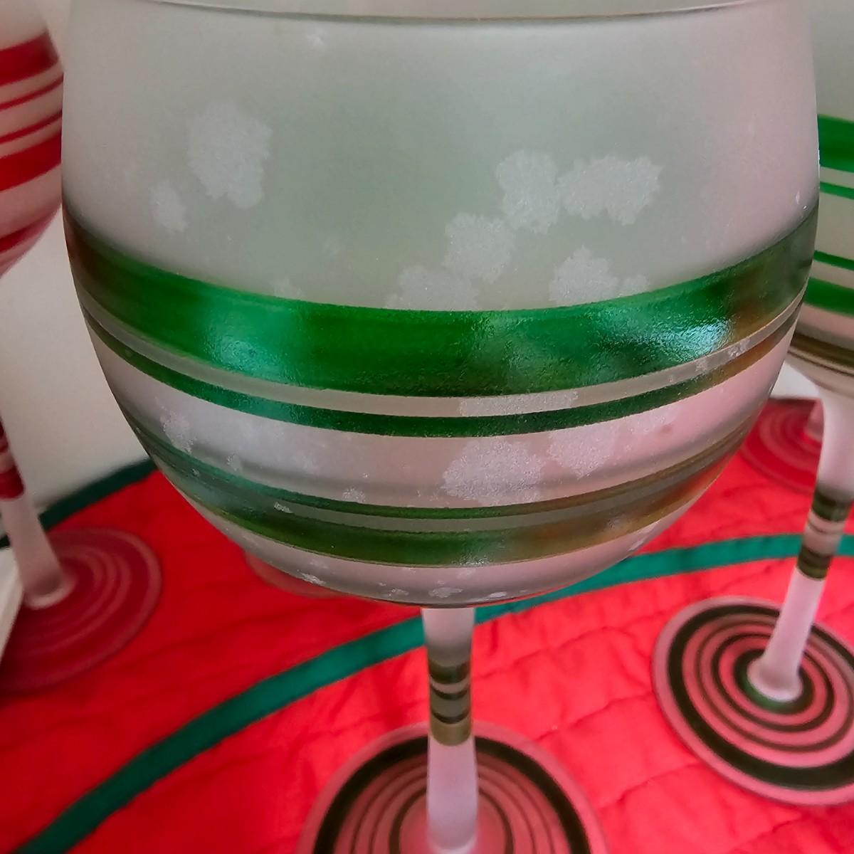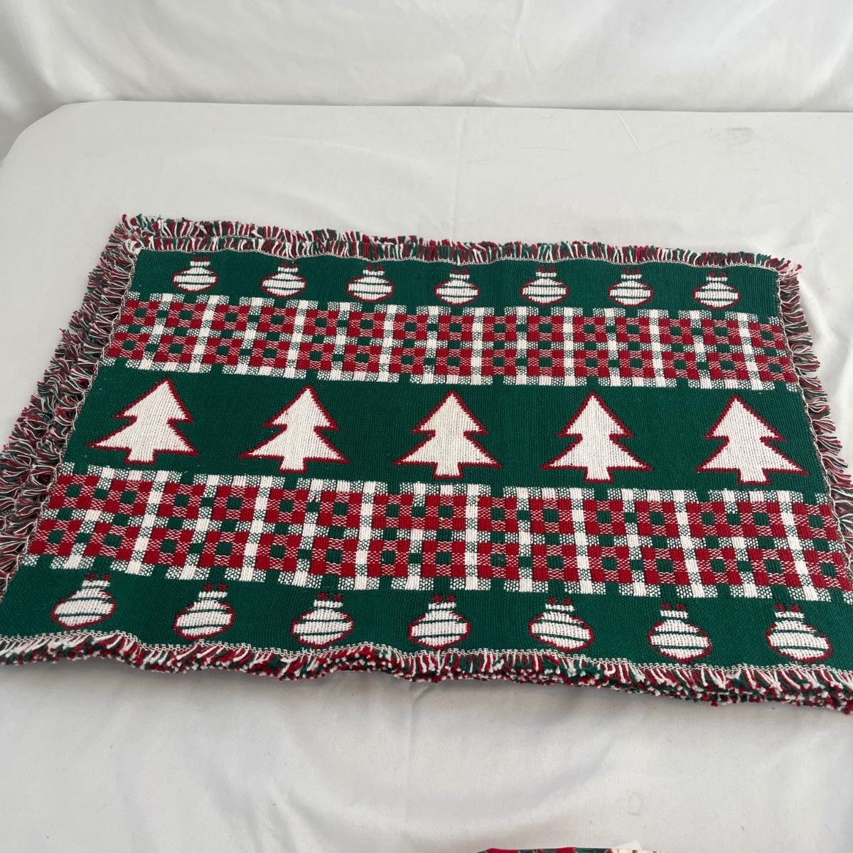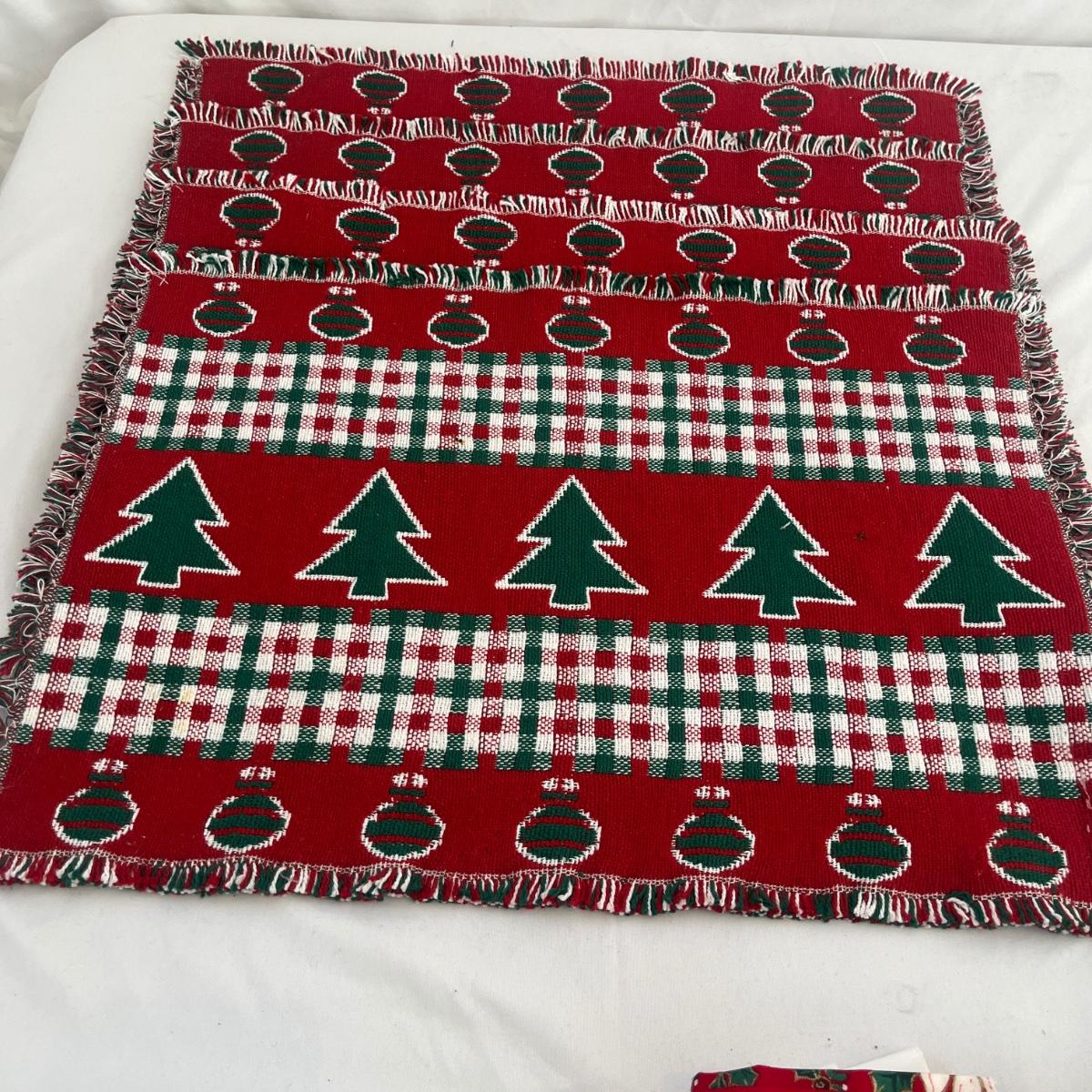 Lot includes eight spiral design glasses, eight ceramic Christmas tree napkin rings, six candy cane coffee mugs, four glass mugs, two sets of four placemats, a dish drying mat, four cork coasters and four plastic coasters. Dish drying mat measures 15” x 19”. One cloth has stain and green and red goblets have some discoloration on the frosted tops. See photos for details.