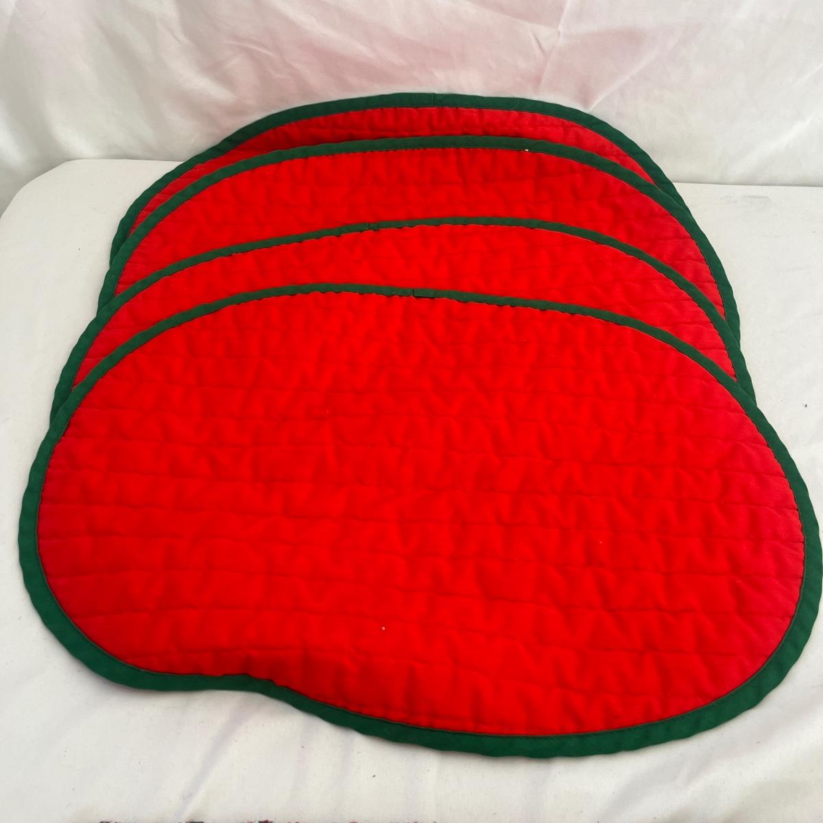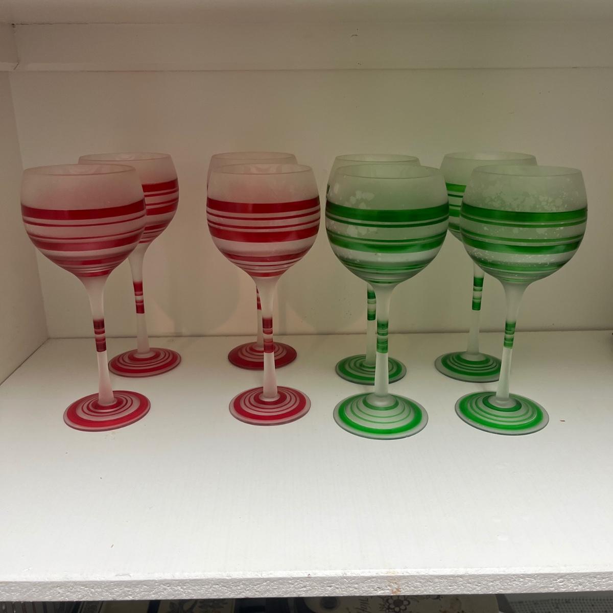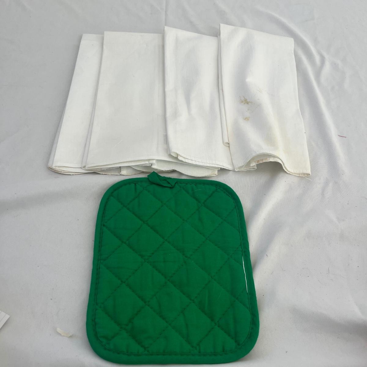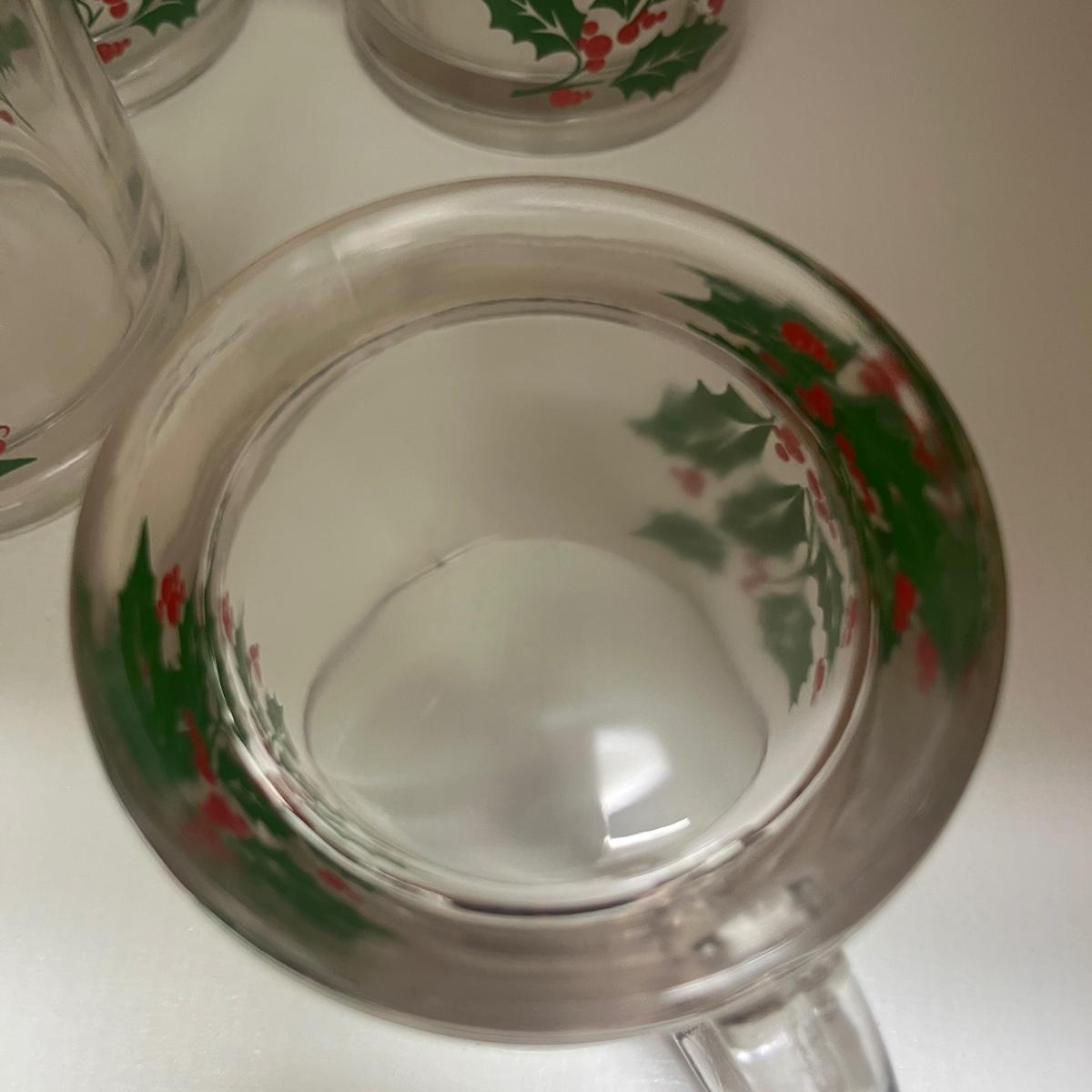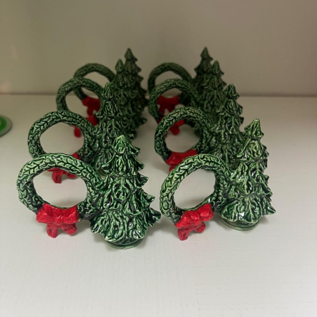 Lot includes eight spiral design glasses, eight ceramic Christmas tree napkin rings, six candy cane coffee mugs, four glass mugs, two sets of four placemats, a dish drying mat, four cork coasters and four plastic coasters. Dish drying mat measures 15” x 19”. One cloth has stain and green and red goblets have some discoloration on the frosted tops. See photos for details.