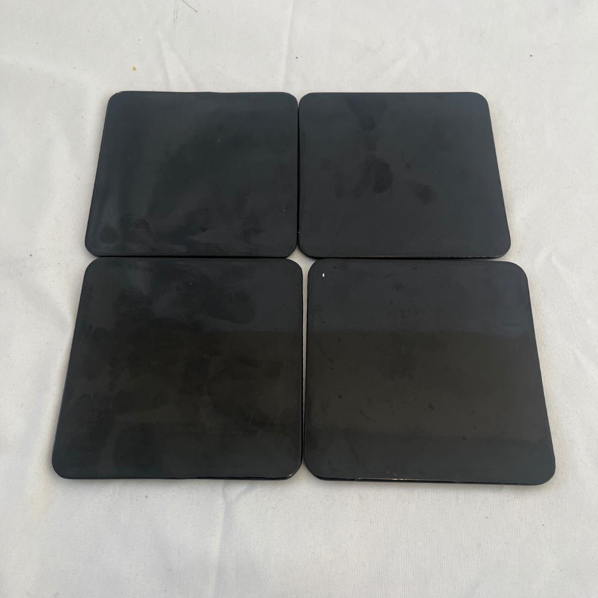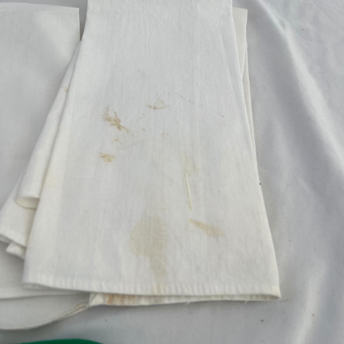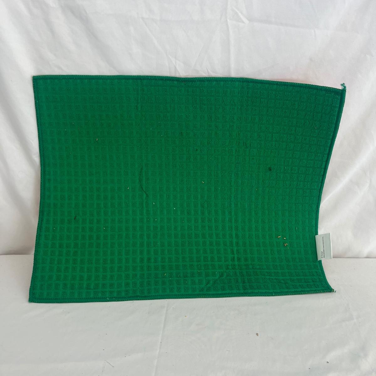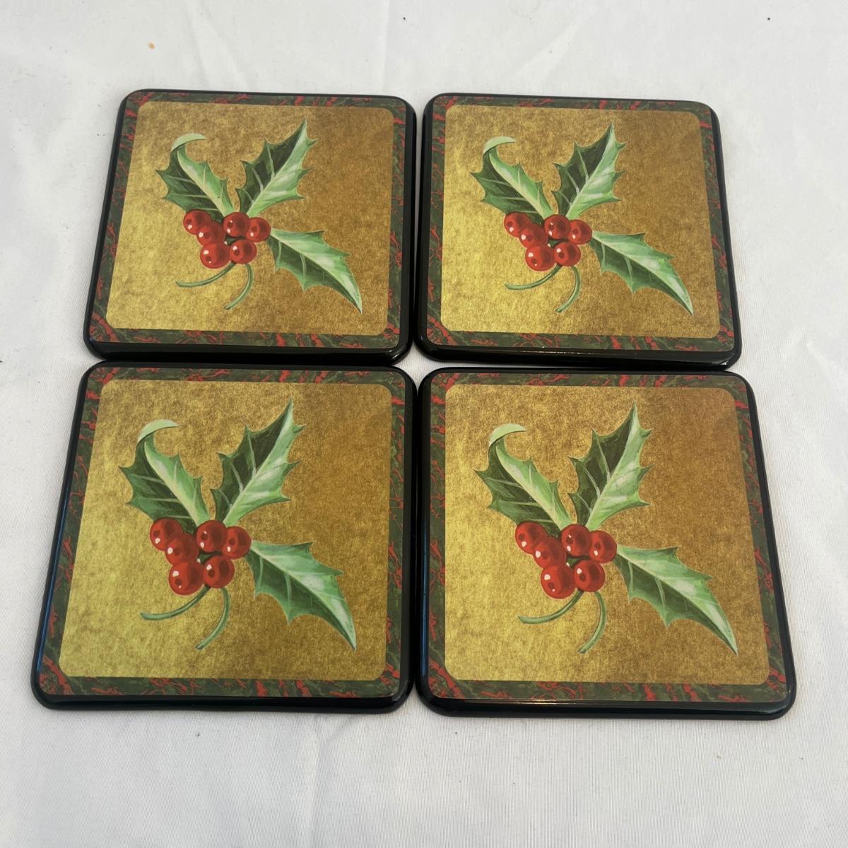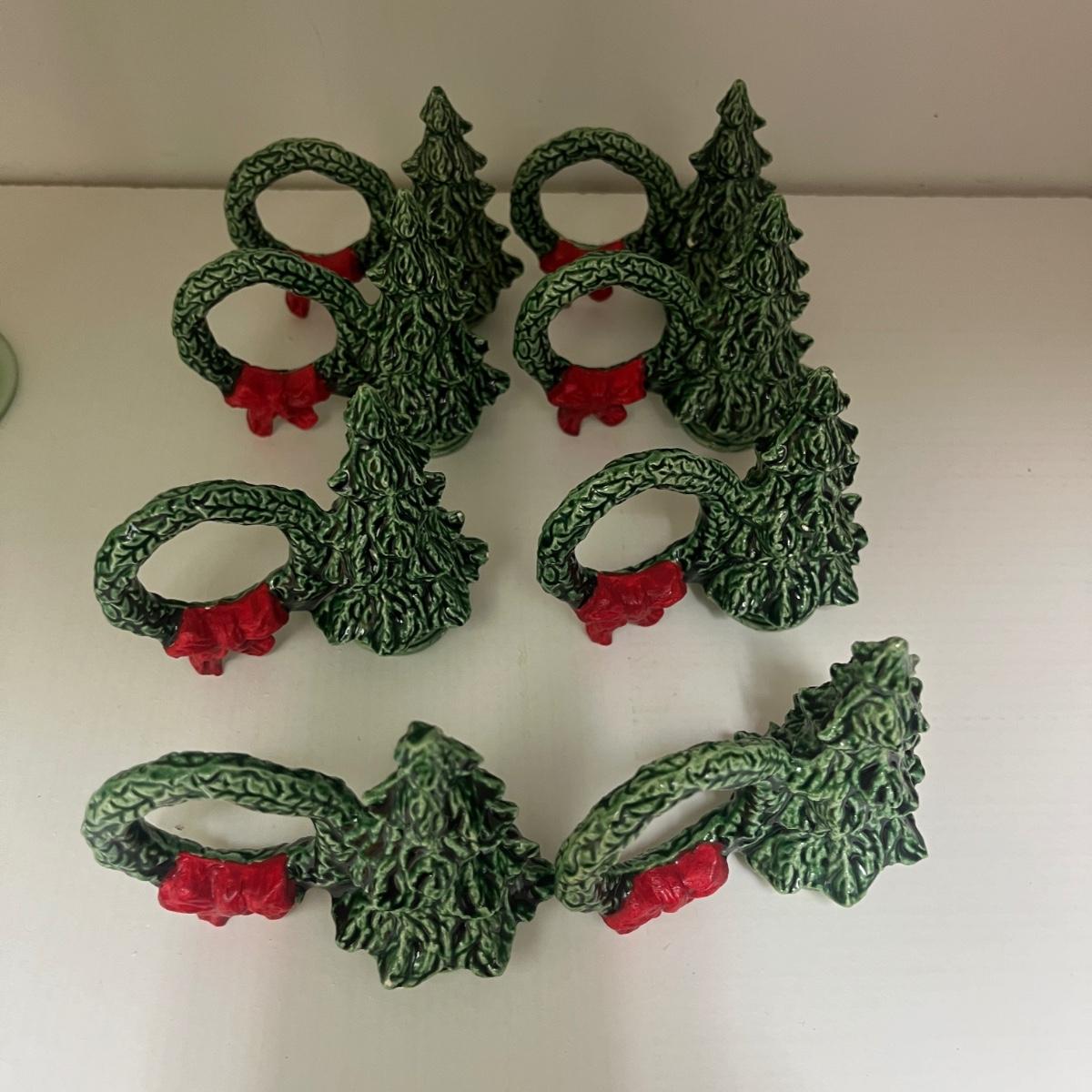 Lot includes eight spiral design glasses, eight ceramic Christmas tree napkin rings, six candy cane coffee mugs, four glass mugs, two sets of four placemats, a dish drying mat, four cork coasters and four plastic coasters. Dish drying mat measures 15” x 19”. One cloth has stain and green and red goblets have some discoloration on the frosted tops. See photos for details.