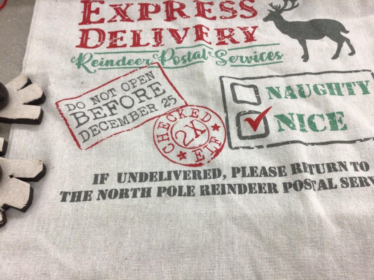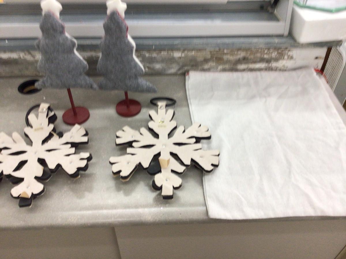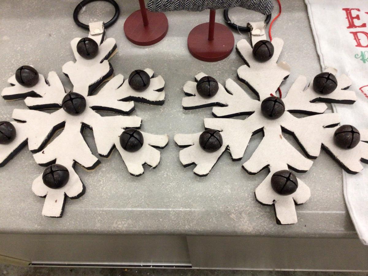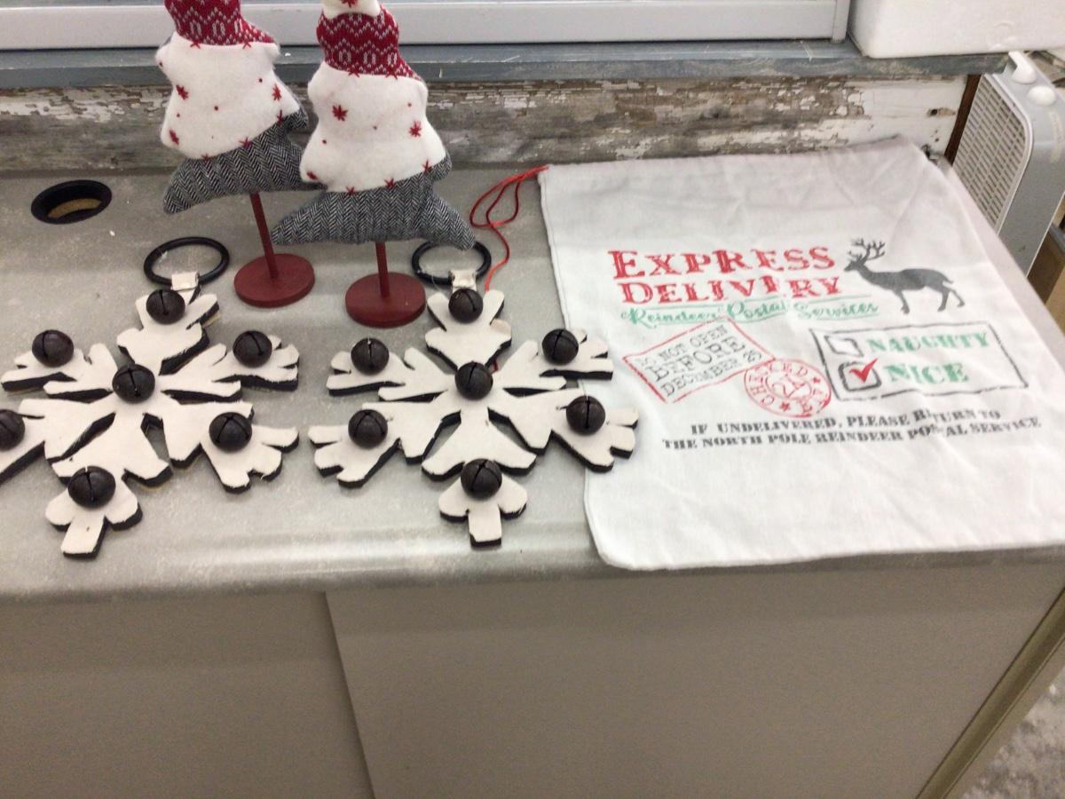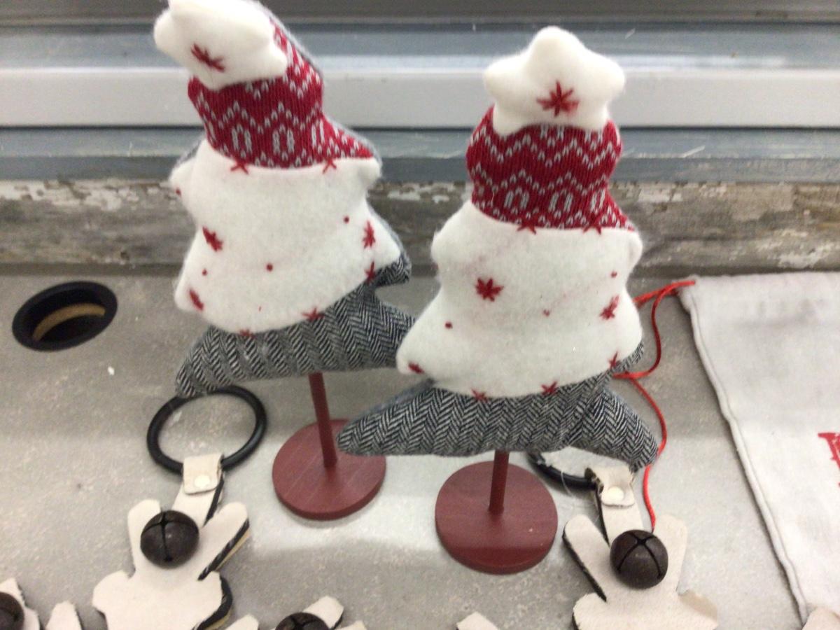 You get two large snow flakes with bells on them, two Christmas trees on stick, and express delivery canvas bag.