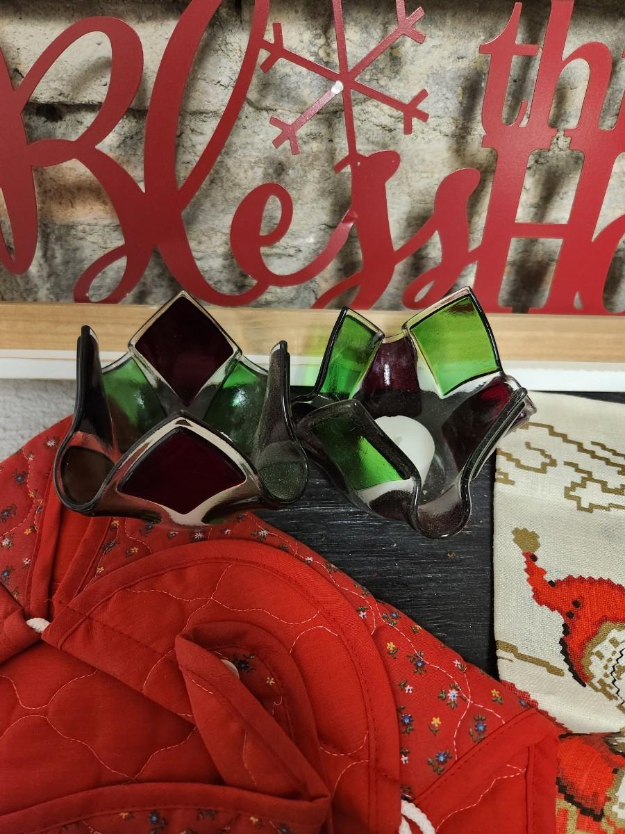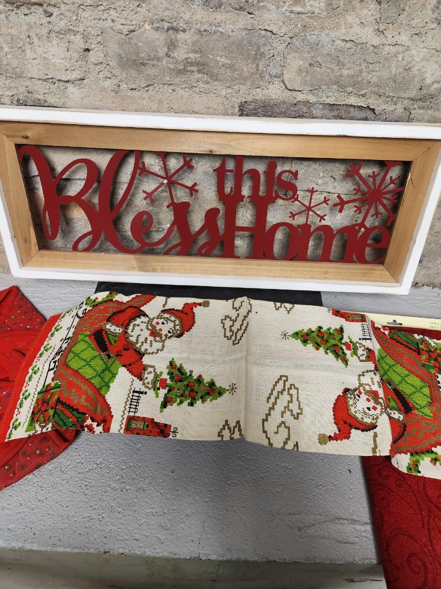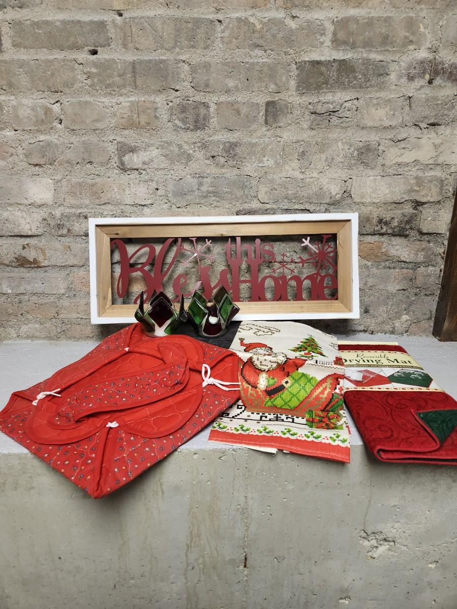 Pair of glass votive holders, metal and wood sign, vintage textiles etc etc