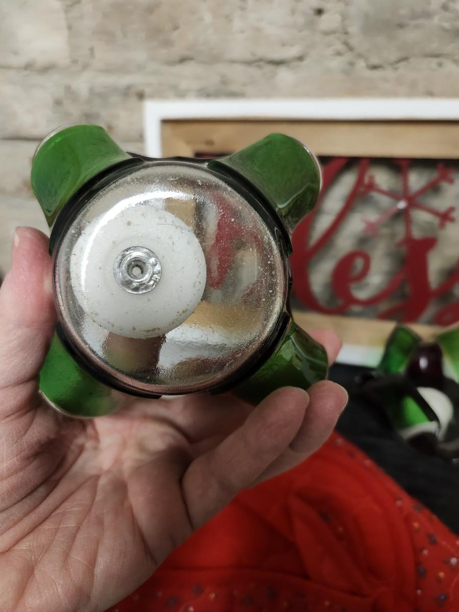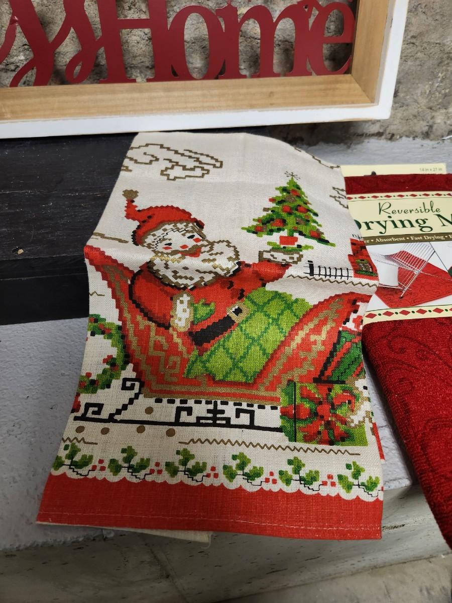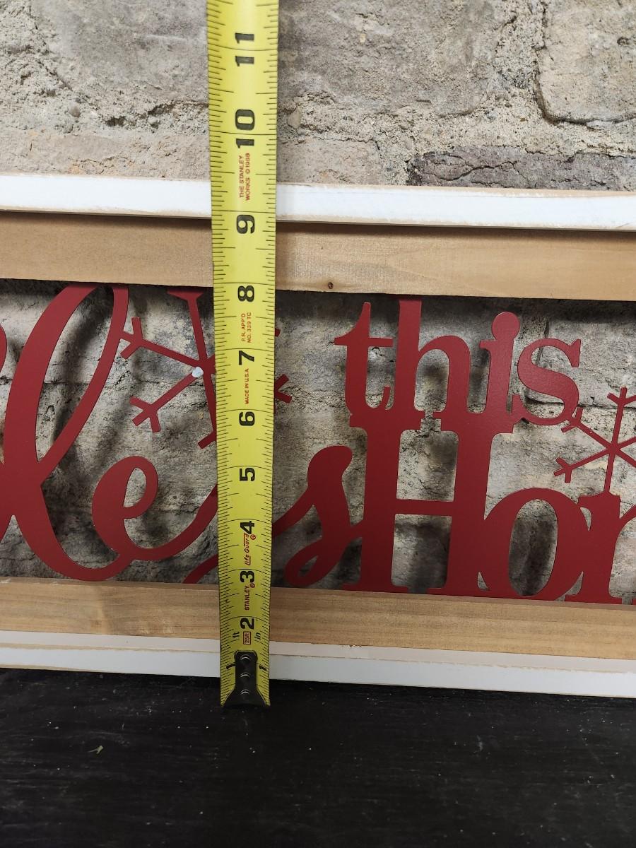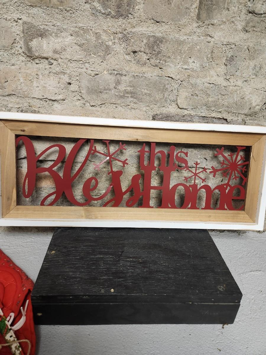 Pair of glass votive holders, metal and wood sign, vintage textiles etc etc