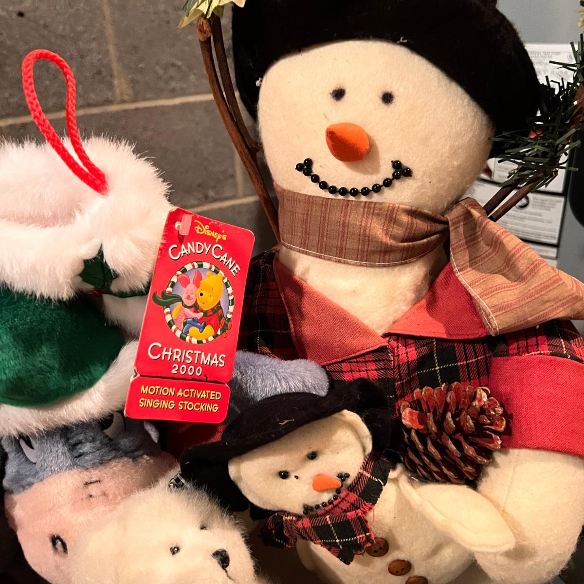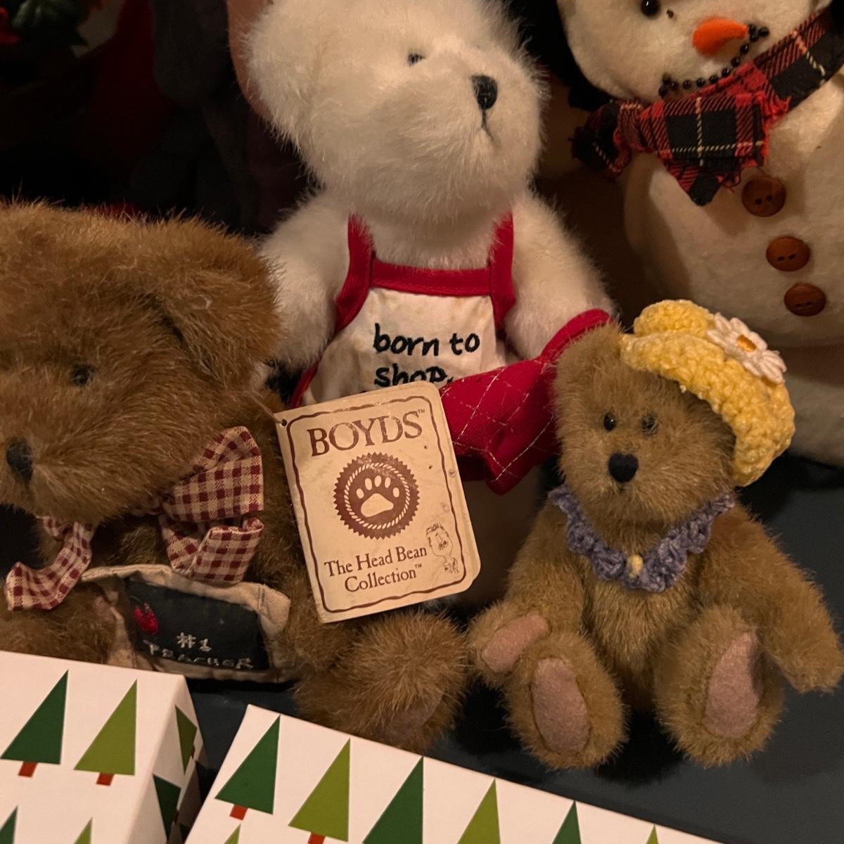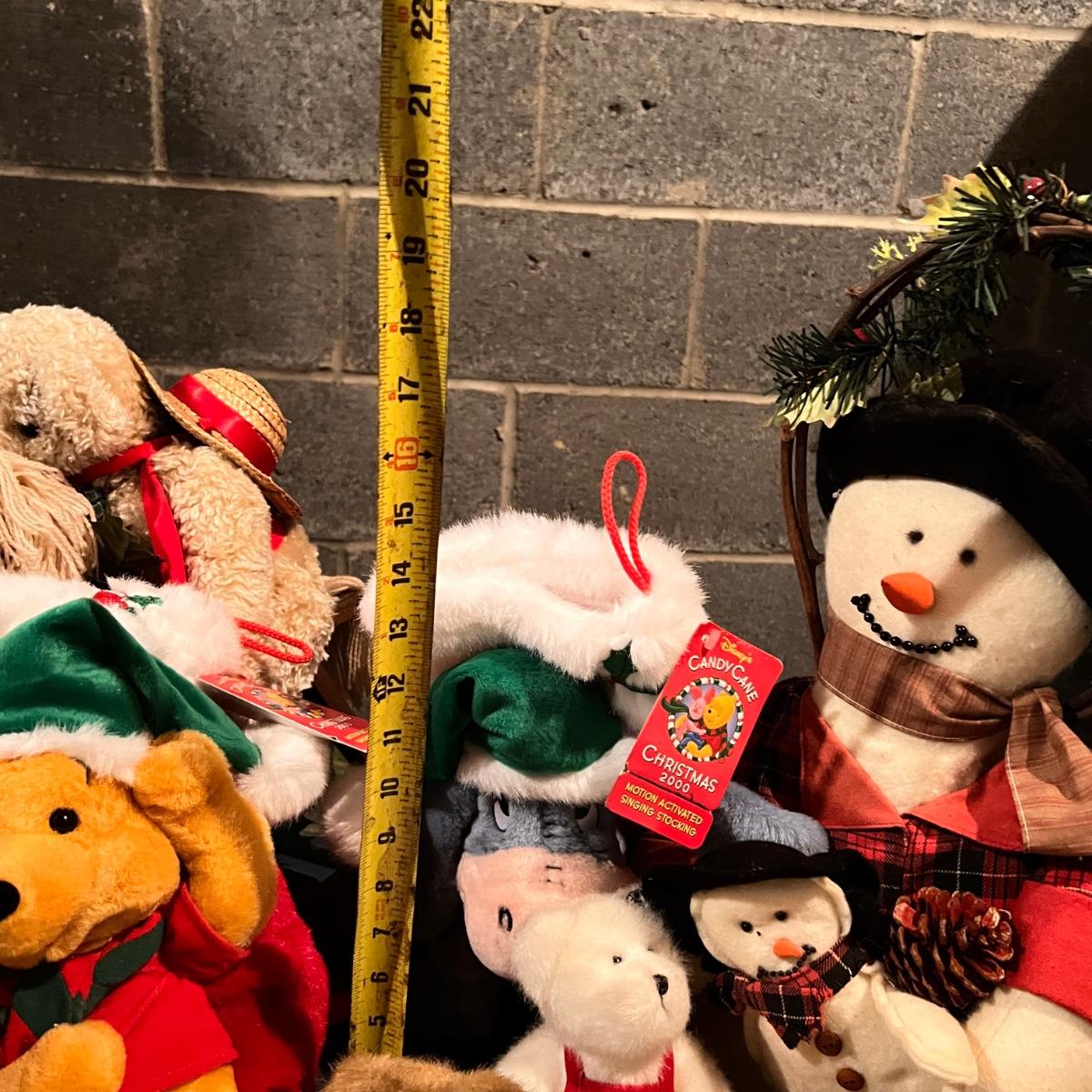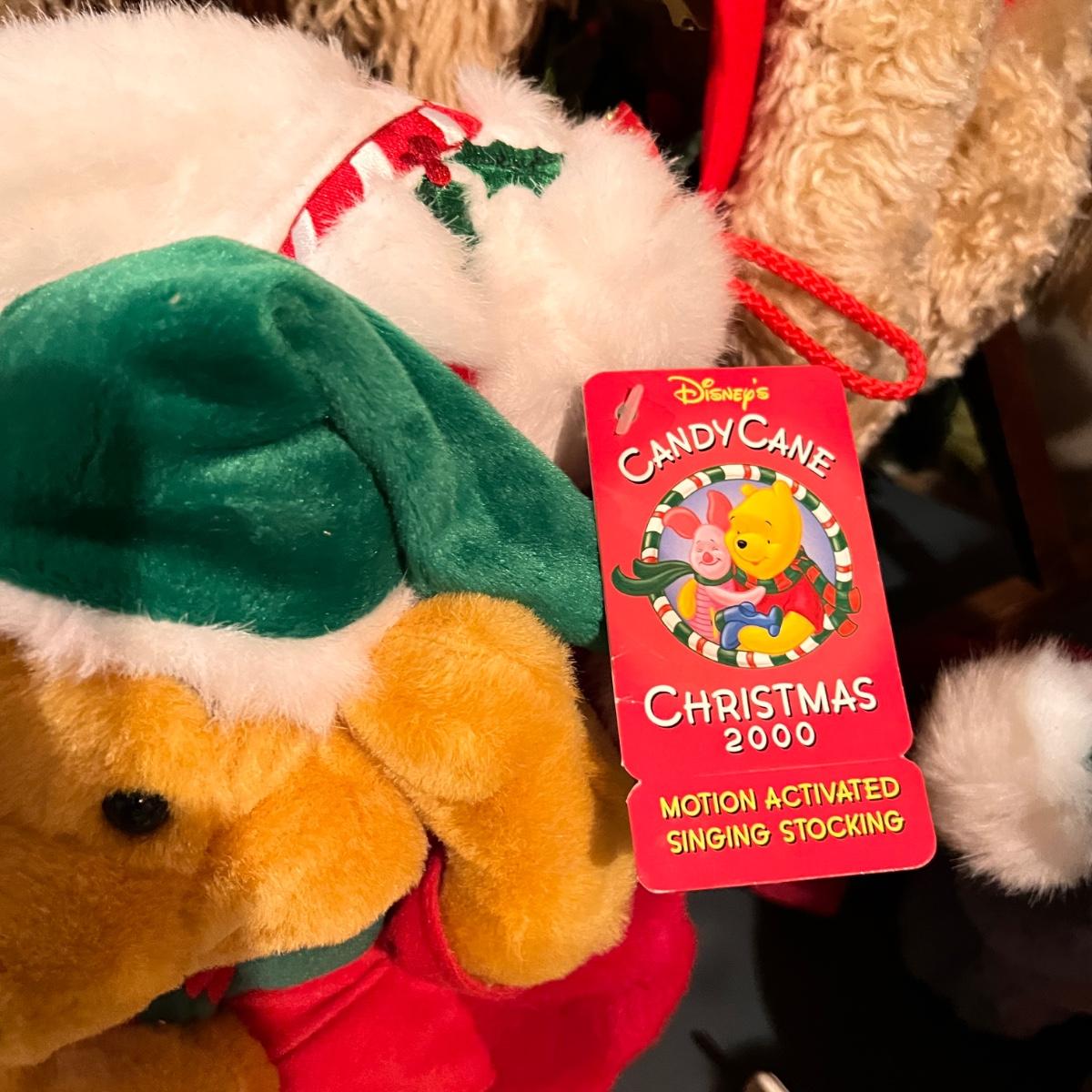 3 small Boyd’s Bears, 2 motion activated Disney stockings new with tag, boxes, canisters, etc.