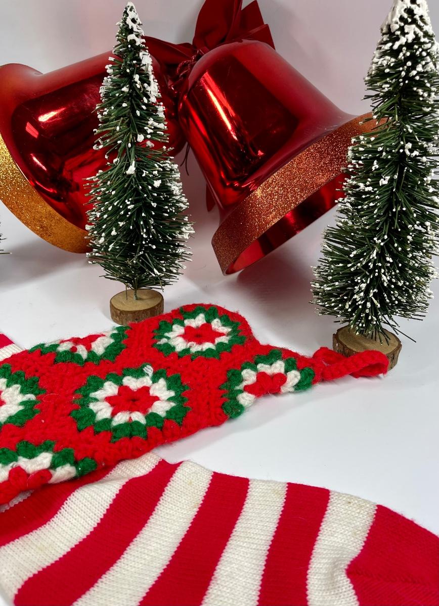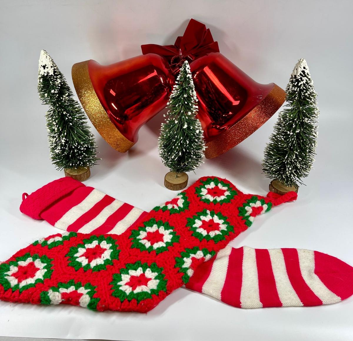 Christmas Decor Lot - trees, huge red bells, stockings