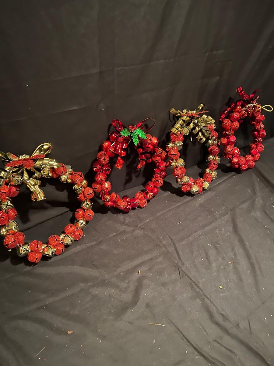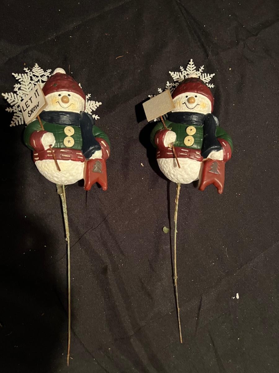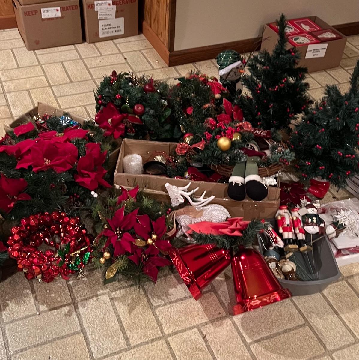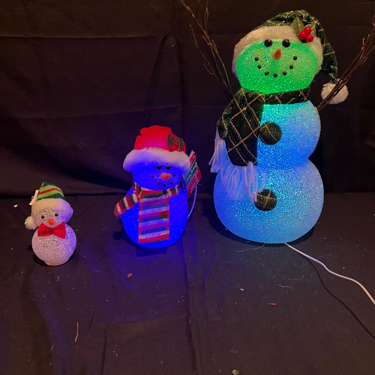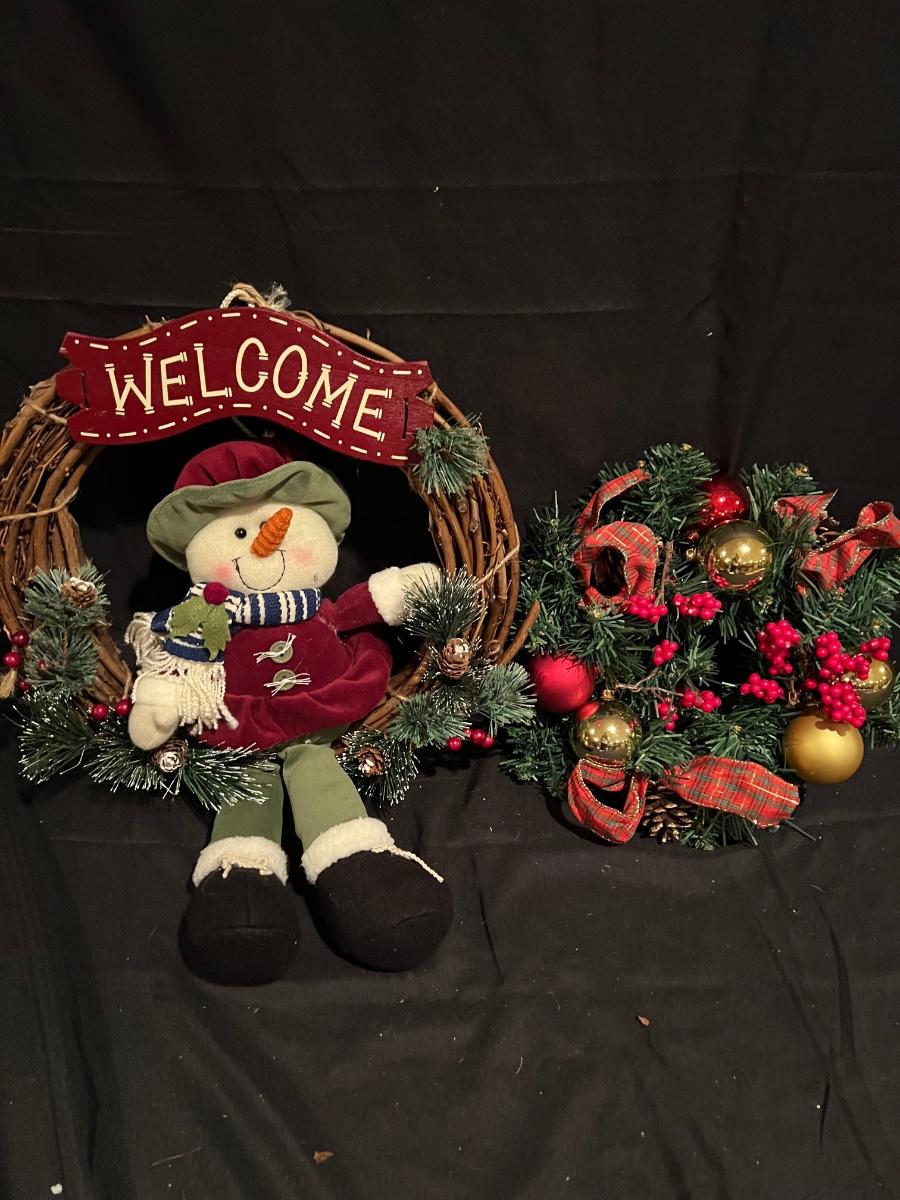 A large selection of indoor Christmas decor. Four plastic-like white doves each measure approximately 7.5” x 2” x 6”H. Four nutcracker soldiers on sticks measure approximately 2” X 2” X 12”H. two snowman on sticks measures approximately 2” X 2” X 12”H. for ceramic snowman figurines measuring approximately 2”D X 5”H. Two Christmas Bell doorknob ornaments and two holiday wreaths. The larger wreath measures approximately 13”D and the smaller one approximately 9”D. Four bell wreaths measure approximately 10”D each. two reindeer sculptures, The standing one measures approximately 9” X 3” X 12”H and the smaller one is 10” X 3.5L x 7.5”H. Three light up snowmen (two of the three powered on when plugged in, it would be easy assume batteries are out on smallest one) The largest is 7”D X 14”H and the smallest is 3”D X 5”H. Two plastic Christmas trees in Santa Claus boots measure approximately 13”D x 26”H. A large plastic poinsettia tabletop decoration measures approximately 23” X 12” X 17”H. One centerpiece in a basket measures approximately 14”D X 16”H. Six ornamental Christmas Ball and Holly Leif candle embellishments measure approximately 13”D each. A long wall sculpture with pinecones and bent sticks and greenery measures approximately 10” X 4” X 28”H. also included is a Willow Tree, angel of Christmas spirit sculpture and a Rhodes Studio “Village Lights” sculpture that turns on when plugged in. Appearing new-in-box “JOY” yard letters. A large centerpiece with three battery operated lights (unable to test lights, likely batteries are out) measures 25” X 10” X 11”H. A Christmas box centerpiece measures approximately 17 “X 7”X 7”H. it also has the ability to light up, but was unable to test it as battery might be out. A three-candlelight centerpiece, also unable to verify electric connection and a hanging poinsettia basket. Ten small wreathes approximately 6”D.