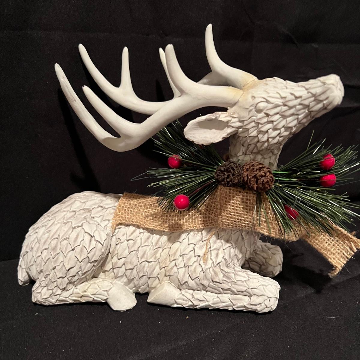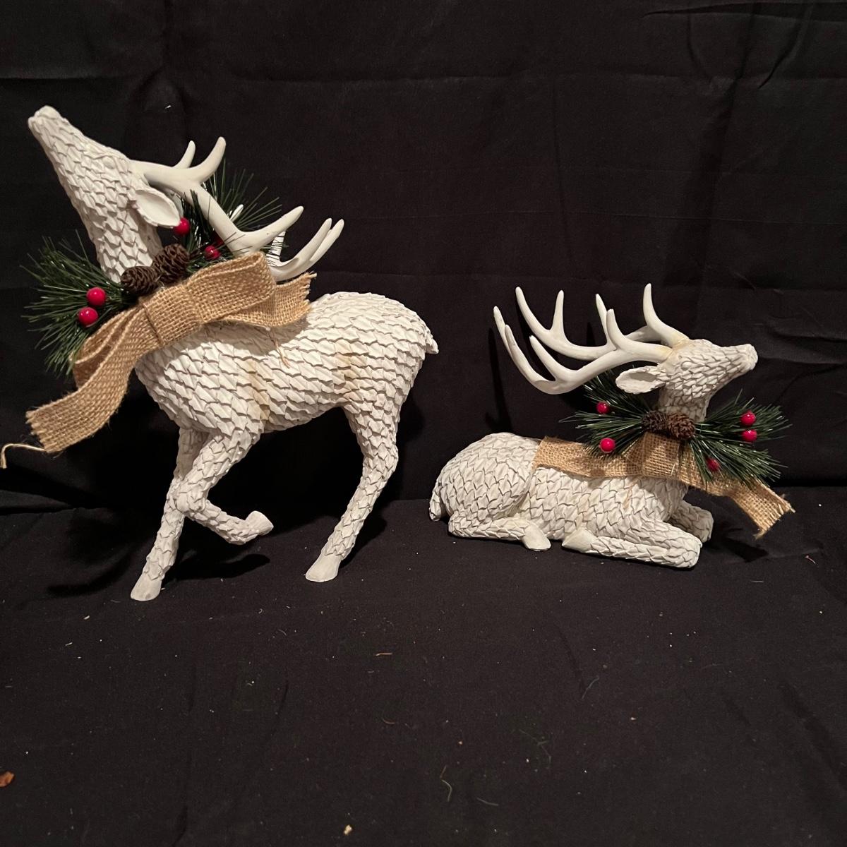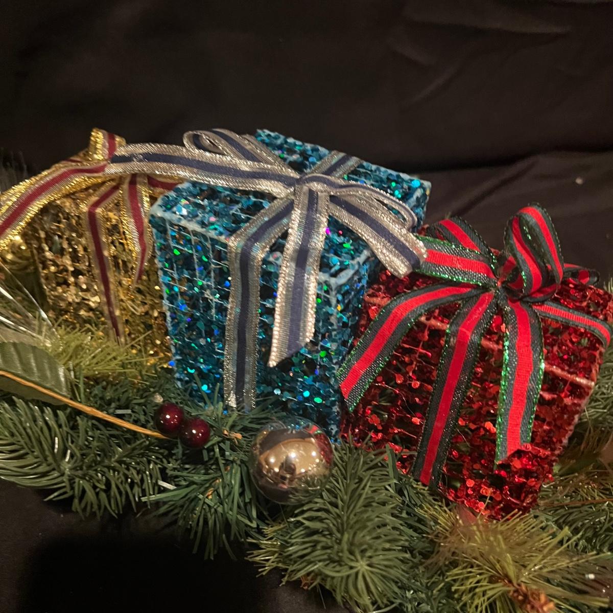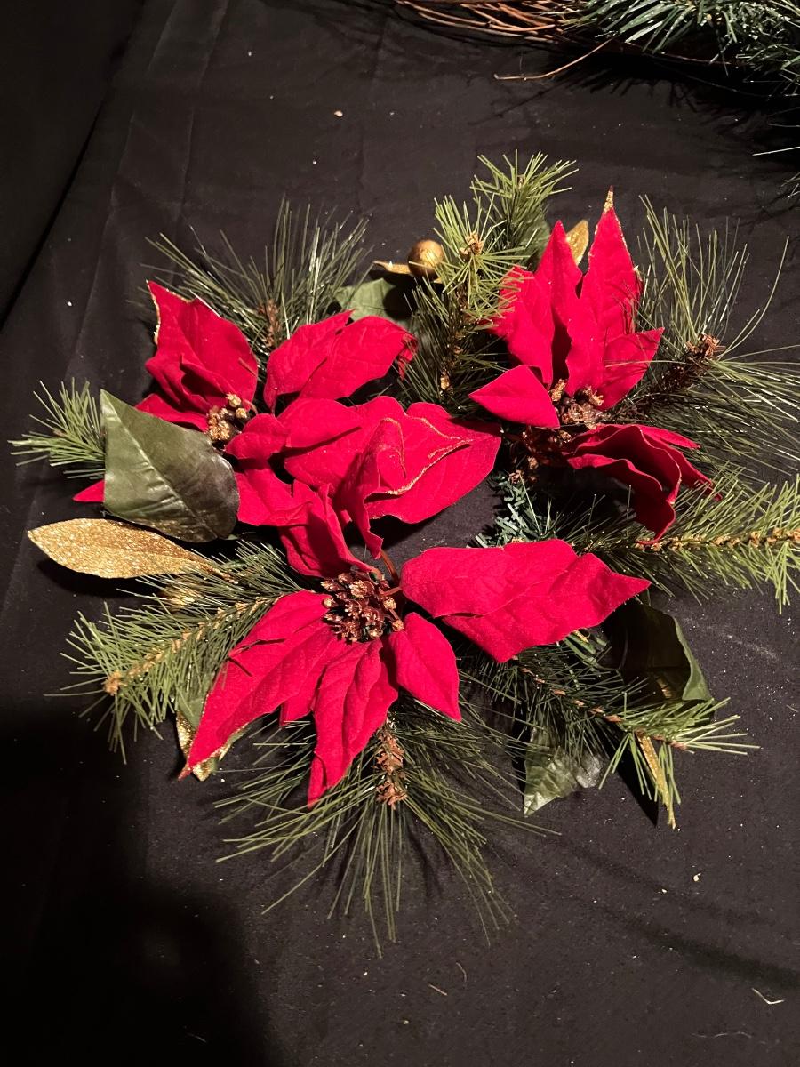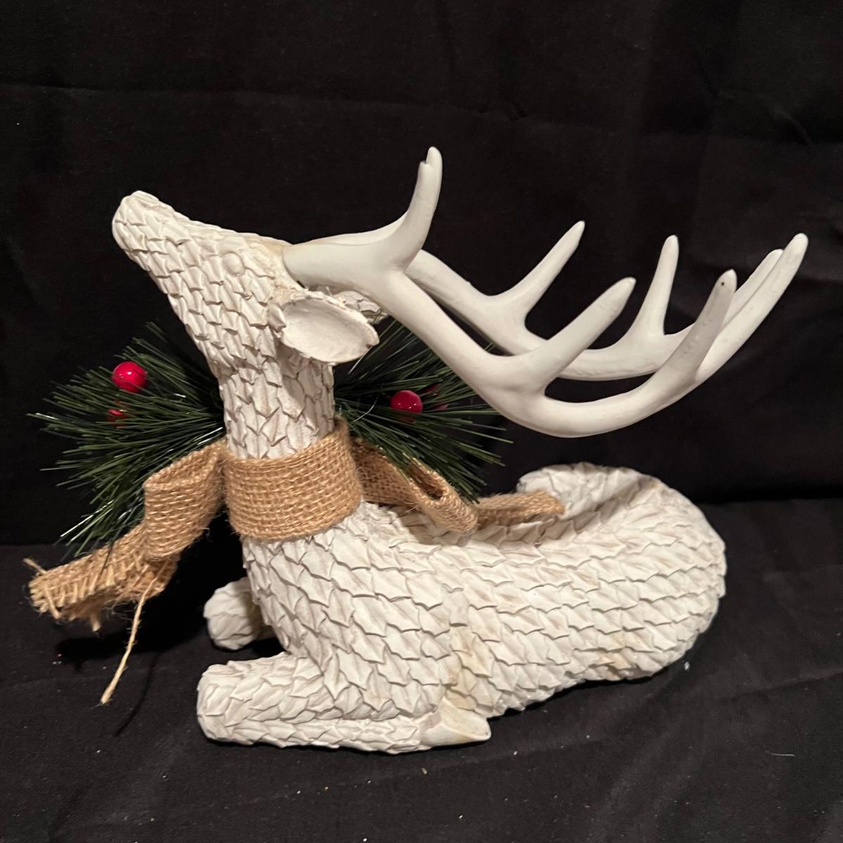 A large selection of indoor Christmas decor. Four plastic-like white doves each measure approximately 7.5” x 2” x 6”H. Four nutcracker soldiers on sticks measure approximately 2” X 2” X 12”H. two snowman on sticks measures approximately 2” X 2” X 12”H. for ceramic snowman figurines measuring approximately 2”D X 5”H. Two Christmas Bell doorknob ornaments and two holiday wreaths. The larger wreath measures approximately 13”D and the smaller one approximately 9”D. Four bell wreaths measure approximately 10”D each. two reindeer sculptures, The standing one measures approximately 9” X 3” X 12”H and the smaller one is 10” X 3.5L x 7.5”H. Three light up snowmen (two of the three powered on when plugged in, it would be easy assume batteries are out on smallest one) The largest is 7”D X 14”H and the smallest is 3”D X 5”H. Two plastic Christmas trees in Santa Claus boots measure approximately 13”D x 26”H. A large plastic poinsettia tabletop decoration measures approximately 23” X 12” X 17”H. One centerpiece in a basket measures approximately 14”D X 16”H. Six ornamental Christmas Ball and Holly Leif candle embellishments measure approximately 13”D each. A long wall sculpture with pinecones and bent sticks and greenery measures approximately 10” X 4” X 28”H. also included is a Willow Tree, angel of Christmas spirit sculpture and a Rhodes Studio “Village Lights” sculpture that turns on when plugged in. Appearing new-in-box “JOY” yard letters. A large centerpiece with three battery operated lights (unable to test lights, likely batteries are out) measures 25” X 10” X 11”H. A Christmas box centerpiece measures approximately 17 “X 7”X 7”H. it also has the ability to light up, but was unable to test it as battery might be out. A three-candlelight centerpiece, also unable to verify electric connection and a hanging poinsettia basket. Ten small wreathes approximately 6”D.