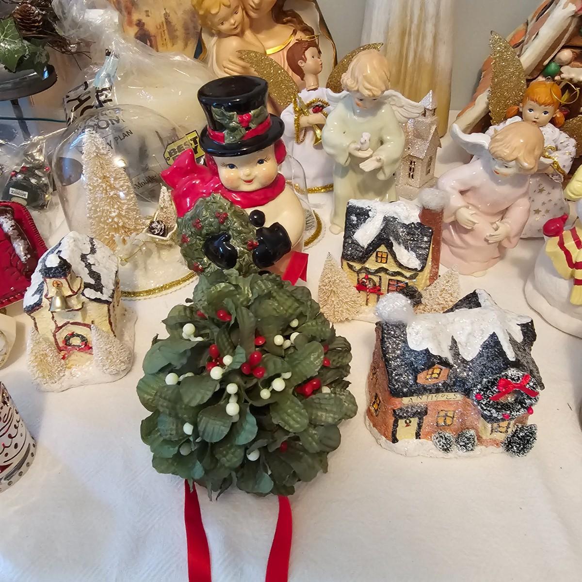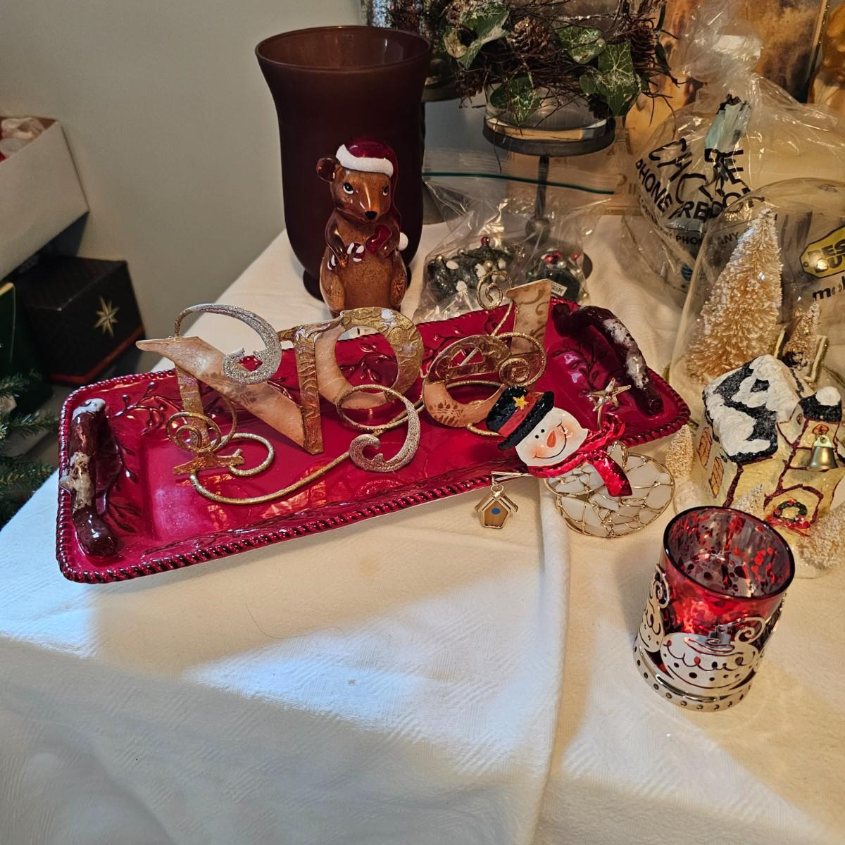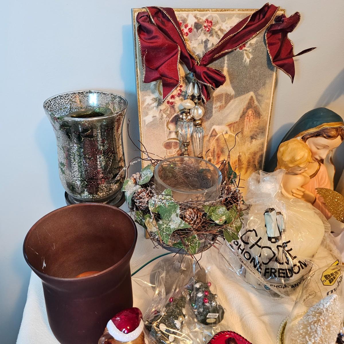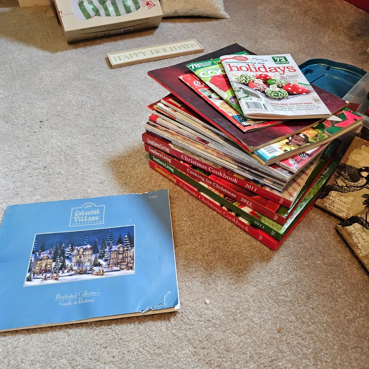 Christmas decorations for all around the house. Table sitters, candles, garland, snow globes, trees, wreaths, more. Tallest tree is 40"H, gold wreath is 22"D, tiny pine cone wreath is 13"D. Southern Living cookbooks, Betty Crocker magazines, etc. Fitz & Floyd decorated serving platter. Lighted plug in snowman and more. Too many items to show all. Unwrapped items will be a fun surprise for you! All tubs and boxes included, see photos for details. All electric items powered on when plugged in. Local pickup only.