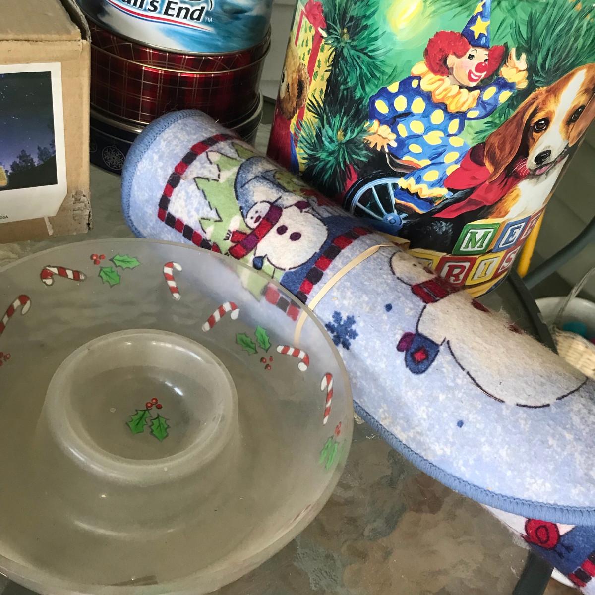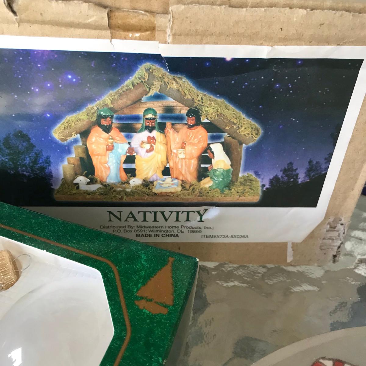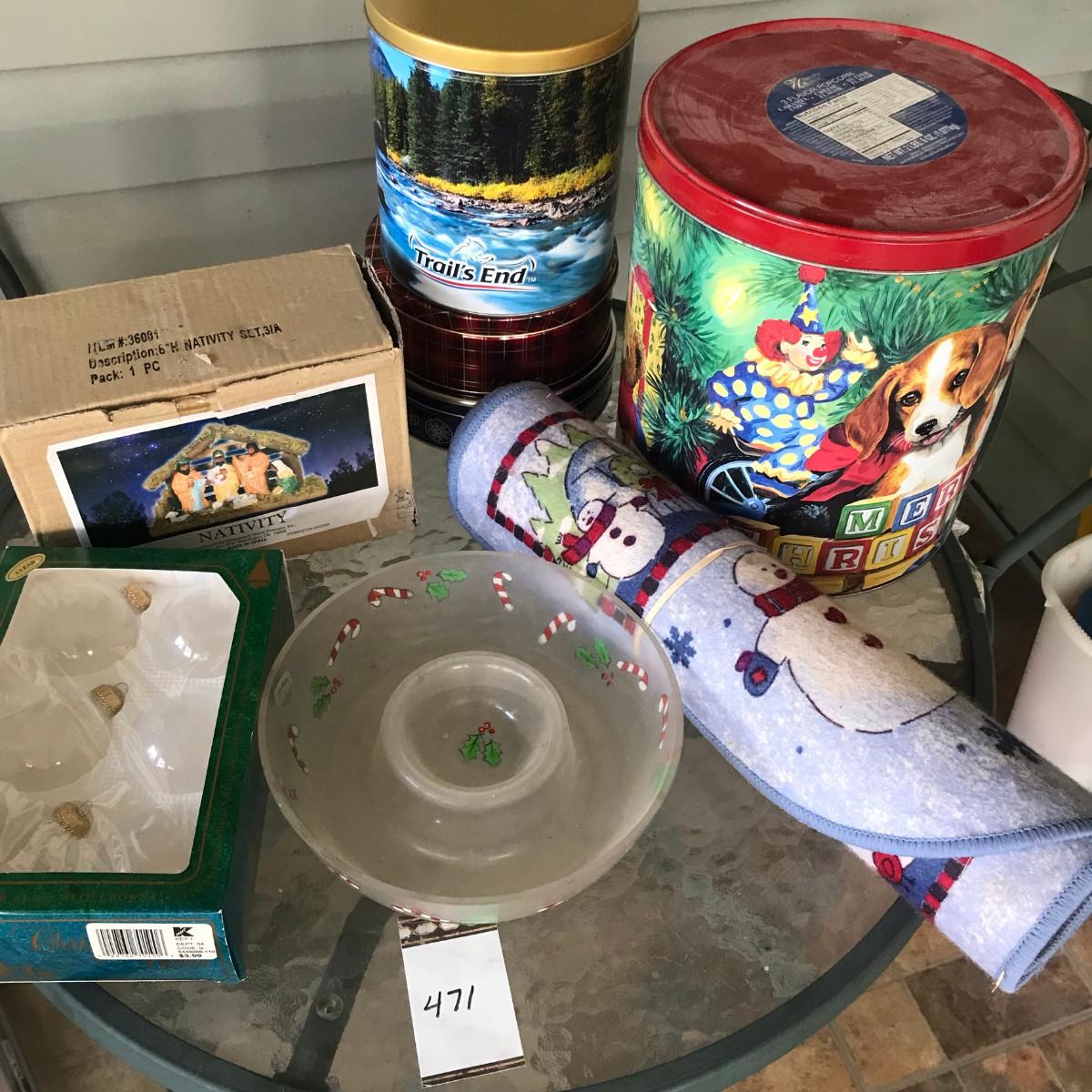 Tins, ornaments, nativity set, chip & dip, & welcome mat