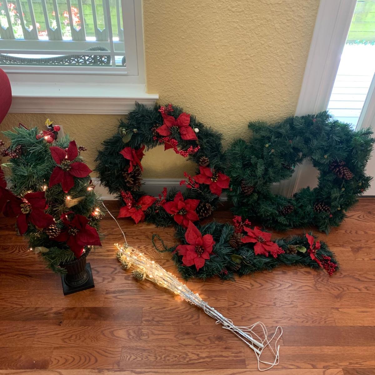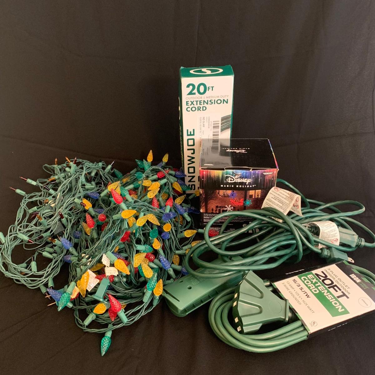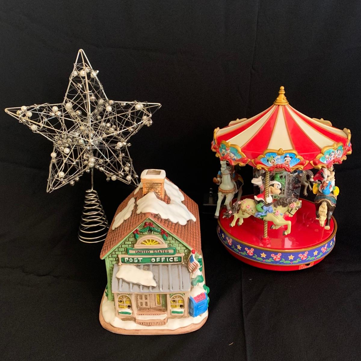Lot includes two wreaths, small decorative Christmas tree with lights, three 20ft extension cords, Disney Christmas Carousel, Lefton Post Office lamp, table linens, Christmas tree toppers, and two strands of Christmas lights. Lights and carousel power on when plugged in. Please note, Lefton Post Office does not include light or power cord. Local pickup only.