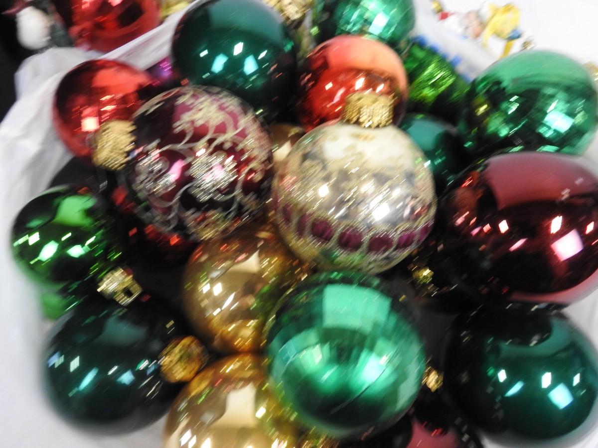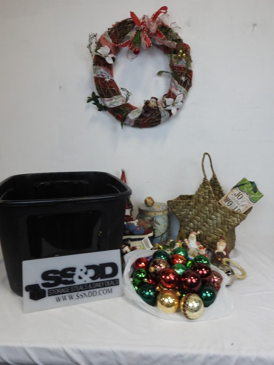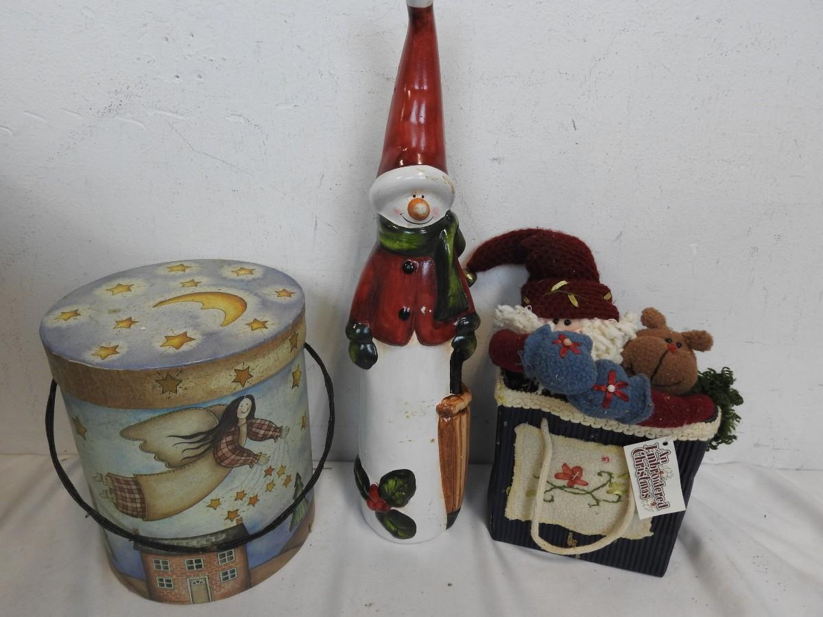Christmas Decor w/Tote, Wicker Star Basket, Wreath, Snowman, Santas, Ball Ornaments, Gift Box
