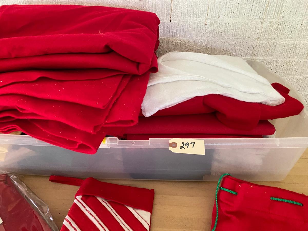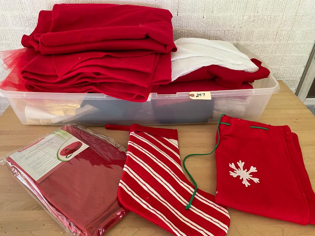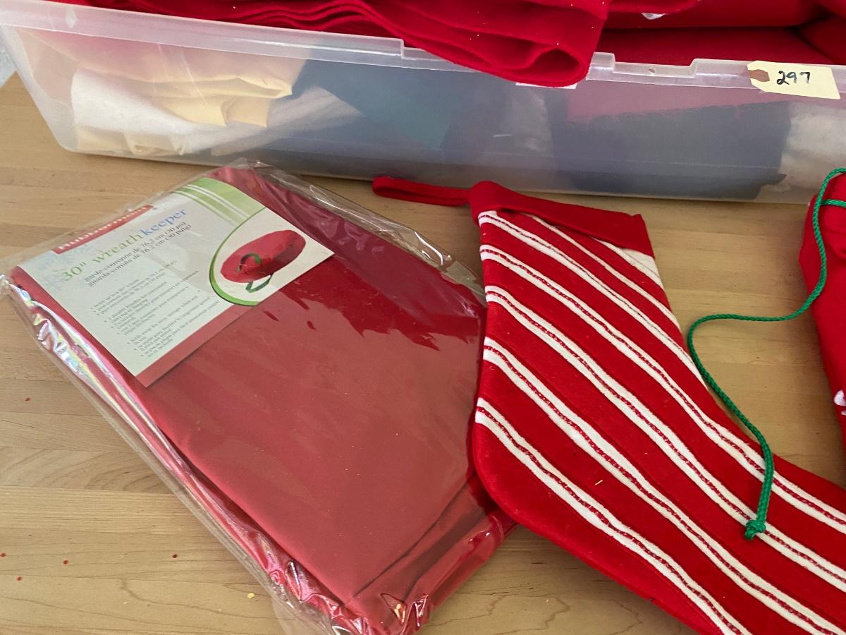 Christmas Decorating Lot Includes Red Felt, Wreath Keeper Bag, Stockings As Pictured
