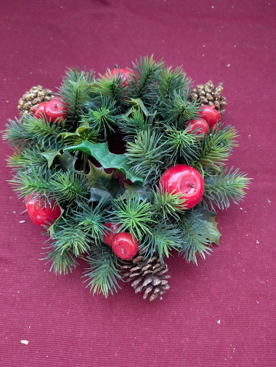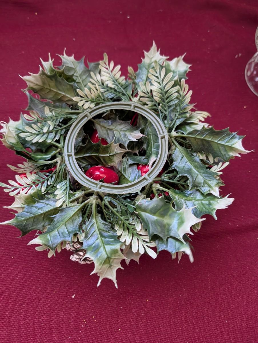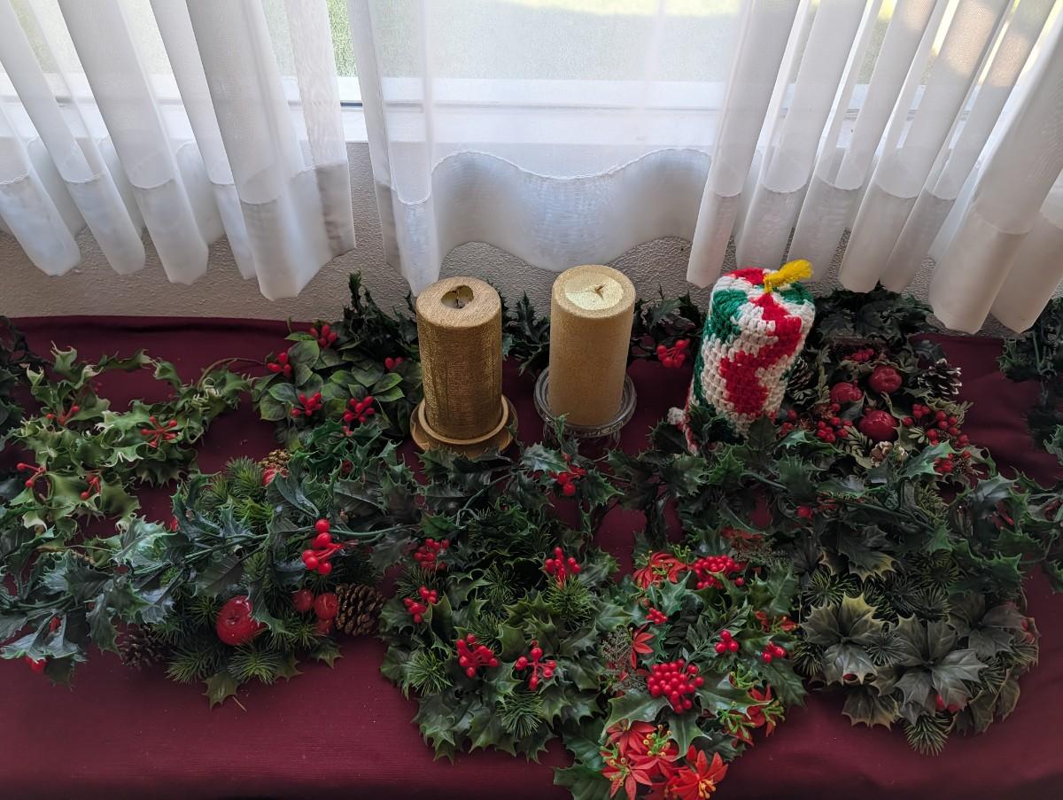 A vintage group of Christmas decorations pillar candles Holly Garland several candle wraps with fake pine cones and berries