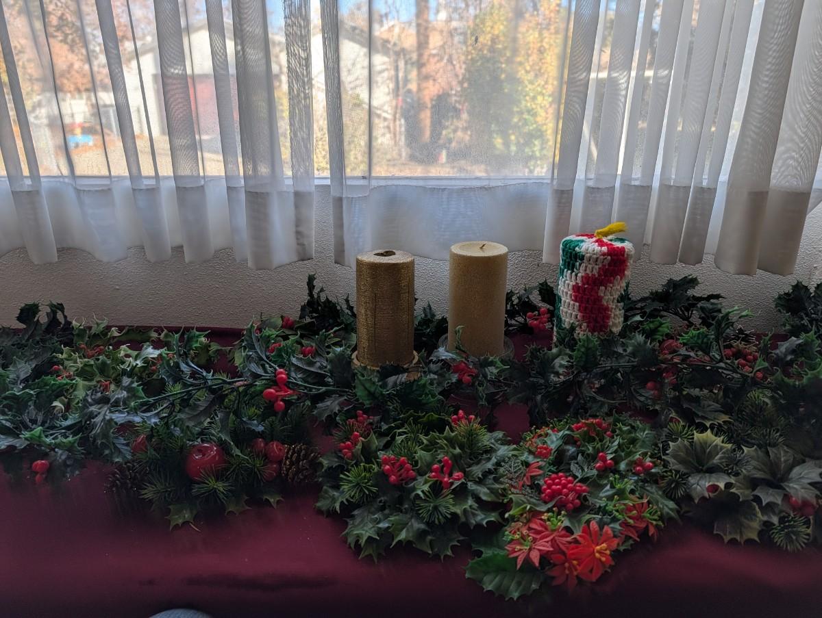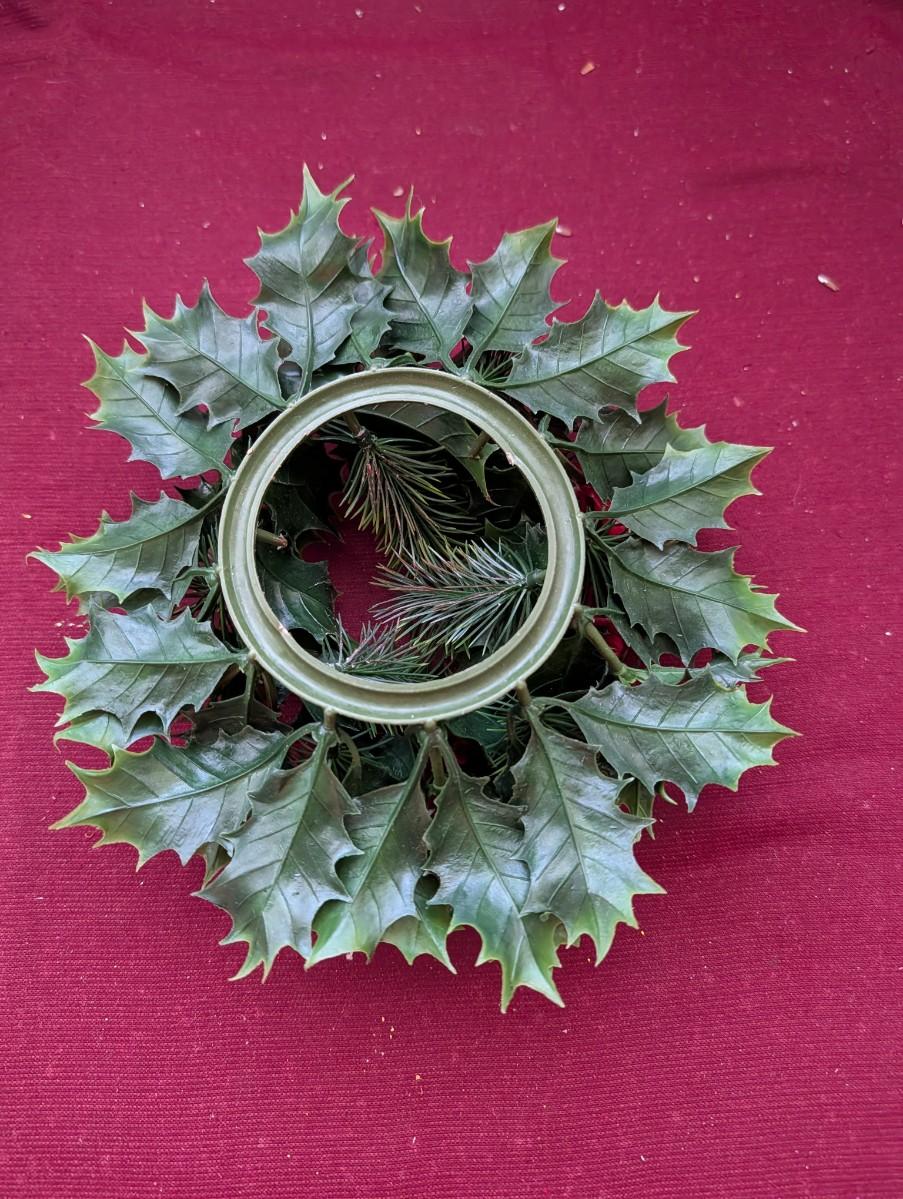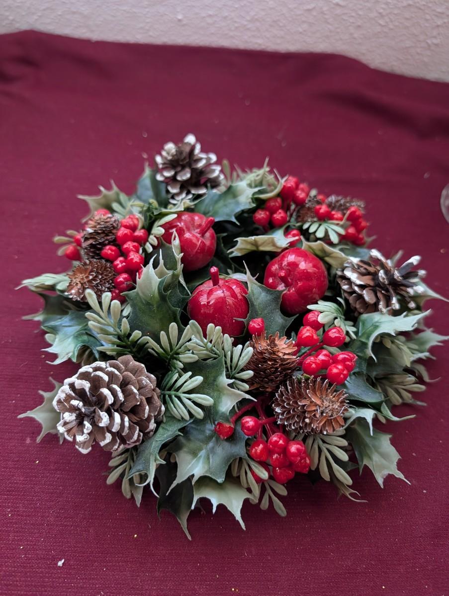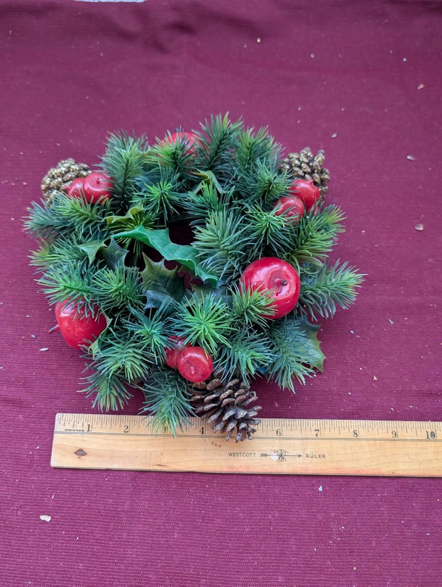 A vintage group of Christmas decorations pillar candles Holly Garland several candle wraps with fake pine cones and berries