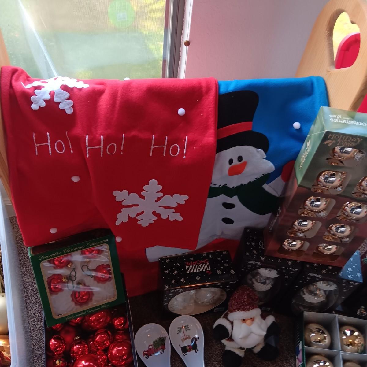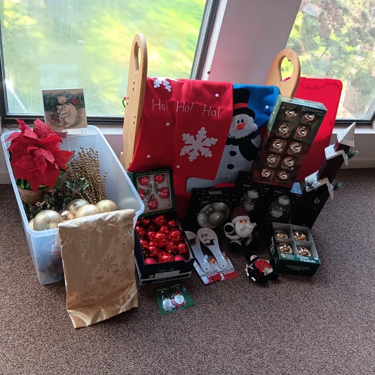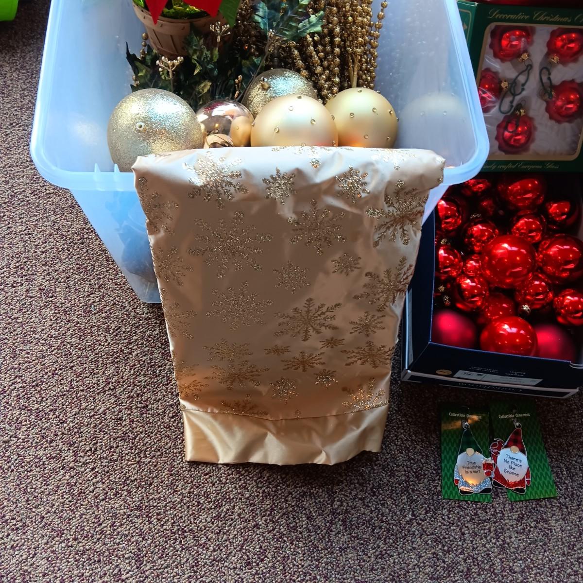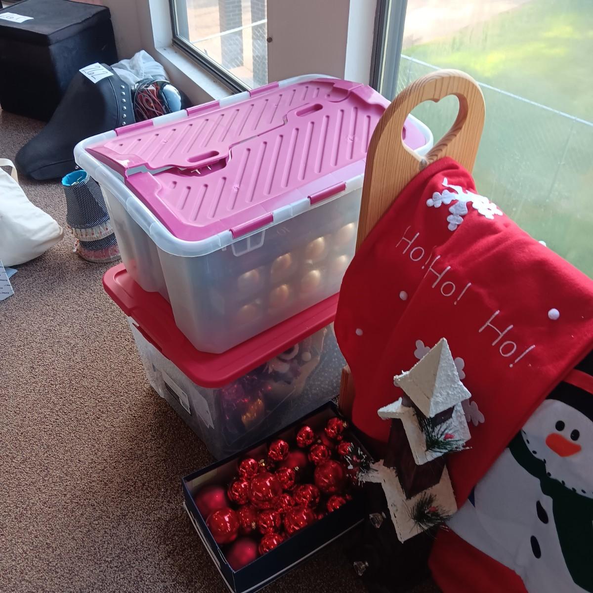 CHRISTMAS DECORATIONS, 2 TOTES AND AN AFGHAN HOLDER