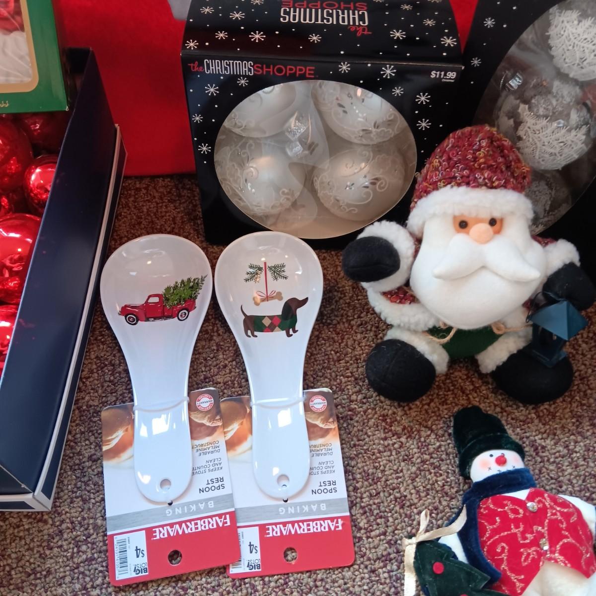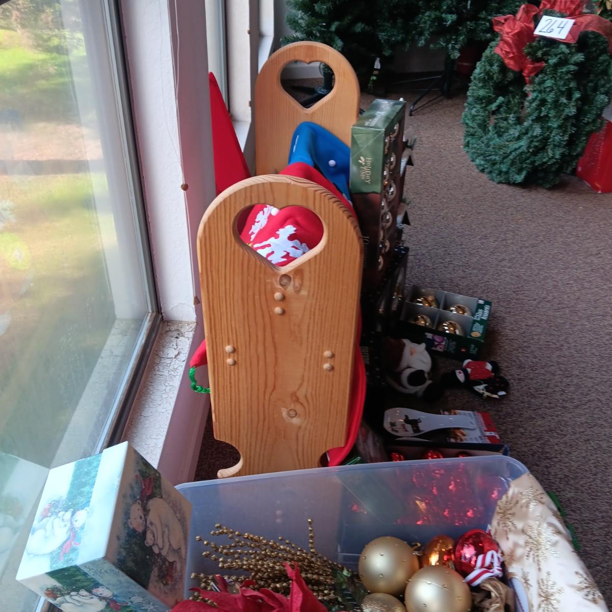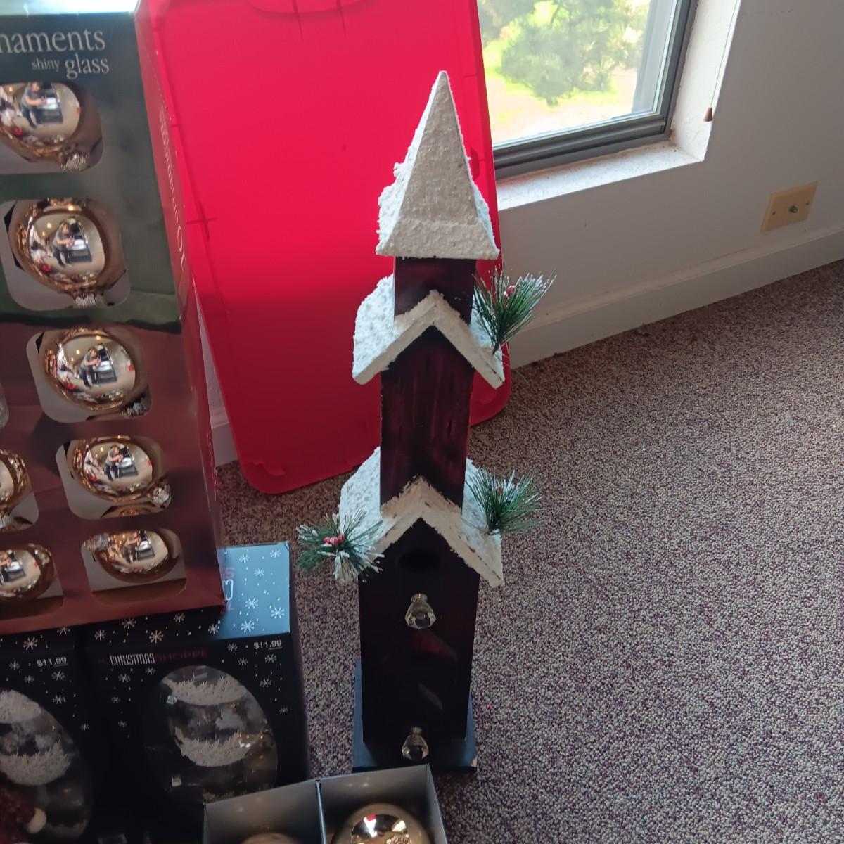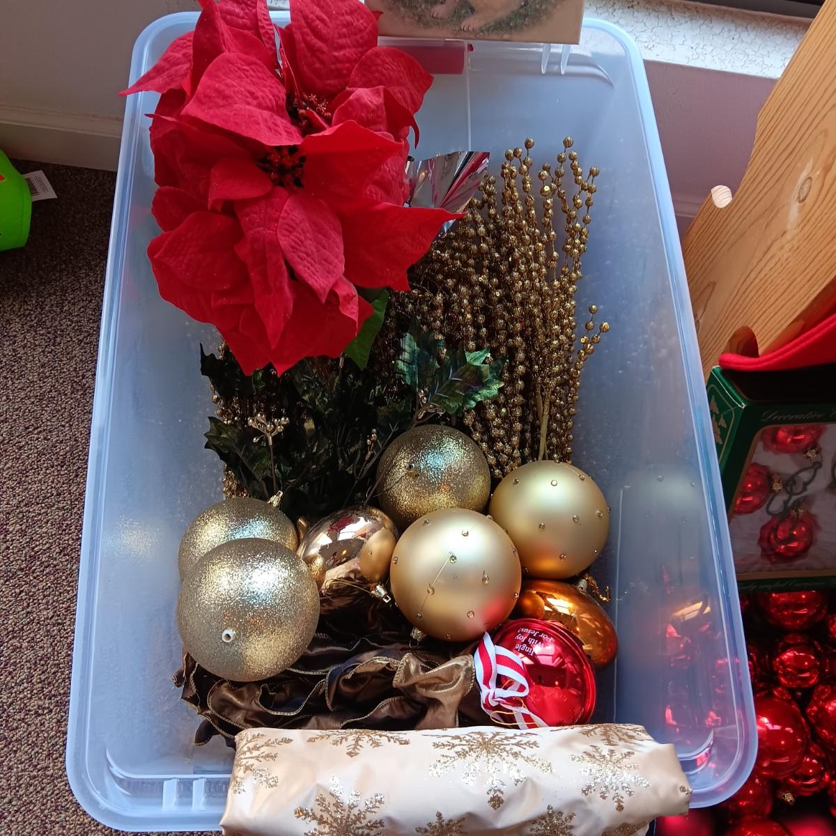CHRISTMAS DECORATIONS, 2 TOTES AND AN AFGHAN HOLDER